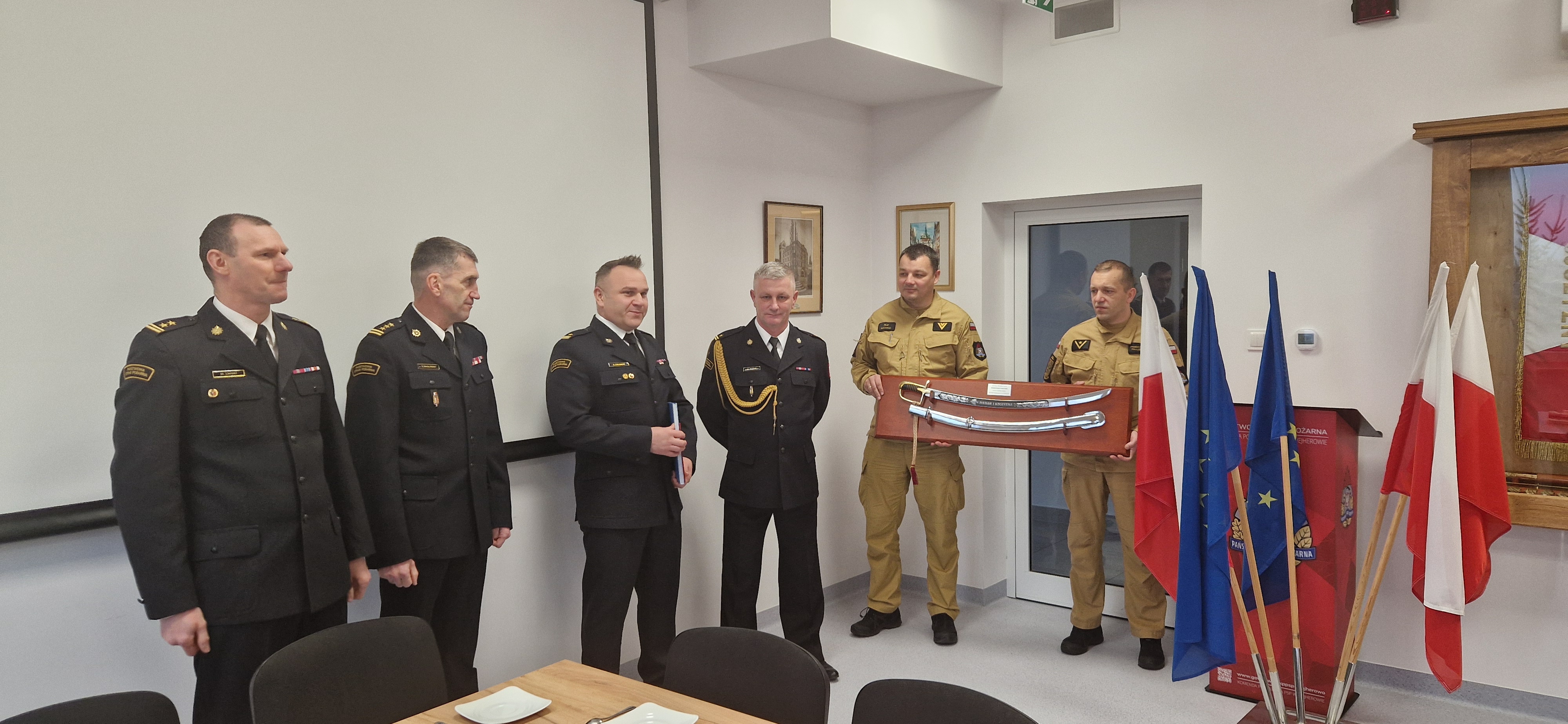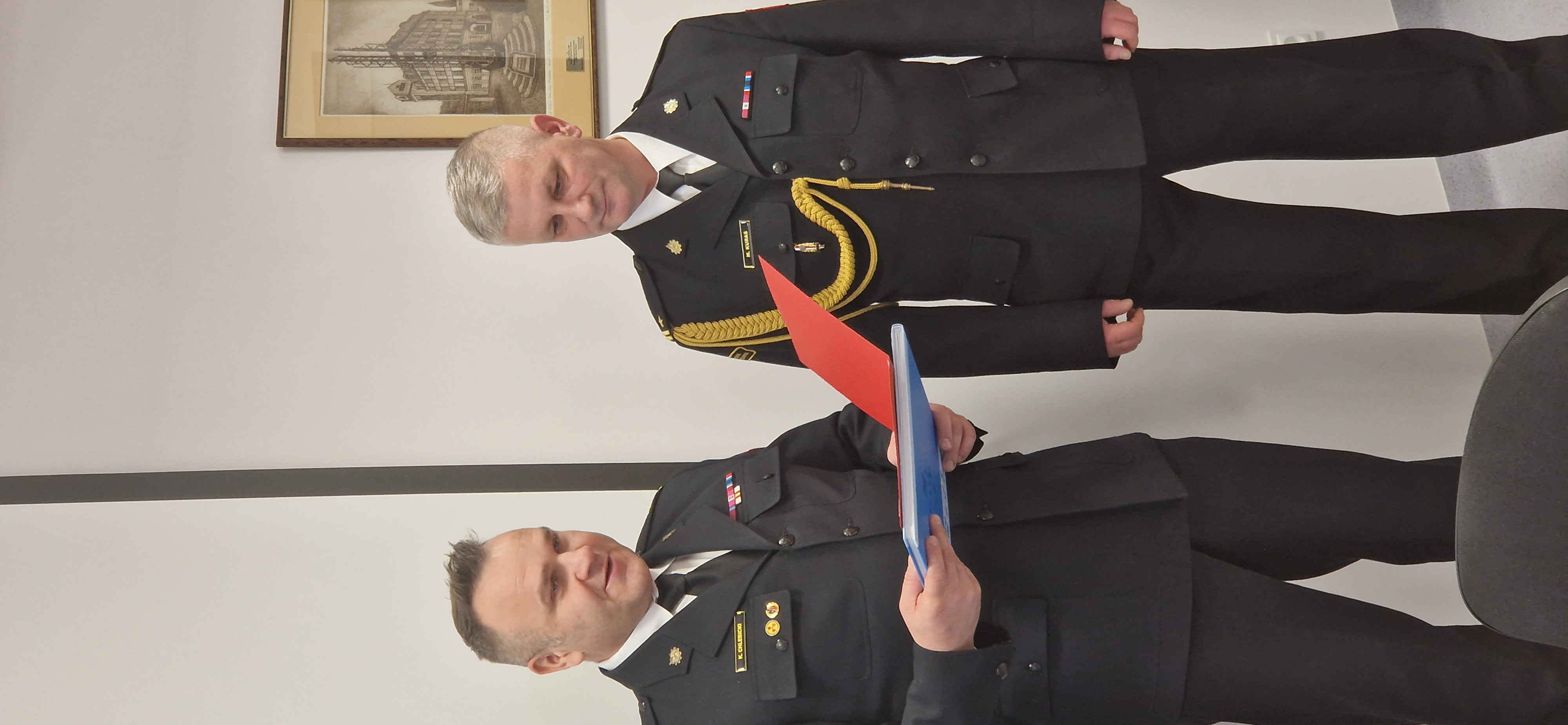 Na zakończenie uroczystego pożegnania Komendant Powiaotwy mł. bryg. Krzysztof Chlebicki, Z-ca Komendanta Powiatowego st. bryg. Tomasz Zwoliński, Z-ca Komendanta Powiatowego bryg. Marek Lniski wraz z koleżankami, kolegami i pracownikami komendy powiatowej podziękowali mł. bryg. Mirosławowi Kuraś za wspólne lata służby i złożyli życzenia pomyślności i samych sukcesów w życiu prywatnym.
