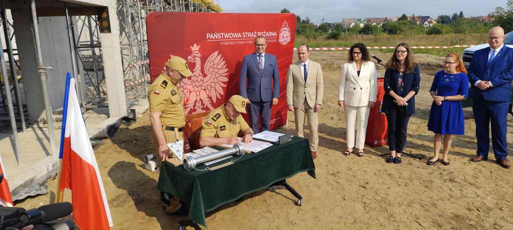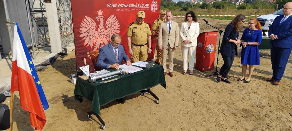 Uroczystość podpisania i wmurowania aktu erekcyjnego pod budowę Jednostki Ratowniczo Gaśniczej nr 2 w Rumi