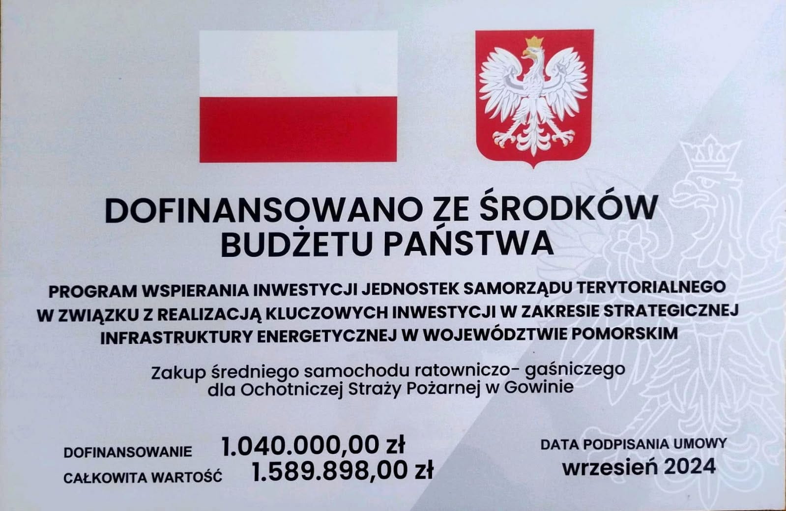 Jednostka Ochotniczej Straży Pożarnej w Gowinie otrzymała nowy średni samochód ratowniczo-gaśniczy GBA 4,5/36,2/4,4 SCANIA P370, zbiornikiem wody 4500 litrów. Łączny koszt zakupu pojazdu to 1 589 898 zł.