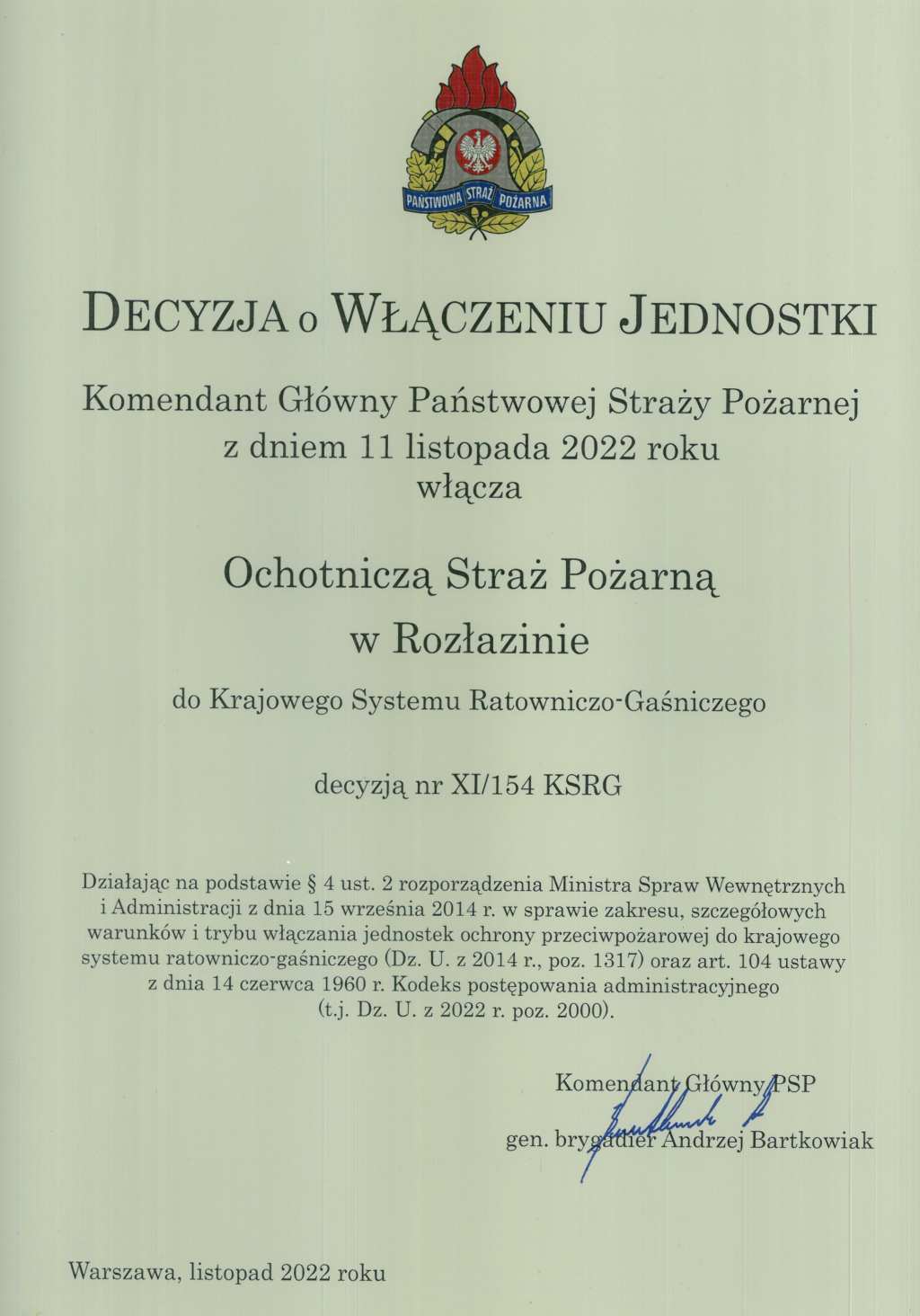 W trakcie uroczystości zastępca pomorskiego komendanta wojewódzkiego PSP bryg. Wojciech Berent wraz z komendantem powiatowym PSP w Wejherowie st. bryg. Jacek Niewęgłowski wręczyli druhowi Patrykowi Proń Decyzję komendanta głównego PSP o włączeniu jednostki OSP Rozłazino do krajowego systemu ratowniczo - gaśniczego.