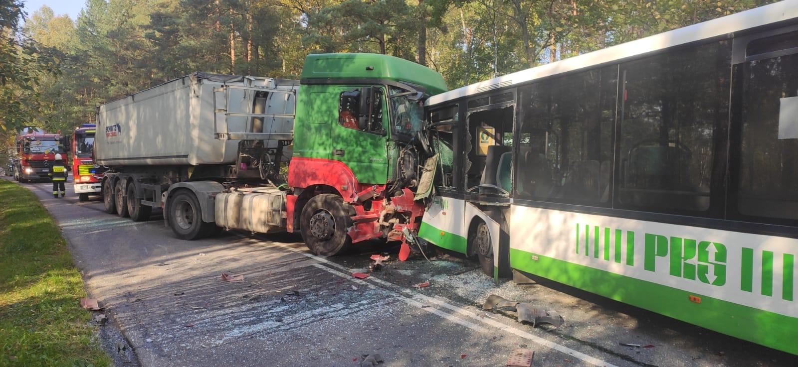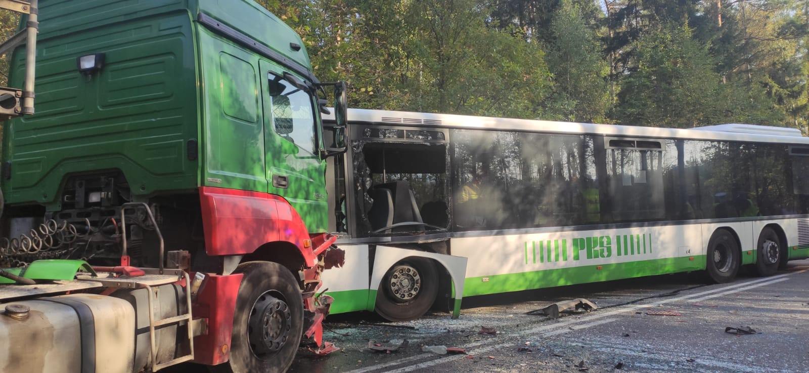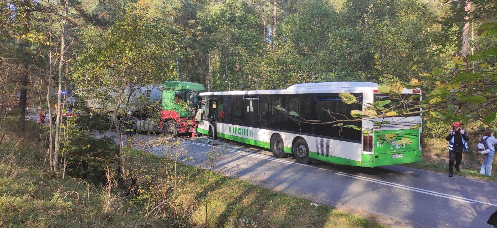 Na miejscu zdarzenia ratownicy zastali zdarzenie drogowe z udziałem autobusu, auta ciężarowego i busa. Pojazdami łącznie poróżowało 23 osoby. W wyniku wypadku poszkodowane zostały 2 osoby podróżujące autobusem. Ratownicy zabezpieczyli miejsce zdarzenia i przystąpili do udzielania pierwszej pomocy medycznej poszkodowanym. Po przybyciu Zespołów Ratownictwa Medycznego 2 osoby poszkodowane przekazano ratownikom medycznym. Dalsze czynności na miejscu zdarzenia prowadzili funkcjonariusze Policji.