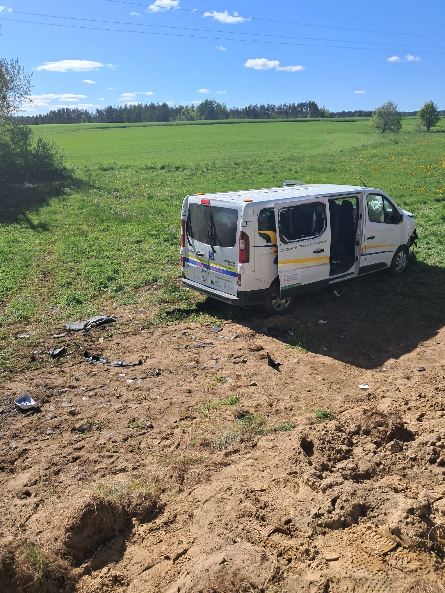 Na miejscu zdarzenia strażacy zastali samochód Renault Trafic po uderzeniu w betonowy słup energetyczny. Auto stało na kołach na przydrożnej łące około 5m od jezdni. Pojazdem podróżowało łącznie 9 osób - z przodu pojazdu kierowca oraz pasażerka, z tyłu pojazdu łącznie 7 osób w tym 3 dzieci. Ratownicy zabezpieczyli miejsce zdarzenia i przystąpili do udzielania pierwszej pomocy medycznej poszkodowanym. Po przybyciu Zespołów Ratownictwa osoby poszkodowane przekazano ratownikom medycznym. Ze względu na odniesione obrażenia 5 osoób wymagało przetransportowania do szpitali. Dalsze czynności na miejscu zdarzenia prowadzili funkcjonariusze Policji.
