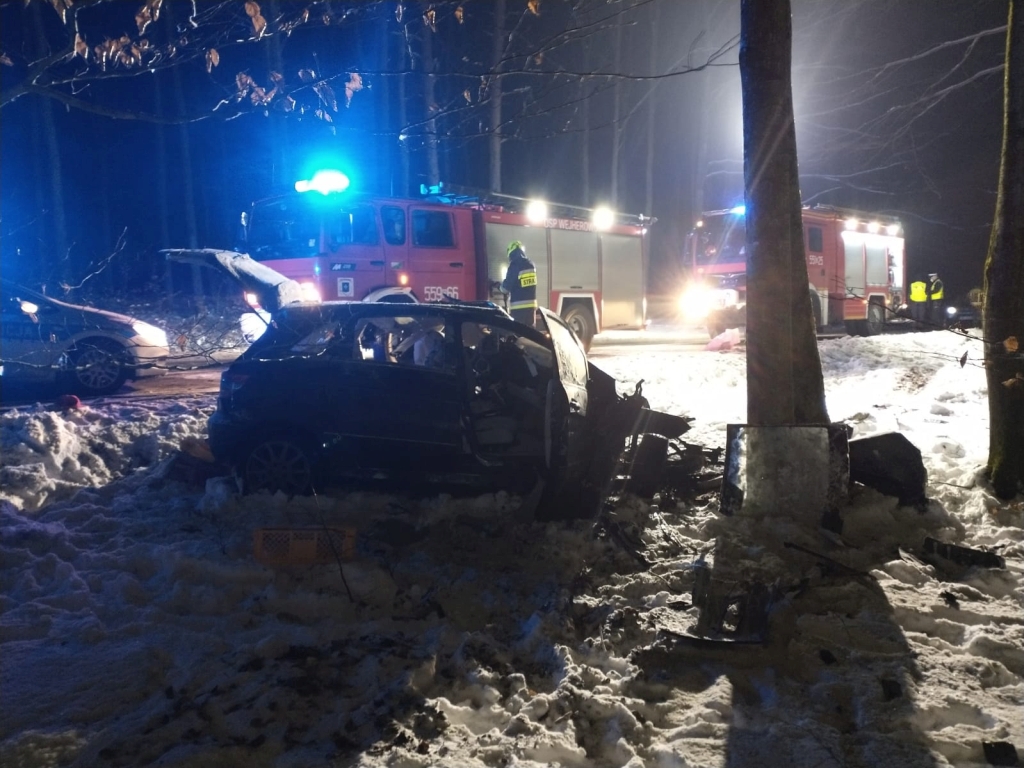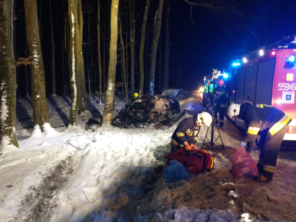 Na miejscu zdarzenia ratownicy zastali poza jezdnią samochód osobowy po uderzeniu w drzewa rosnące przy drodze wojewódzkiej nr 218. W wyniku wypadku poszkodowany został kierujący pojazdem. Ratownicy zabezpieczyli miejsce zdarzenia i przystąpili do udzielania pierwszej pomocy medycznej poszkodowanemu. W celu wykonania dostępu i ewakuacji poszkodowanego z rozbitego pojazdu konieczne było użycie hydraulicznych narzędzi ratowniczych. Strażacy ze względu na brak funkcji życiowych przystąpili do resustytacji z użyciem AED. Po przybyciu Zespołu Ratownictwa Medycznego poszkodowanego przekazano ratownikom medycznym. Ze względu na obrażenia jakich doznał kierujący pojazdem i prowadzoną resustytację na miejsce zdarzenia zadysponowany został śmigłowiec Lotniczego Pogotowia Ratunkowego. Niestety mimo długotrwałej resustytacji, kierujący pojazdem w wyniku poniesionych obrażeń poniósł śmieć w tym wypadku. Dalsze czynności na miejscu zdarzenia prowadzili funkcjonariusze Policji.