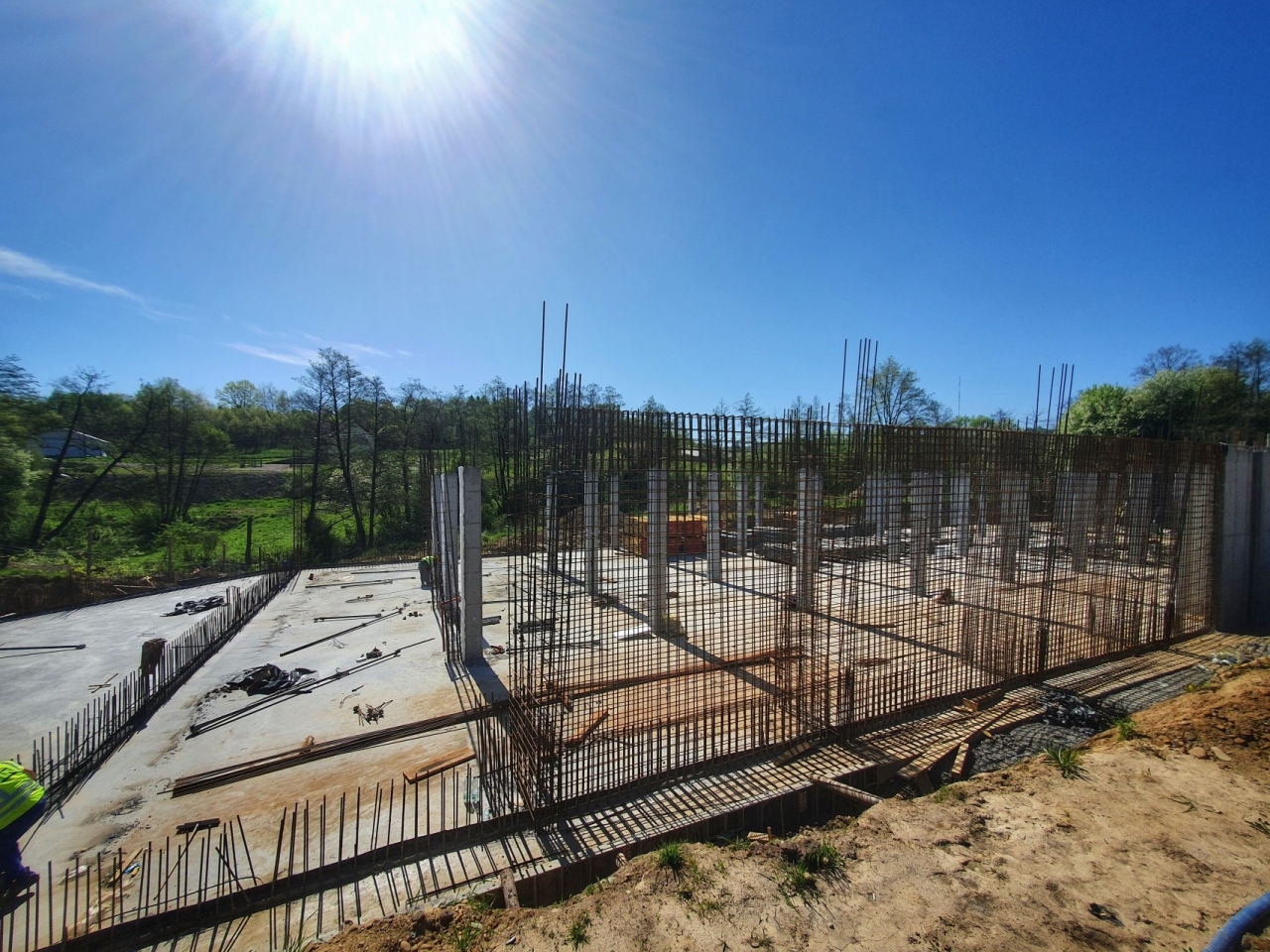 Trwa wykonywanie ścian i słupów magazynu przeciwpowodziowego (zbrojenie, szalowanie).