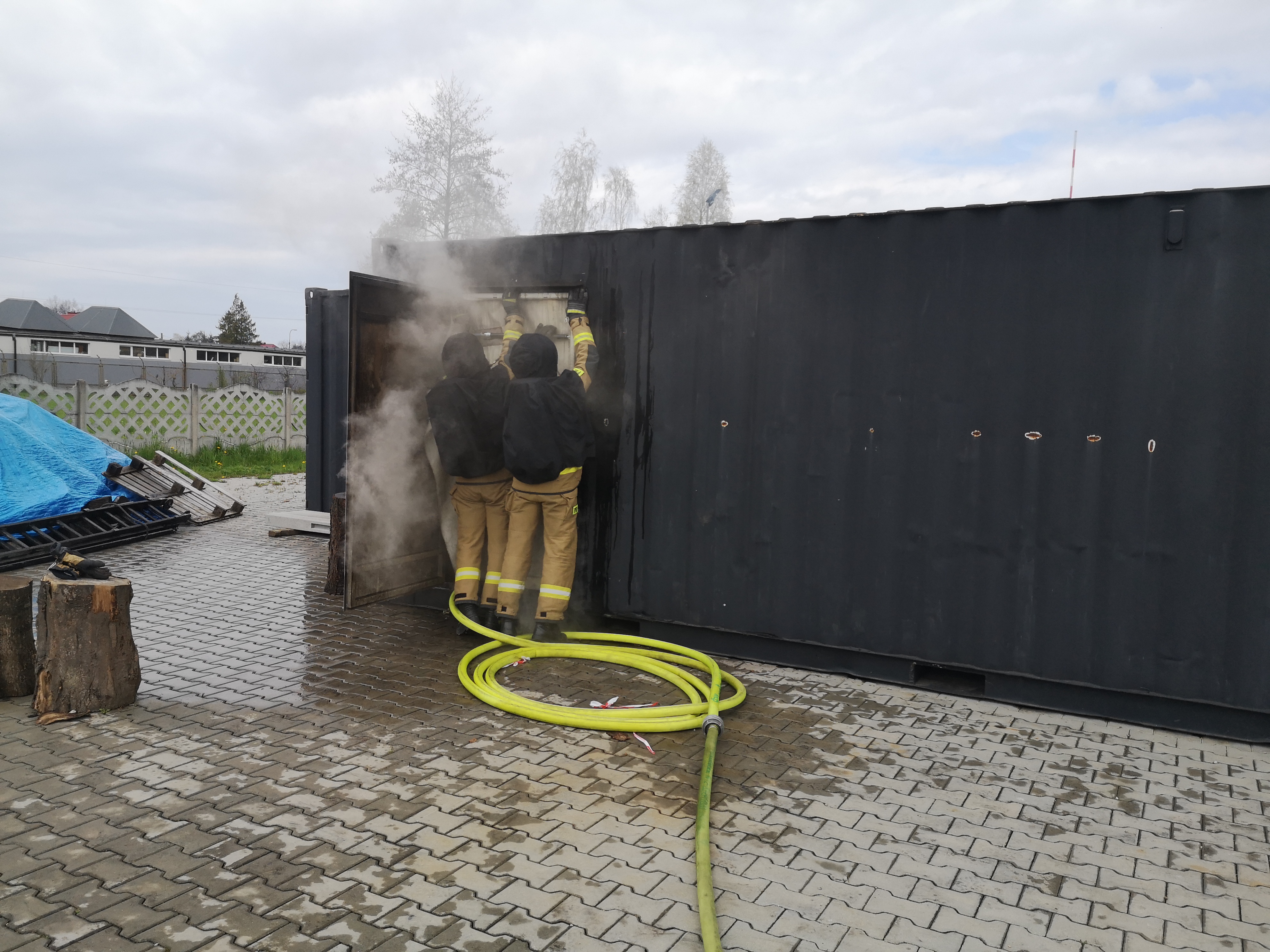 Ćwiczenia JRG w kontenerze ogniowym z zakresu gaszenia pożarów wewnętrznych