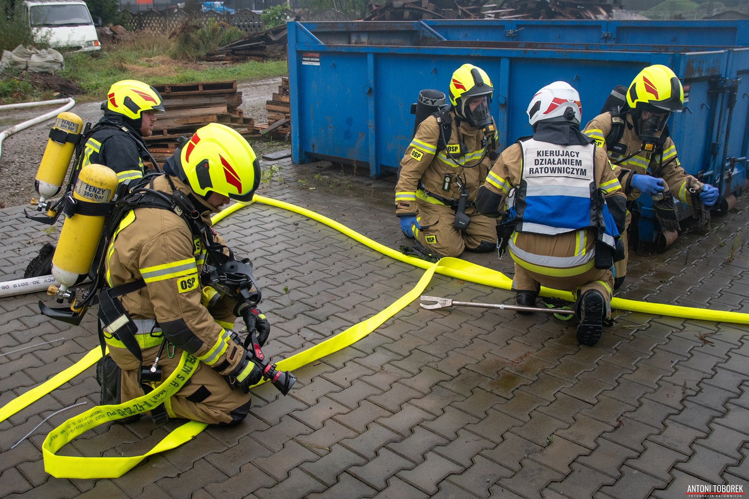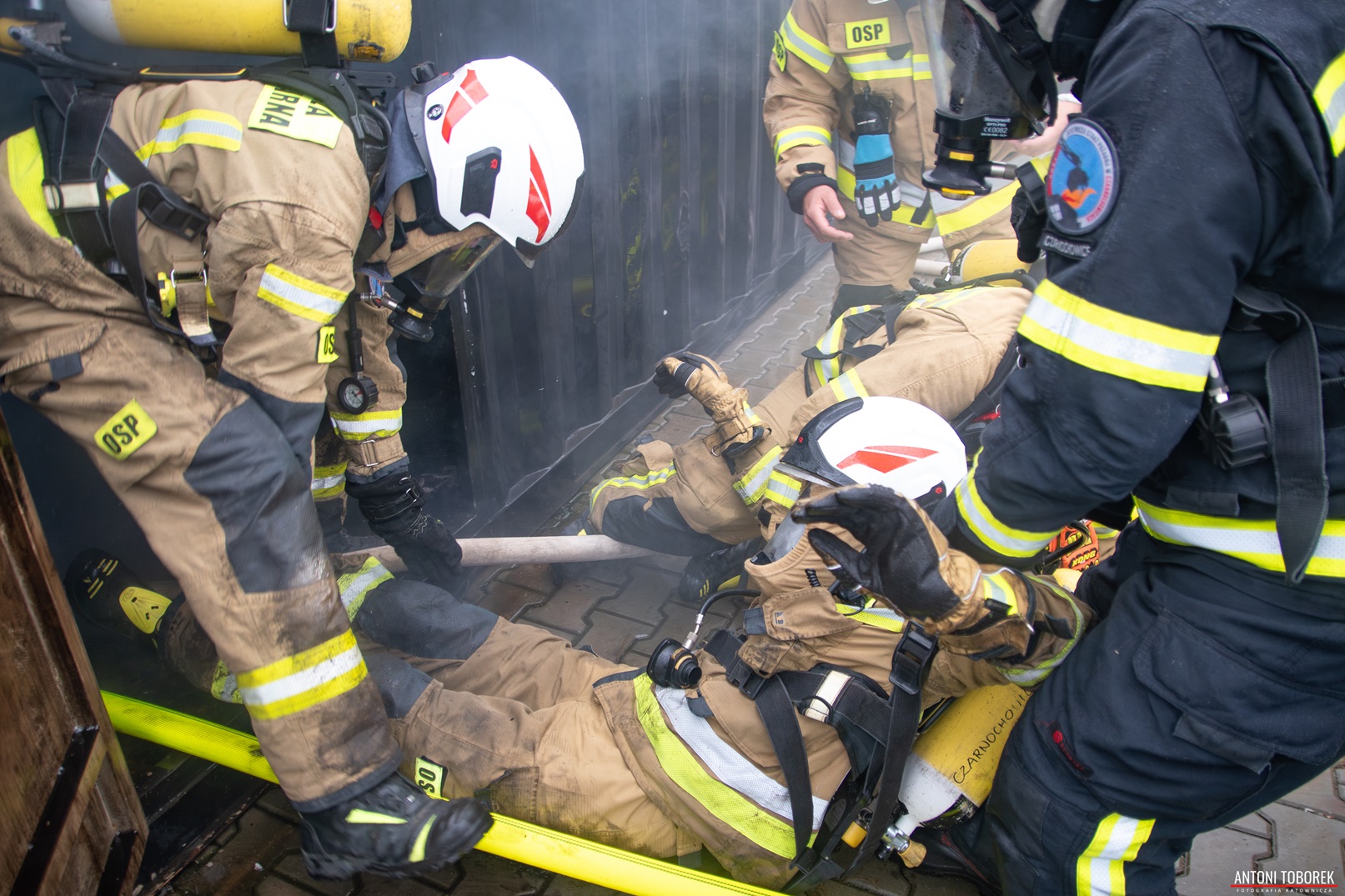 „Płonąca pułapka” W trakcie prowadzonych działań ratowniczo-gaśniczych dochodzi do wypadku strażaka. Sterta palet spada na ratownika doprowadzając do uszkodzenia maski twarzowej.