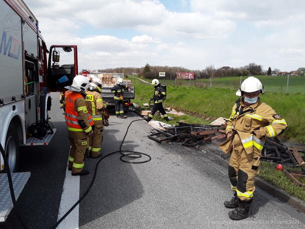 26.04.2021 r. na autostradzie A4 (439km) w kierunku Krakowa, doszło do pożaru transportowanego materiału w samochodzie dostawczym. Zgłoszenie początkowo dotyczyło pożaru samochodu dostawczego. Po przybyciu na miejsce zdarzenia pierwszego zastępu straży pożarnej, stwierdzono pożar przewożonych zestawów ogrodowych konstrukcji drewnianej. Ruch na A4 w kierunku Krakowa odbywał się bez większych utrudnień, gdyż zdarzenie miało miejsce na pasie awaryjnym. Kierowca pojazdu samodzielnie rozpoczął gaszenie pożaru przy użyciu gaśnicy i usunął płonące elementy z pojazdu, uniemożliwiając rozwój pożaru. Działania straży pożarnej polegały głównie na zabezpieczeniu miejsca prowadzonych działań oraz dogaszeniu pożaru.