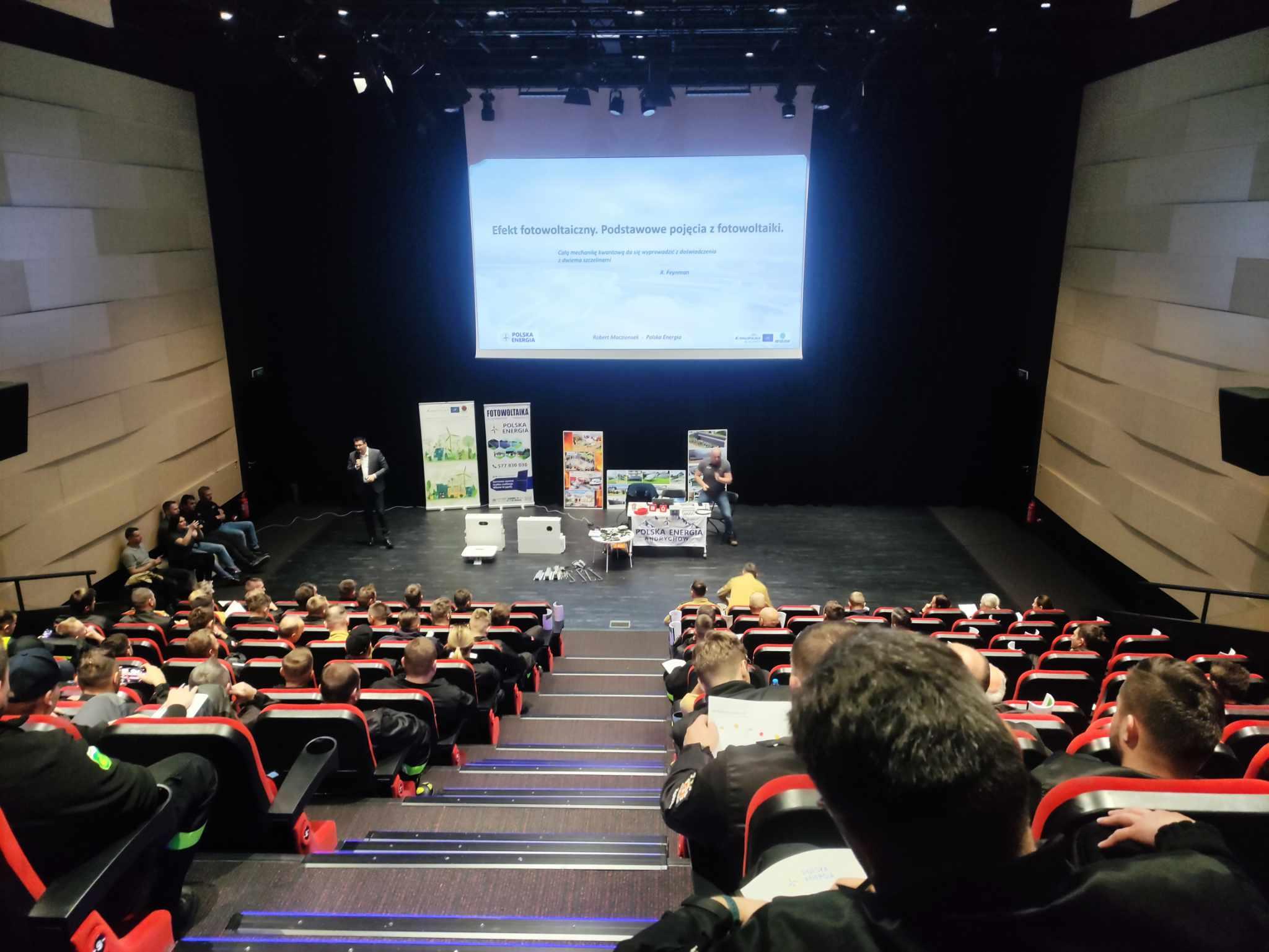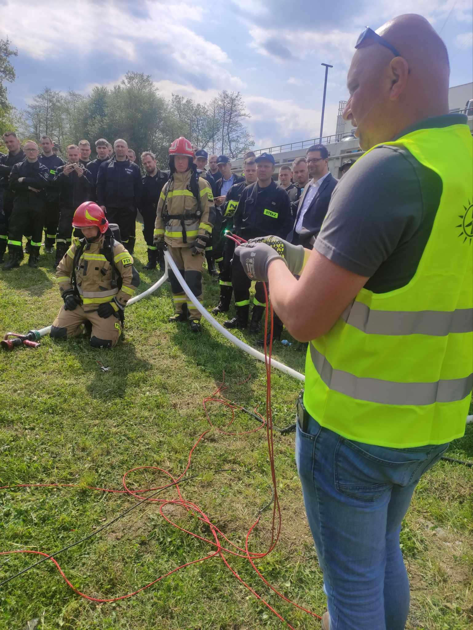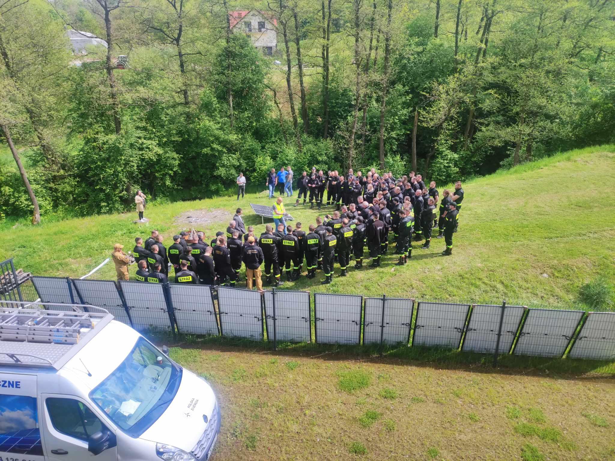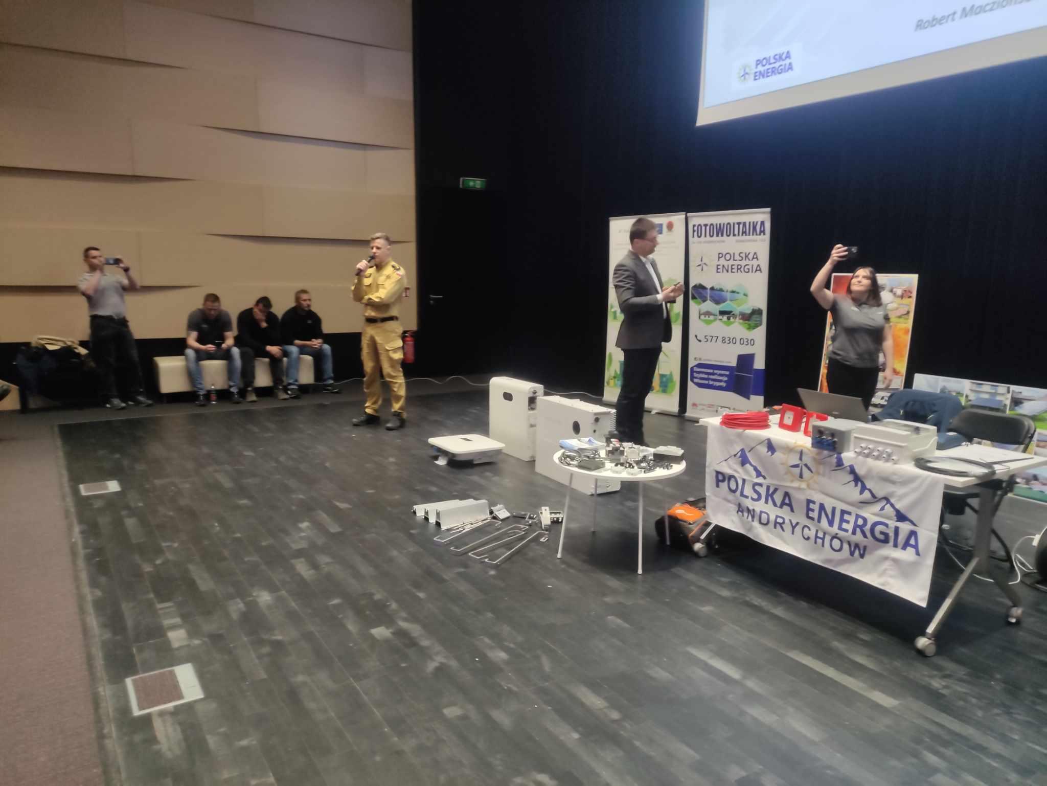 W dniu 27 kwietnia br. odbyły się warsztaty edukacyjno-informacyjne dla strażaków z Komendy Powiatowej Państwowej Straży Pożarnej w Wieliczce oraz strażaków Ochotniczych Straży Pożarnych z terenu powiatu wielickiego z zakresu instalacji fotowoltaicznych i gaszenia pożarów tych instalacji w ramach Projektu LIFE-IP EKOMAŁOPOLSKA „Wdrażanie Regionalnego Planu Działań dla Klimatu i Energii dla województwa małopolskiego” przeprowadzone przez firmę POLSKA ENERGIA z Andrychowa. Warsztaty obejmowały część teoretyczną, która została przeprowadzona w sali kinowej wielickiej Mediateki i obejmowała min. zagadnienia: efekt fotowoltaiczny, budowa i elementy systemu PV, jak działa falownik – zagrożenia i metody postępowania, uzgodnienia ppoż instalacji fotowoltaicznych, podstawowe błędy montażowe, postepowania w przypadku pożaru, czym gasić instalacje PV, zasilanie samochodów elektrycznych, gaszenie pożarów samochodów elektrycznych. Po części teoretycznej uczestnicy warsztatów przenieśli się na plac zewnętrzny wielickiej komendy gdzie pracownicy firmy POLSKA ENERGIA przygotowali prezentację elementów składowych instalacji fotowoltaicznych, zaprezentowano powstawanie łuku elektrycznego. Na koniec zaprezentowano próbę zapalenia instalacji fotowoltaicznej oraz gaszenie instalacji będącej pod napięciem.