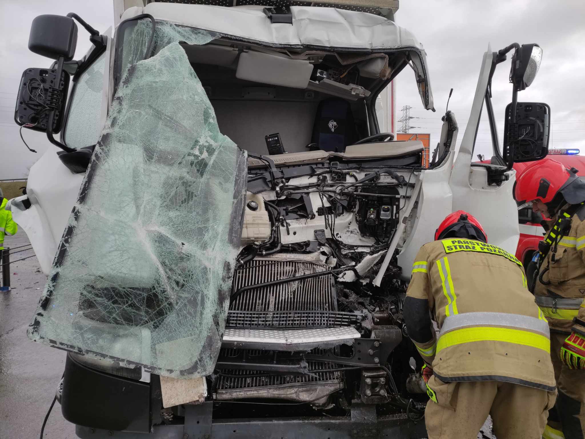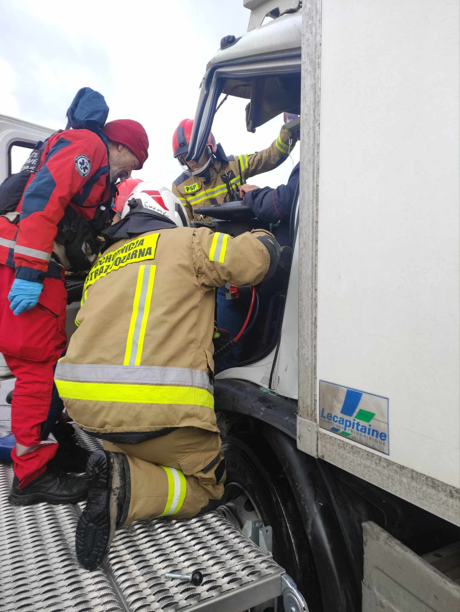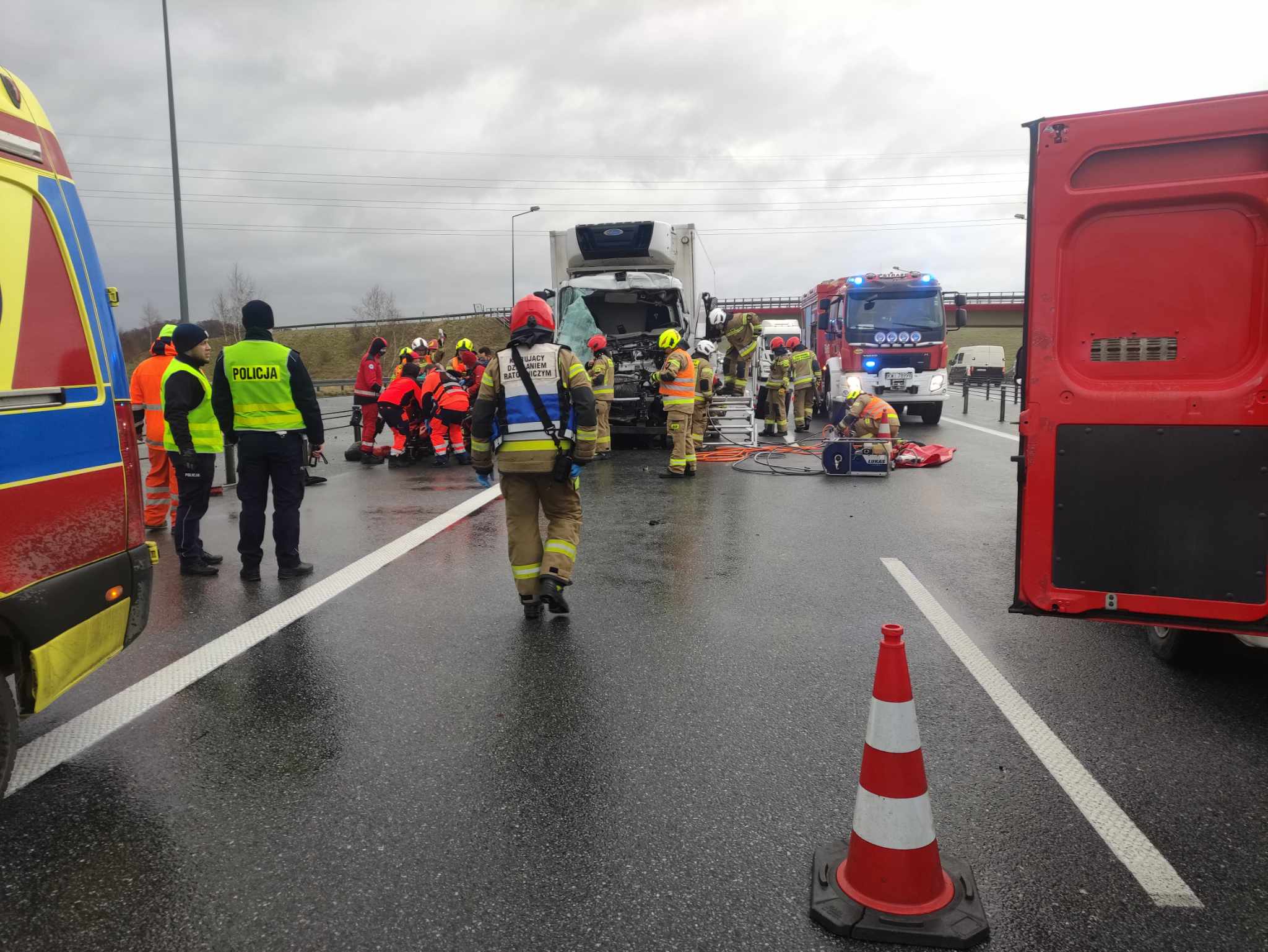 W dniu 05.02.2024 roku o godzinie 08:06 do Stanowiska Kierowania Komendanta Powiatowego Państwowej Straży Pożarnej w Wieliczce wpłynęło zgłoszenie o zderzeniu dwóch samochodów ciężarowych na 437 km autostrady A4 w kierunku Krakowa. Do zdarzenia zadysponowano zastępy z OSP Kłaj, OSP Staniątki i JRG Wieliczka. Po przybyciu na miejsce zdarzenia stwierdzono, jak w zgłoszeniu zderzenie dwóch samochodów ciężarowych. Dodatkowo jednak czego nie było w zgłoszeniu, strażacy zastali na miejscu uwięzioną osobę, kierowcę w jednym z samochodów ciężarowych. Osoba przytomna, nie była w stanie opuścić samochodu ciężarowego, ze względu na uszkodzenie kabiny pojazdu i zablokowanie w pozycji siedzącej. Na miejscu zdarzenia przed przybyciem Straży Pożarnej obecny naziemny ZRM oraz Lotnicze Pogotowie Ratunkowe. Ratownicy również nie byli w stanie uwolnić i ewakuować osoby poszkodowanej. Prowadzone działania polegały przede wszystkim na jednoczesnym zaopatrywaniu medycznym osoby poszkodowanej przez ratowników medycznych oraz wykonywaniu dostępu do uwięzionego kierowcy przez strażaków. Przy użyciu sprzętu hydraulicznego i określonych technik ratowniczych osoba poszkodowana została ewakuowana z pojazdu i przekazana pod opiekę ratownikom medycznym. Poszkodowany został zabrany karetką do Szpitalnego Oddziału Ratunkowego. Na miejscu swoje działania prowadziła Policja oraz Obsługa Autostrady.