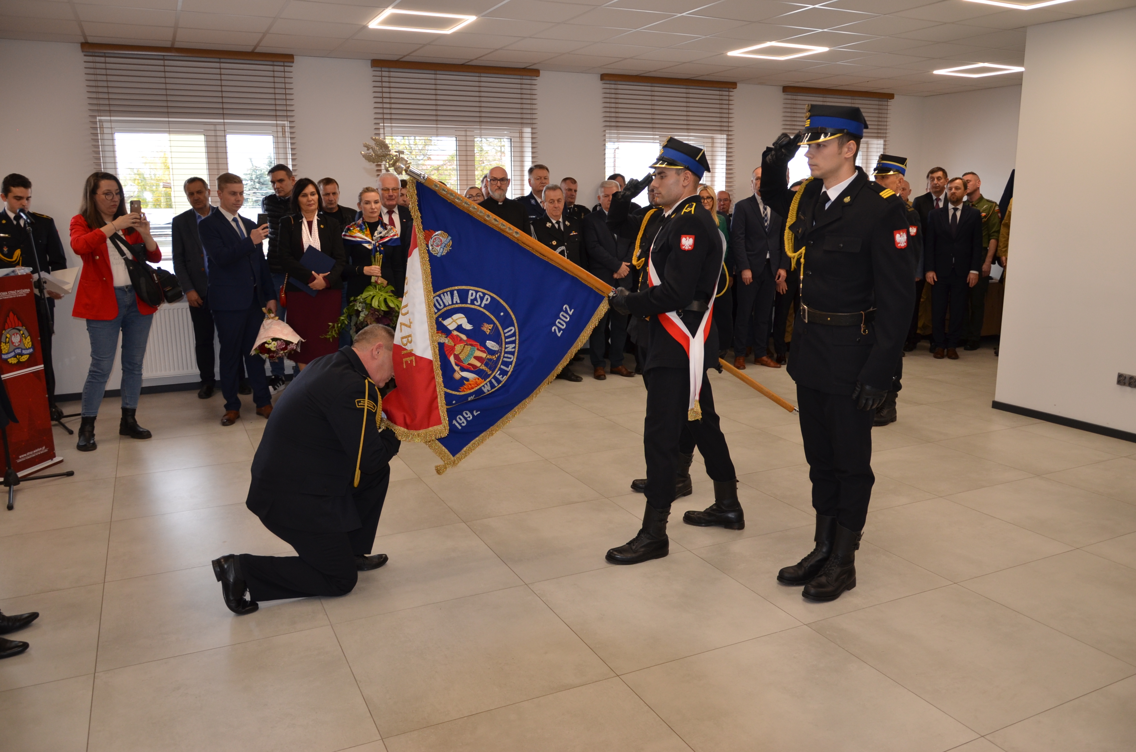 W dalszej części nastąpił kulminacyjny moment zbiórki – bryg. Piotr Gzik oddał honor sztandarowi Komendy Powiatowej PSP w Wieluniu, ucałował płat sztandaru, a następnie złożył meldunek Zastępcy Łódzkiego Komendanta Wojewódzkiego PSP w Łodzi st. bryg. Mariuszowi Wojcieszko o objęciu obowiązków Komendanta Powiatowego PSP w Wieluniu .