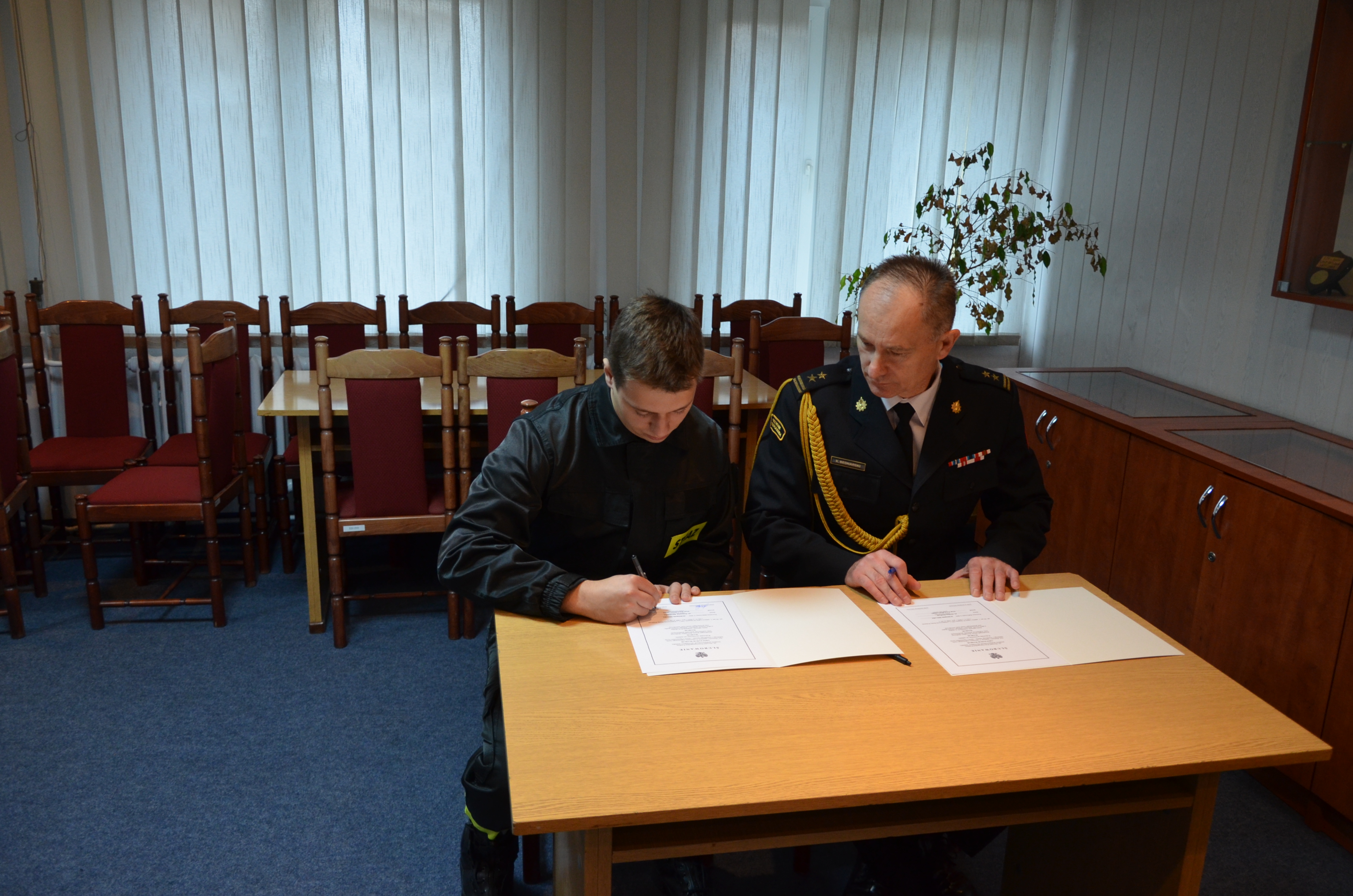 Ja, obywatel Rzeczypospolitej Polskiej, świadom podejmowanych obowiązków strażaka, uroczyście ślubuję być ofiarnym i mężnym w ratowaniu zagrożonego życia ludzkiego i wszelkiego mienia nawet z narażeniem życia. Wykonując powierzone mi zadania, ślubuję przestrzegać prawa, dyscypliny służbowej oraz wykonywać polecenia przełożonych. Ślubuję strzec tajemnicy państwowej i służbowej, a także honoru, godności i dobrego imienia służby oraz przestrzegać zasad etyki zawodowej.