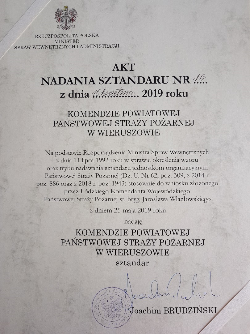 25 maja 2019 r. na podstawie Aktu nadania sztandaru Nr 10 z dnia 16 kwietnia 2019 r. Komendzie Powiatowej Państwowej Straży Pożarnej w Wieruszowie został nadany sztandar.