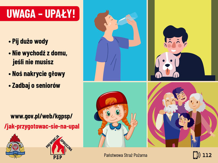 Upał to stan pogody, gdy temperatura powietrza przy powierzchni ziemi przekracza 30°C. W związku z utrzymującymi się oraz prognozowanymi także na kolejne dni przez Instytut Meteorologii i Gospodarki Wodnej Państwowy Instytut Badawczy upałami z temperaturą maksymalną powyżej 34°C należy uważać, aby w gorące dni wysokie temperatury nie wpłynęły na nasze zdrowie i samopoczucie. W szczególności należy pamiętać że: