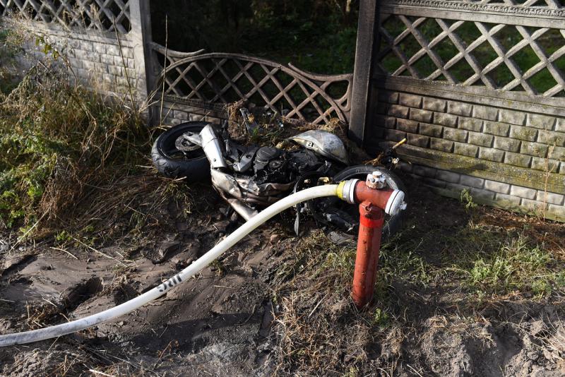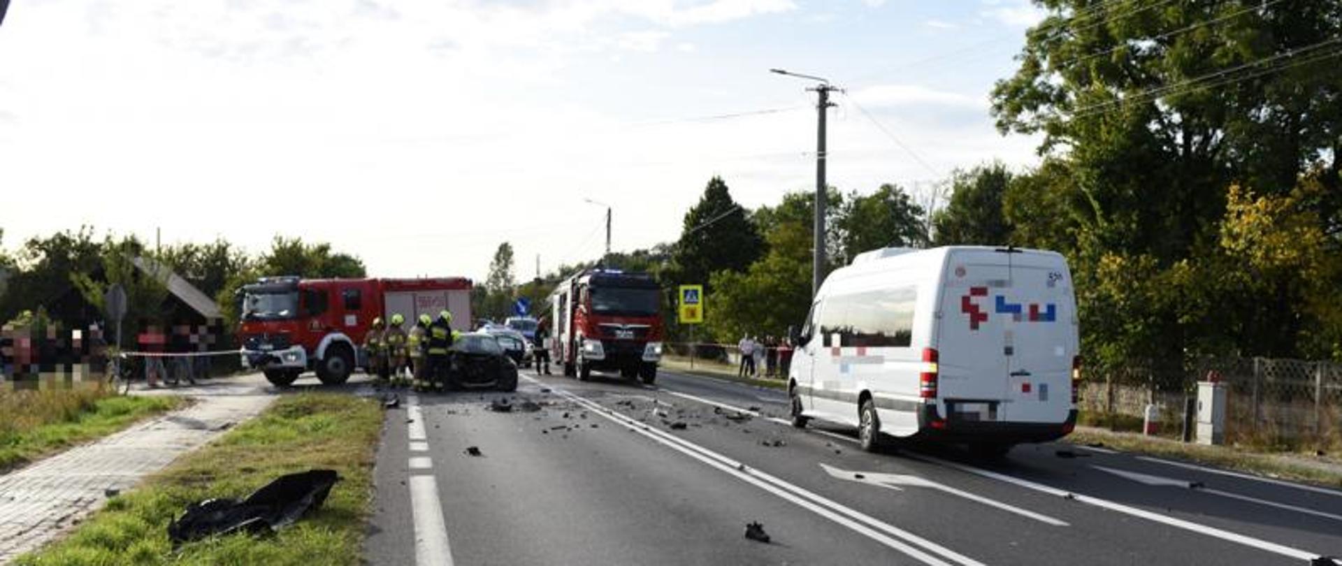 Po dotarciu na miejsce zdarzenia ustalono, że w wypadku uczestniczą dwa samochody oraz motocykl. Podróżujący motocyklem zderzyli się z samochodem osobowym, który włączał się do ruchu. Siła uderzenia była tak duża, że jednoślad został wyrzucony kilkadziesiąt metrów dalej, gdzie uderzył w płot jednej z posesji oraz stanął w płomieniach. Jedna osoba podróżująca motocyklem w momencie uderzenia wypadła na drugą stronę ulicy i chwilę później przejechał po niej bus wiozący pasażerów. Po długiej reanimacji kierowcy motocykla również nie udało się uratować. Działania straży polegały na zabezpieczeniu miejsca zdarzenia oraz pomocy ZRM. Na miejscu lądował także śmigłowiec LPR.