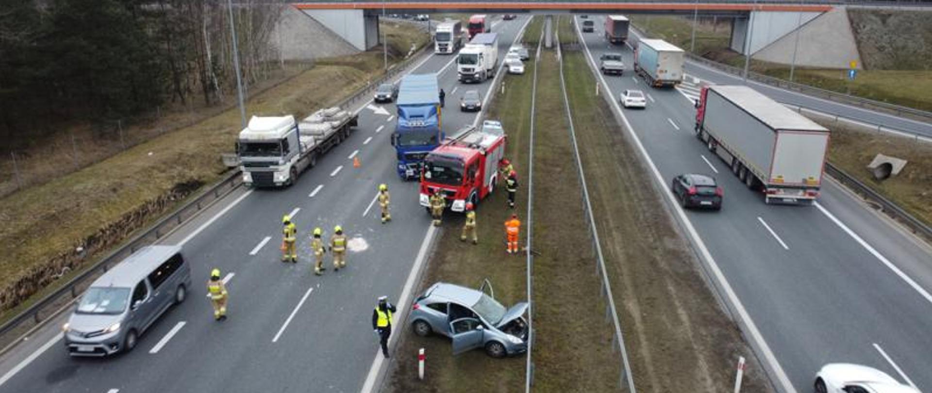 Po przybyciu na miejsca zdarzenia, zastano wypadek pojazdu osobowego z ciężarowym. W wyniku zderzenia kierowca pojazdu osobowego został ranny i uwięziony w pojeździe. Działania straży polegały na zabezpieczeniu miejsca zdarzenia, wykonaniu dostępu do poszkodowanego przy pomocy narzędzi hydraulicznych, ewakuacji i ułożeniu poszkodowanego na noszach typu deska. Następne czynności straży polegały na udzieleniu Kwalifikowanej Pierwszej Pomocy Medycznej osobie poszkodowanej. Ruch na drodze S8 w obu kierunkach został wstrzymany w celu zabezpieczenia lądowania śmigłowca Lotniczego Pogotowia Ratunkowego. Przybyły na miejsce Zespół Pogotowia Ratunkowego przejął poszkodowanego, a następnie został przeniesiony do śmigłowca LPR, który transportował go do szpital. Dalsze działania polegały na neutralizacji i sorpcji rozlanych płynów neutralizacyjnych.