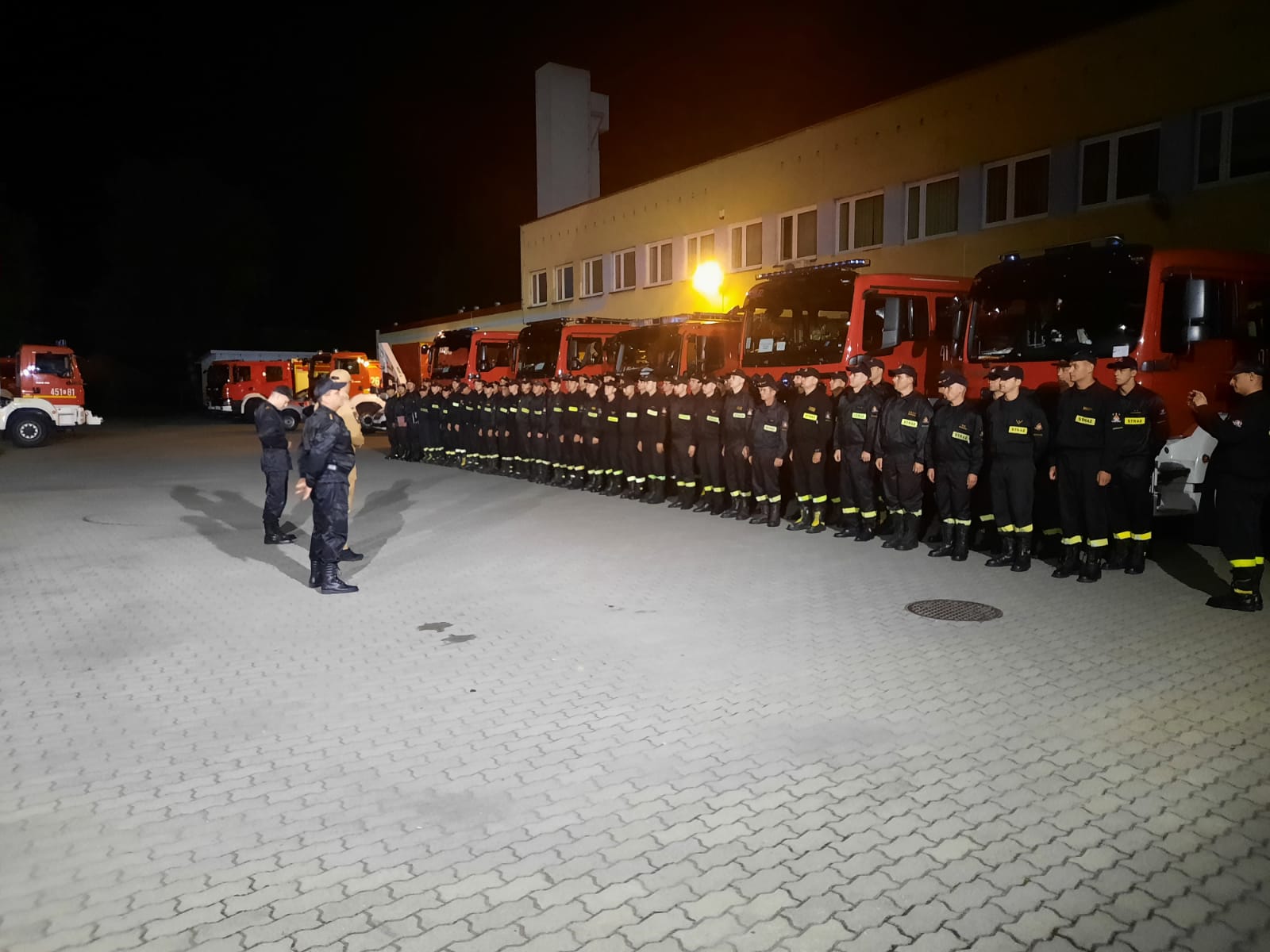 Po ukompletowaniu pododdziałów oraz odprawie z Świętokrzyskim Komendantem Wojewódzkim PSP nadbryg. Krzysztofem Cioskiem kolumna pojazdów pożarniczych wyruszyła w dalszą drogę do Punktu Przyjęcia Sił i Środków zorganizowanym na lądowisku przeciwpożarowym w Kuźni Raciborskiej. W ćwiczeniach z JRG Włoszczowa weźmie udział ciężki samochód ratowniczo-gaśniczy GCBA-Rt 5/32 z pięcioosobową obsadą.