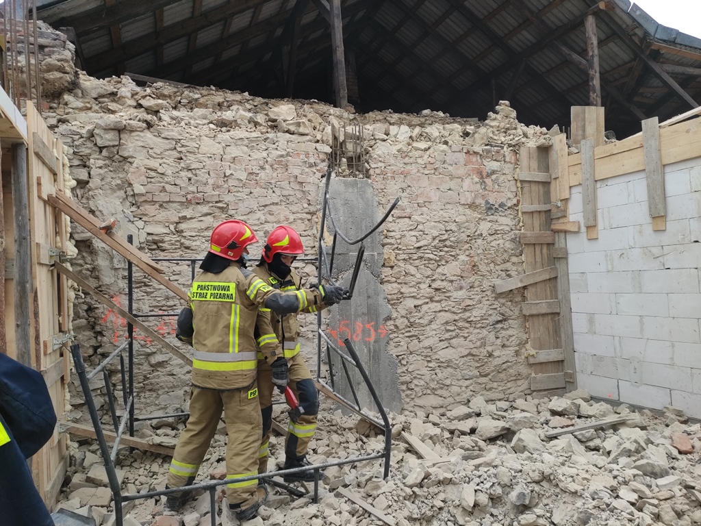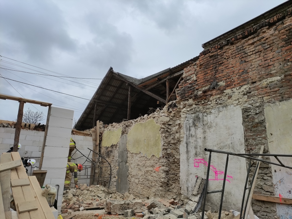 Po przybyciu na miejsce zdarzenia zastępów straży pożarnej kierujący działaniem ratowniczym stwierdził zawalenie się ściany szczytowej budynku mieszkalnego w wyniku czego dwie osoby prowadzące prace budowlane na sąsiedniej posesji zostały poszkodowane. Działania straży pożarnej polegały na zabezpieczeniu miejsca akcji oraz do czasu przybycia na miejsce Zespołów Ratownictwa Medycznego udzieleniu kwalifikowanej pierwszej pomocy dwóm mężczyznom poszkodowanym w tym zdarzeniu. Równocześnie przystąpiono do sprawdzania wnętrza uszkodzonego budynku mieszkalnego. Ze względu na stan obiektu, niebezpieczeństwo dalszego zawalenia budynku, z jego pomieszczeń ewakuowano mężczyznę. Dalsze działania strażaków-ratowników polegały na rozebraniu uszkodzonych rusztowań oraz przeszukaniu gruzowiska celem wykluczenia innych poszkodowanych osób.