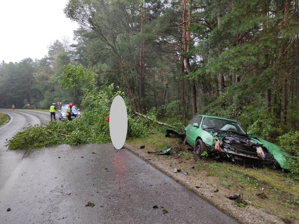 Po przybyciu na miejsce kierujący działaniem ratowniczym stwierdził, że na łuku drogi samochód osobowy wypadł z niej i uderzył w drzewo. Kierująca pojazdem sama opuściła pojazd, a do czasu przybycia zespołu ratownictwa medycznego strażacy udzielili jej wsparcia psychicznego. Dalsze działania zastępów straży polegały na odłączeniu akumulatora, zakręceniu zaworu butli LPG w pojeździe oraz usunięciu z drogi powalonego drzewa i zanieczyszczeń powstałych w wyniku zdarzenia. W działania brały udział zastępy PSP oraz OSP Kluczewsko w sumie 4 pojazdy ratowniczo-gaśnicze i specjalne, 9 strażaków ratowników oraz służby współdziałające.