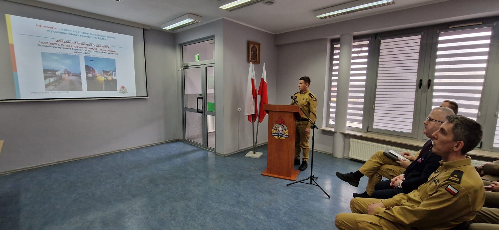 W pierwszej części spotkania Zastępca Komendanta Powiatowego PSP we Włoszczowie mł. bryg. Paweł Mazur dokonał podsumowania działań operacyjnych, prewencyjnych oraz logistycznych. Następnie d-ca JRG kpt. Damian Krzemiński przedstawił wybrane zdarzenia z 2025 r. oraz omówił przeprowadzone szkolenia przez KP PSP we Włoszczowie oraz Ośrodek Szkolenia KW PSP w Kielcach. Komendant Powiatowy PSP we Włoszczowie st. bryg. Tomasz Szymański podkreślił, że w 2025 roku zakupiono znaczną ilość nowoczesnego sprzętu, który w istotny sposób wspiera i usprawnia prowadzenie działań ratowniczo-gaśniczych. Zwrócił również uwagę na kluczową rolę jednostek OSP w prawidłowym funkcjonowaniu krajowego systemu ratowniczo-gaśniczego oraz na ogromne znaczenie władz samorządowych w zapewnianiu bezpieczeństwa na terenie poszczególnych gmin. Przedstawił także cele i główne kierunki funkcjonowania jednostki na 2026 rok. Na zakończenie Komendant podziękował zaproszonym gościom za wszelkie formy wsparcia udzielanego strażakom w realizacji zadań oraz rozwiązywaniu problemów związanych z bezpieczeństwem.