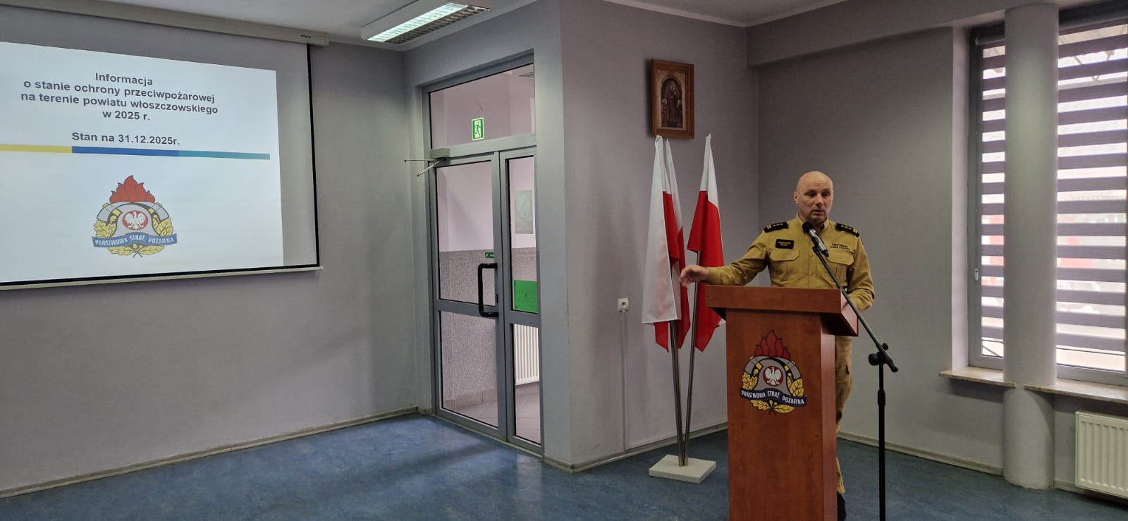 6 lutego 2026 roku w siedzibie Komendy Powiatowej Państwowej Straży Pożarnej we Włoszczowie odbyła się narada podsumowująca działalność za 2025 rok. Spotkanie rozpoczęło się złożeniem meldunku st. bryg. Grzegorzowi Rajcy - Zastępcy Świętokrzyskiego Komendanta Wojewódzkiego PSP przez d-ce JRG kpt. Damiana Krzemińskiego. Kolejnym punktem narady było przywitanie gości przez Komendanta Powiatowego PSP we Włoszczowie st. bryg. Tomasz Szymański.