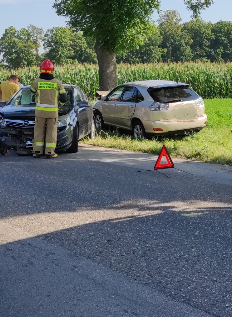 Po dojeździe na miejsce kierujący działaniem ratowniczym potwierdził zderzenie dwóch samochodów osobowych, którymi podróżowały łącznie 3 osoby (2 dorosłe i dziecko). Do czasu przyjazdu zespołu ratownictwa medycznego wobec uczestników zdarzenia uruchomiono procedury kwalifikowanej pierwszej pomocy. Wobec dziecka zastosowano wsparcie psychiczne, przekazano maskotkę misia ratownika, a kierującemu jednego z pojazdów ze względu na zgłaszane dolegliwości założono kołnierz ortopedyczny. Do szpitala odwiezione zostało dziecko oraz poszkodowany kierowca. Dalsze działania polegały na kontunuowaniu zabezpieczania miejsca akcji w czasie prowadzonych czynności dochodzeniowych przez patrol Policji. Po ich zakończeniu usunięto plamę płynów eksploatacyjnych powstałą w wyniku zdarzenia. W działaniach udział brało łącznie 6 zastępów PSP i OSP, 20 strażaków ratowników oraz służby współdziałające.