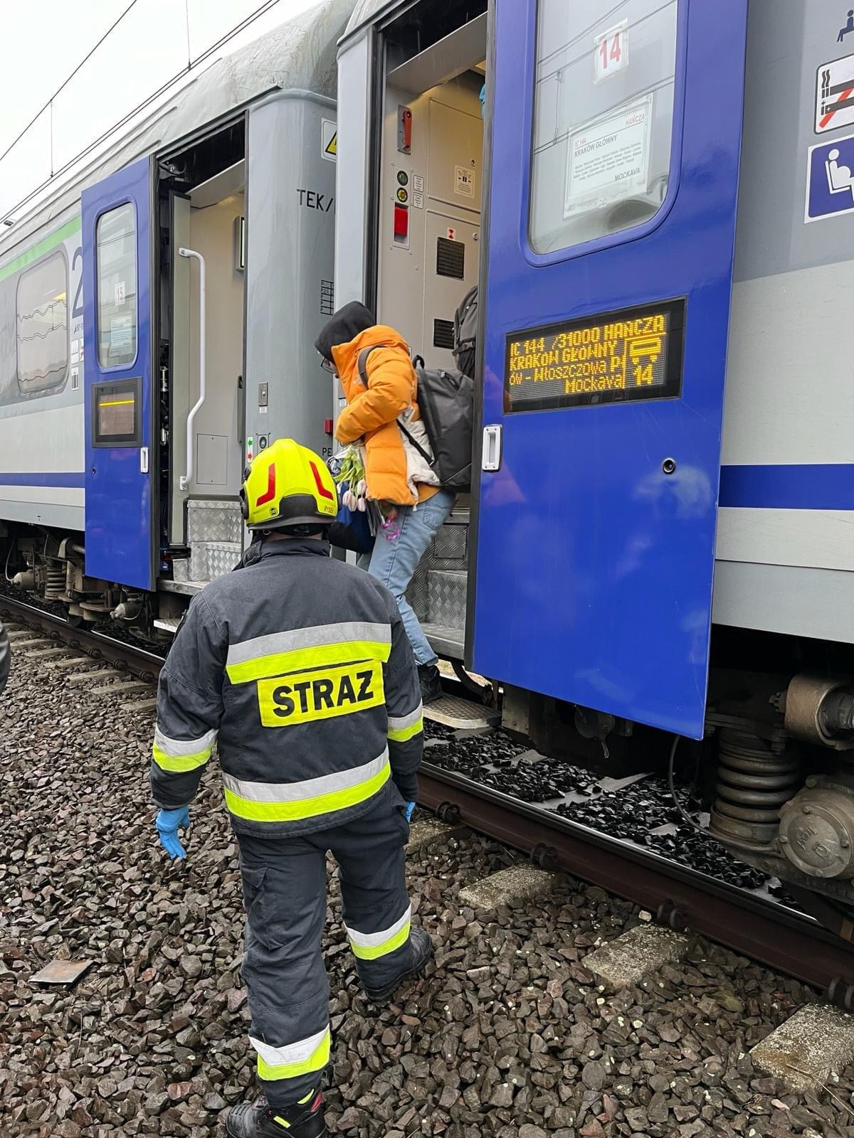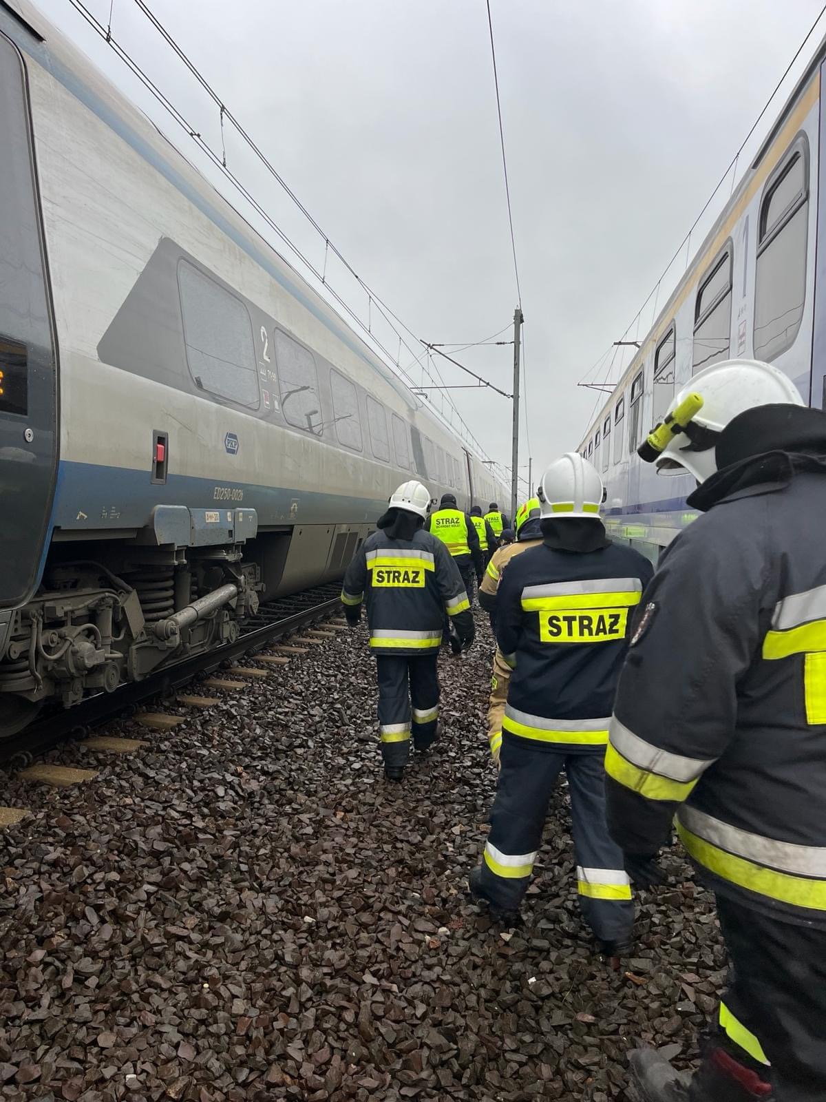 Działania jednostek ochrony przeciwpożarowej polegały na zabezpieczeniu miejsca zdarzenia i pomocy pasażerom w przesiadce do zastępczego pociągu, który został podstawiony przez przewoźnika na sąsiedni tor. Z uwagi na znaczną wysokość od stopnia pociągu do nasypu kolejowego strażacy pomagali oraz asekurowali pasażerów, zapewniając bezpieczne przejście do sprawnego pociągu.