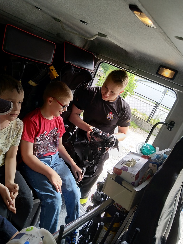 W ramach akcji „Kręci mnie bezpieczeństwo” odbyła się pogadanka na temat szeroko rozumianego bezpieczeństwa w domu i na ulicy, zachowania się w sytuacji zagrożenia. Szczególną uwagę zwrócono na bezpieczny wypoczynek nad wodą. Strażacy w ciekawy sposobu zainscenizowali w jaki sposób przekazywać informacje o niebezpieczeństwie na numer alarmowy. Dzieci bardzo chętnie przymierzały ubranie specjalne oraz hełm. Uczestnicy spotkania mieli również możliwość zapoznania się ze sprzętem znajdującym się na wyposażeniu samochodu ratowniczo–gaśniczego. Każdy z uczestników mógł się podszkolić z udzielania kwalifikowanej pierwszej pomocy.