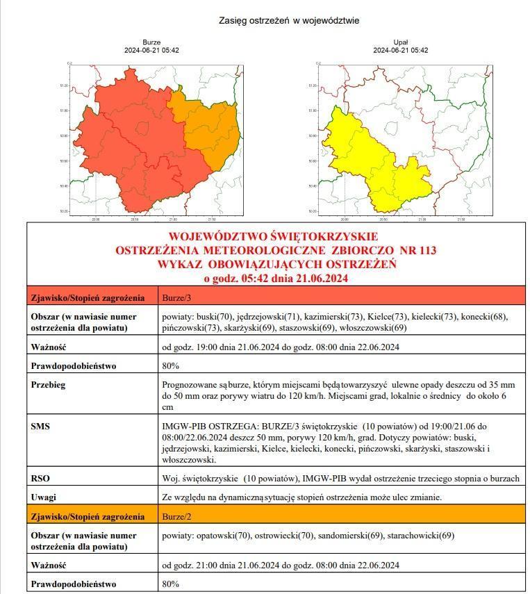 Instytut Meteorologii i Gospodarki Wodnej wydał dla 10 powiatów województwa świętokrzyskiego ostrzeżenia meteo najwyższego, III stopnia o prognozowanych burzach z gradem. Opadom towarzyszyć będą intensywne podmuchy wiatru nawet do 120 km/h. Przygotujmy siebie i swoje otoczenie na wystąpienie zjawiska. Komenda Powiatowa Państwowej Straży Pożarnej we Włoszczowie przypomina podstawowe zasady bezpieczeństwa podczas burz.