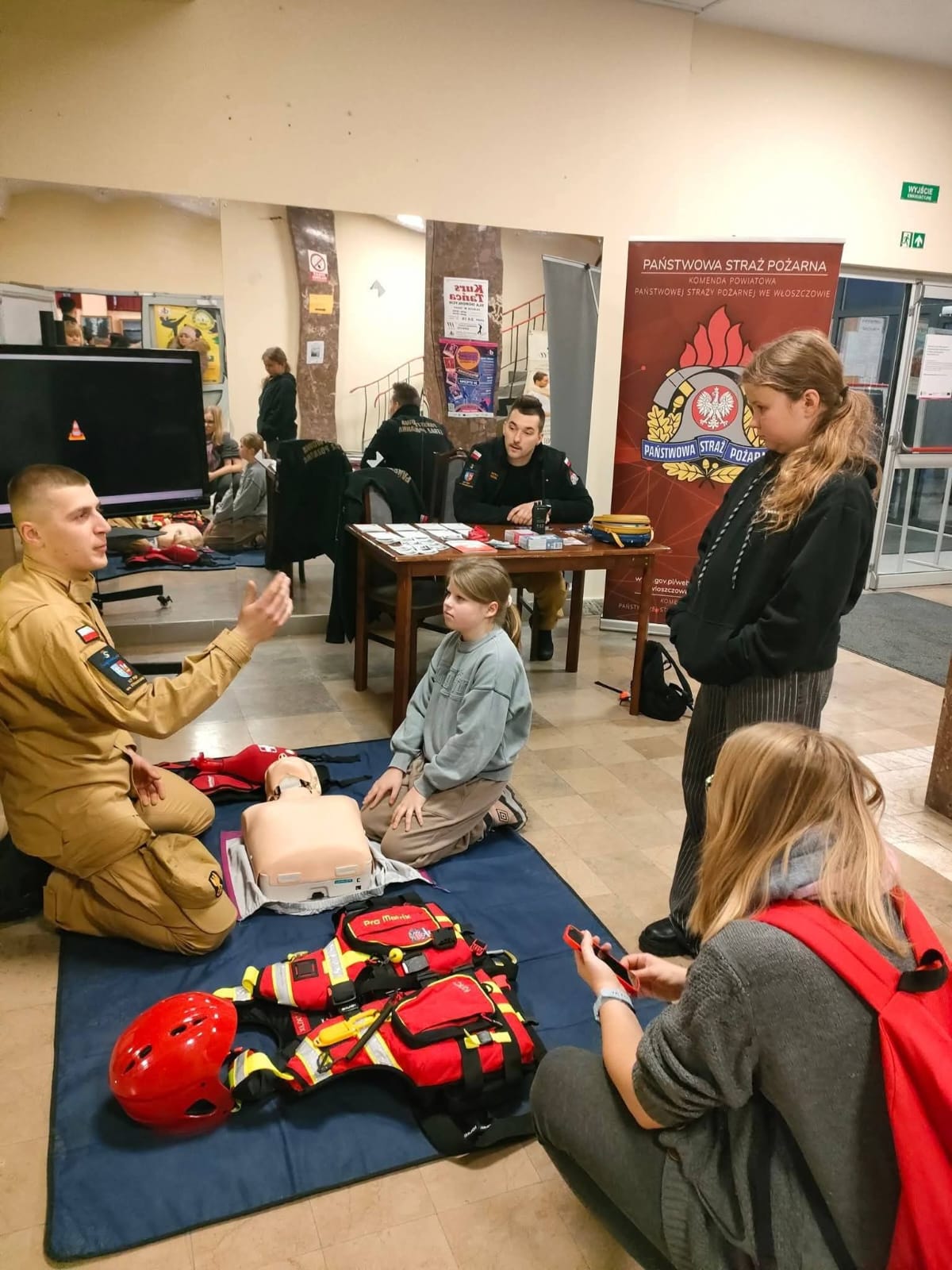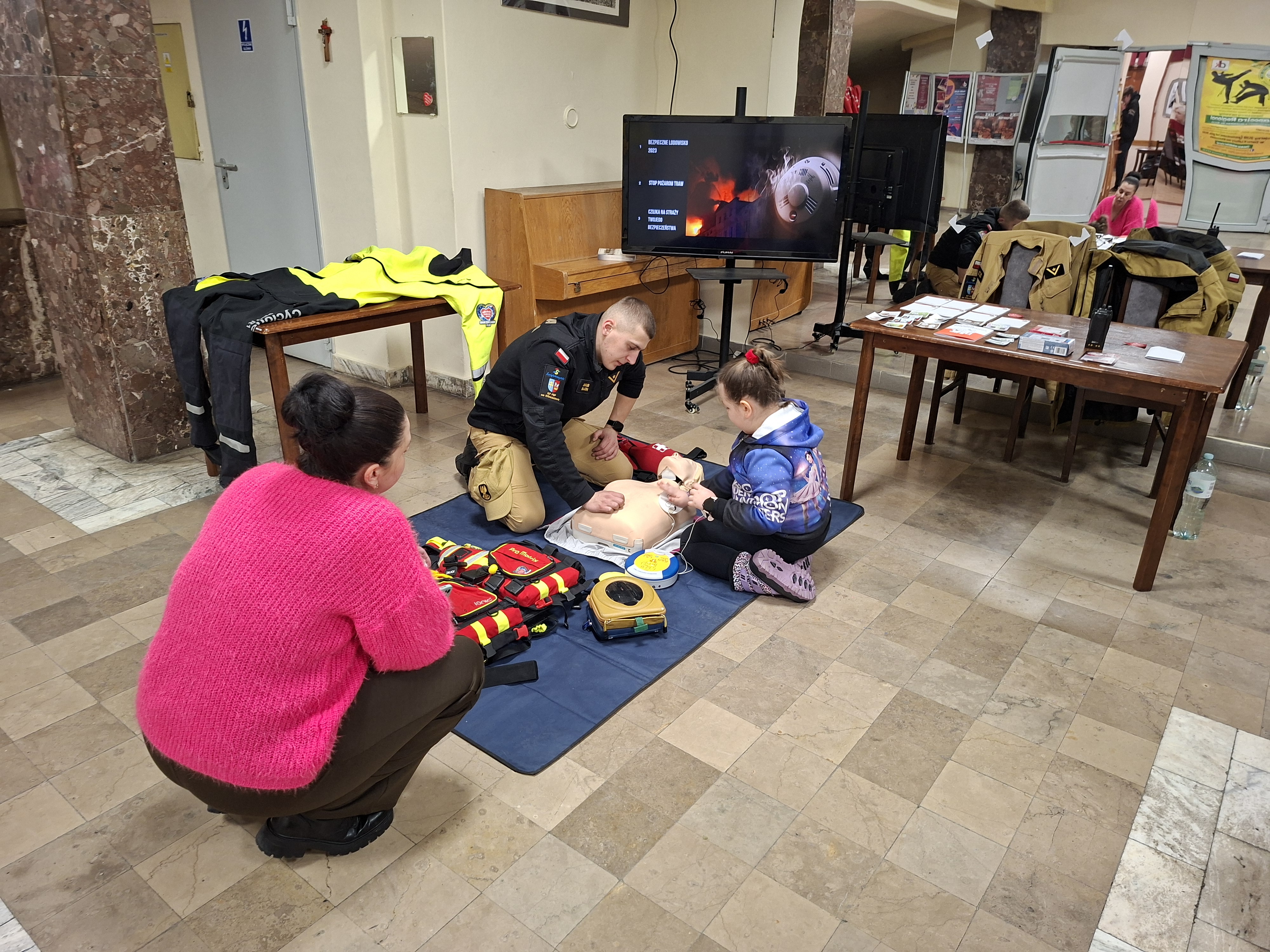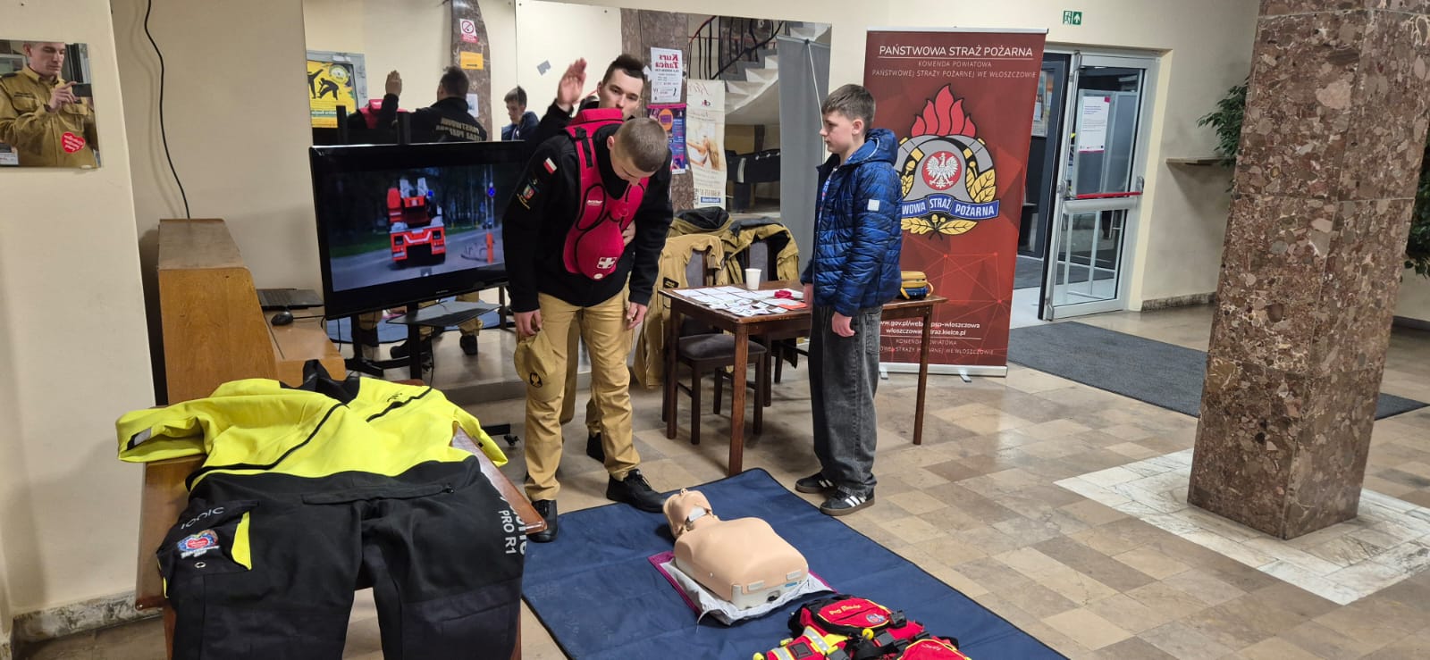 Uczestnicy wydarzenia odwiedzający nasze stoisko w foyer sali kinowej Domu Kultury we Włoszczowie mogli zapoznać się z prowadzonymi przez Państwową Straż Pożarną kampaniami społecznymi. Podczas rozmów poruszono tematy związane z aplikacją „Gdzie się ukryć”, omawiano plecak ewakuacyjny oraz przedstawiono podręcznik „Poradnik bezpieczeństwa”. Na stoisku włoszczowskich strażaków można było zapoznać się zasadami montażu czujek tlenku węgla oraz dymu, a także zapozano odwiedzających z aktualnymi przepisami dotyczącymi tych urządzeń. Pokaz uzupełniono o sprzęt przekazany JRG Włoszczowa przez Wielką Orkiestrę Świątecznej Pomocy tj. ubranie wypornościowe, kaski do ratownictwa wodnego oraz kamizelki asekuracyjne. Strażacy zapoznali również odwiedzających z charakterystyką służby w Państwowej Straży Pożarnej. Najmłodszych gości naszego stoiska instruowano jak prawidłowo wzywać pomoc wykorzystując numer alarmowy 112. Dużym zainteresowaniem cieszył się pokaz pierwszej pomocy, a w szczególności kamizelka do postępowania w przypadku wystąpienia zadławienia.