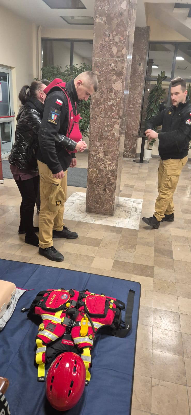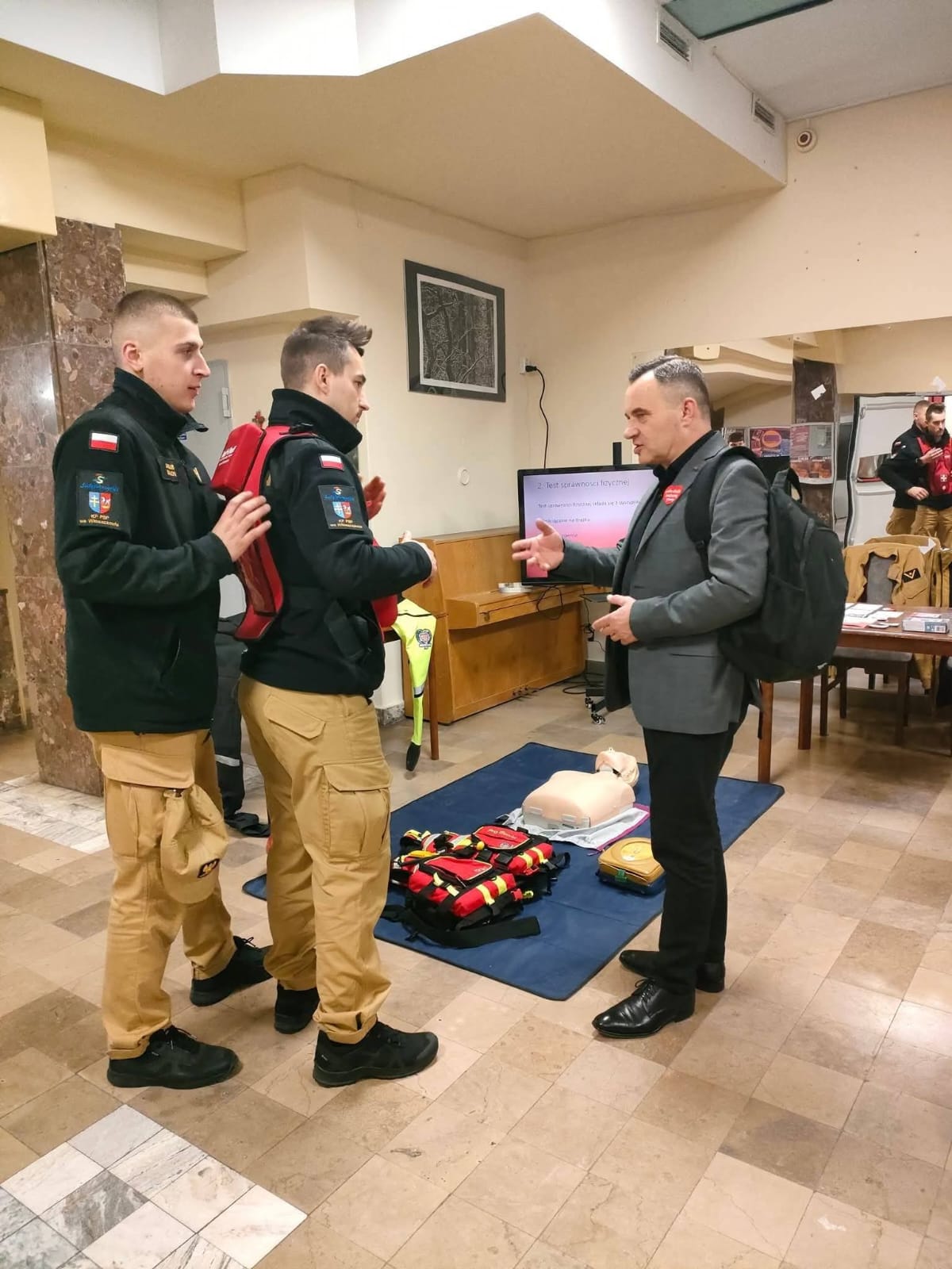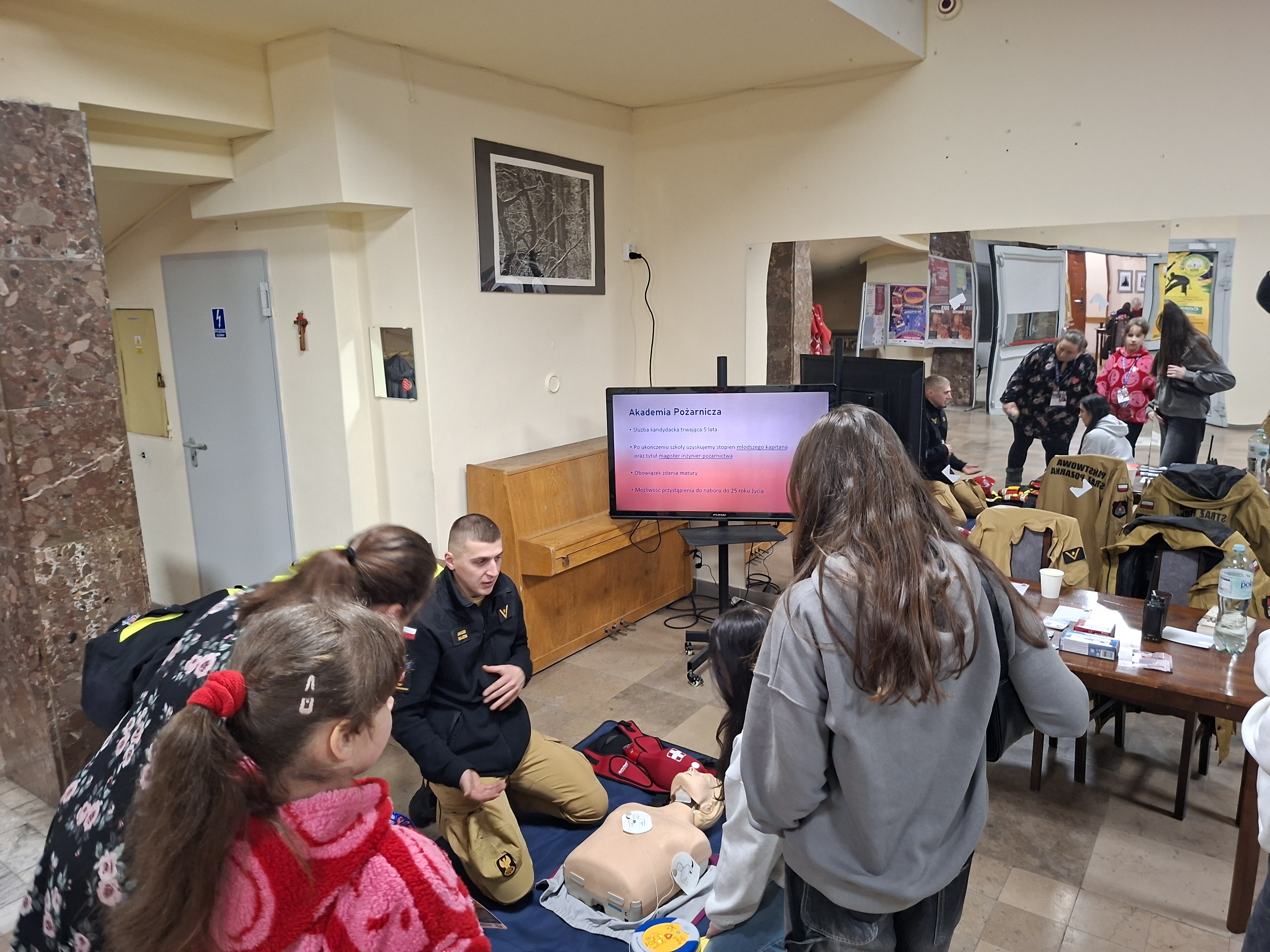 Uczestnicy wydarzenia odwiedzający nasze stoisko w foyer sali kinowej Domu Kultury we Włoszczowie mogli zapoznać się z prowadzonymi przez Państwową Straż Pożarną kampaniami społecznymi. Podczas rozmów poruszono tematy związane z aplikacją „Gdzie się ukryć”, omawiano plecak ewakuacyjny oraz przedstawiono podręcznik „Poradnik bezpieczeństwa”. Na stoisku włoszczowskich strażaków można było zapoznać się zasadami montażu czujek tlenku węgla oraz dymu, a także zapozano odwiedzających z aktualnymi przepisami dotyczącymi tych urządzeń. Pokaz uzupełniono o sprzęt przekazany JRG Włoszczowa przez Wielką Orkiestrę Świątecznej Pomocy tj. ubranie wypornościowe, kaski do ratownictwa wodnego oraz kamizelki asekuracyjne. Strażacy zapoznali również odwiedzających z charakterystyką służby w Państwowej Straży Pożarnej. Najmłodszych gości naszego stoiska instruowano jak prawidłowo wzywać pomoc wykorzystując numer alarmowy 112. Dużym zainteresowaniem cieszył się pokaz pierwszej pomocy, a w szczególności kamizelka do postępowania w przypadku wystąpienia zadławienia.