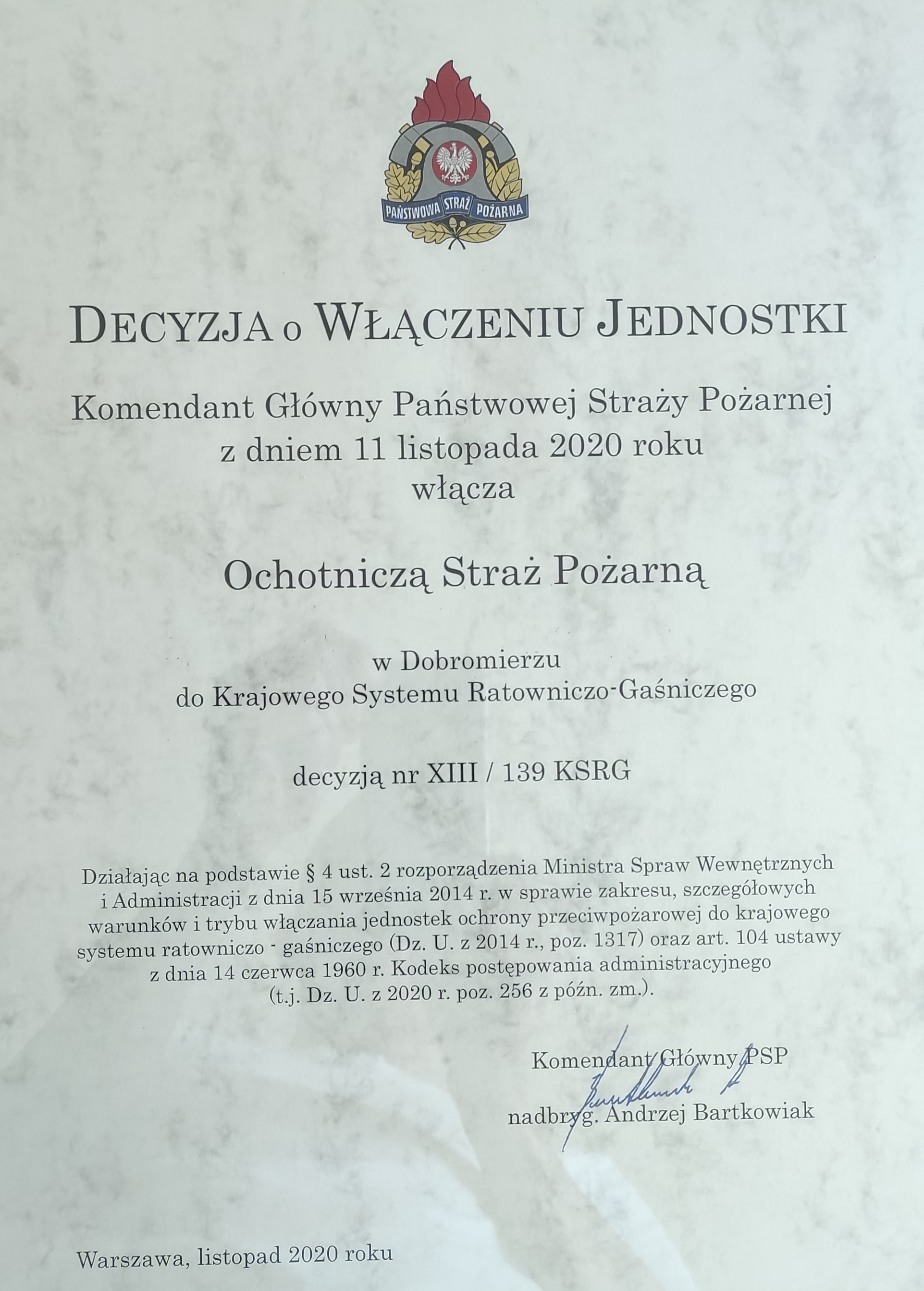 W imieniu jednostki decyzję odebrali dh Leszek Wasela, Prezes OSP Dobromierz i dh Mirosław Tkacz, Wiceprezes OSP Dobromierz.