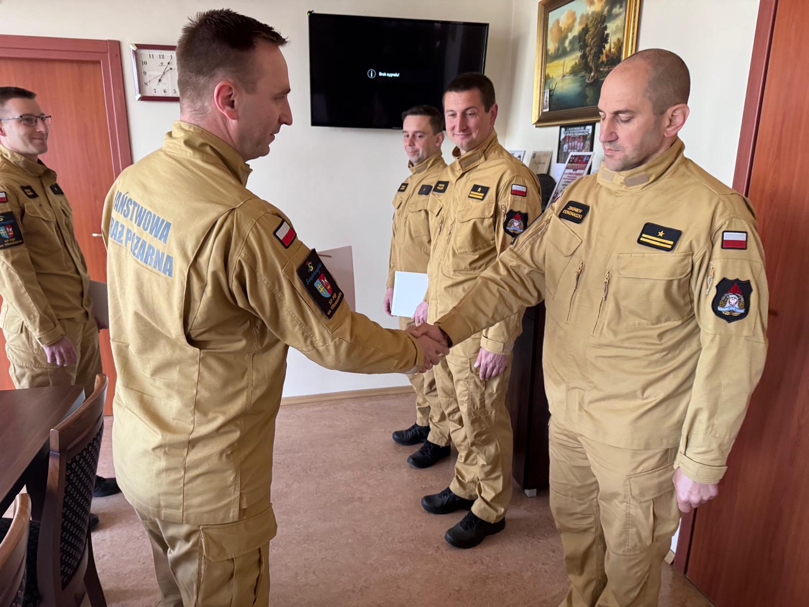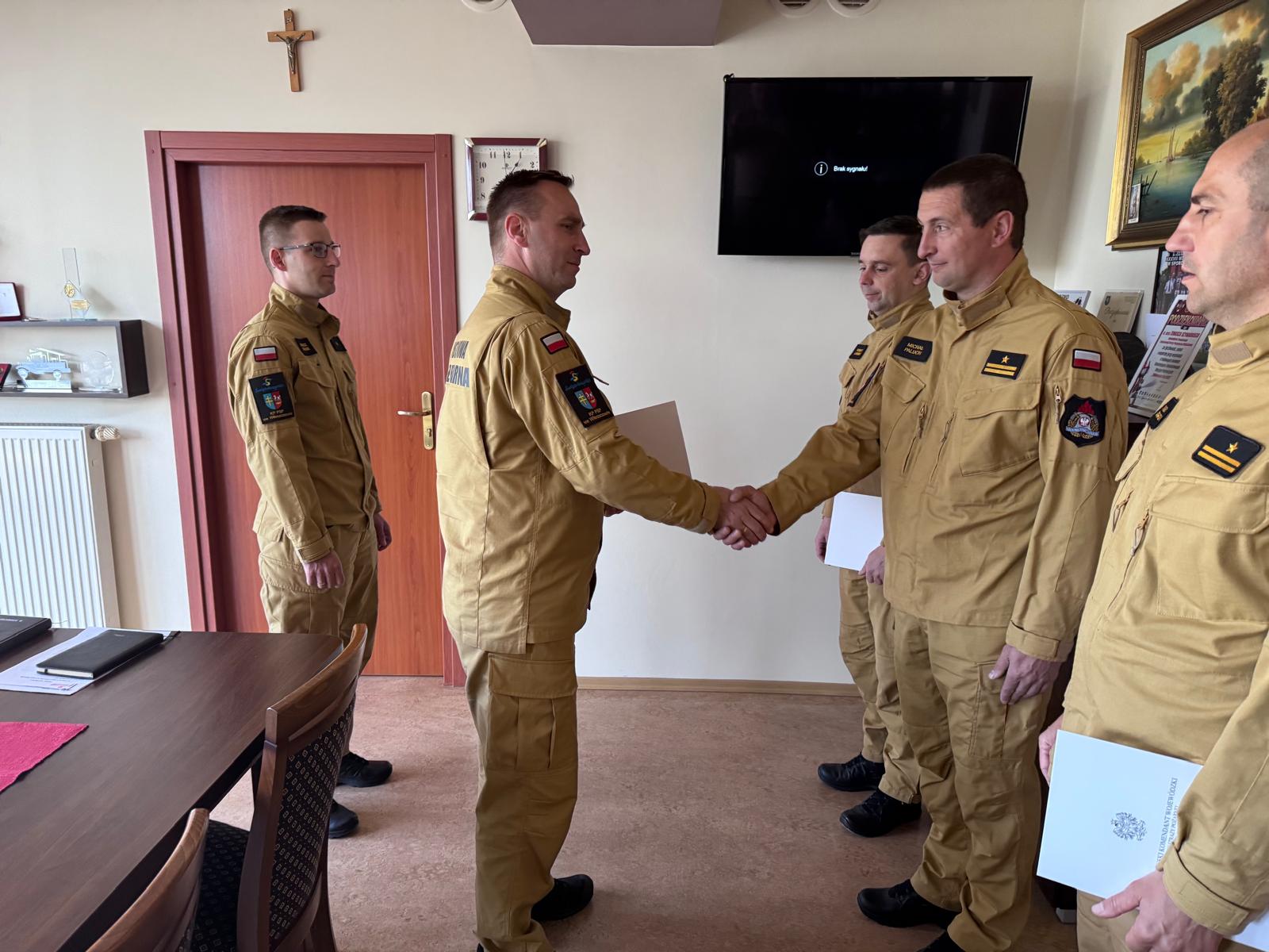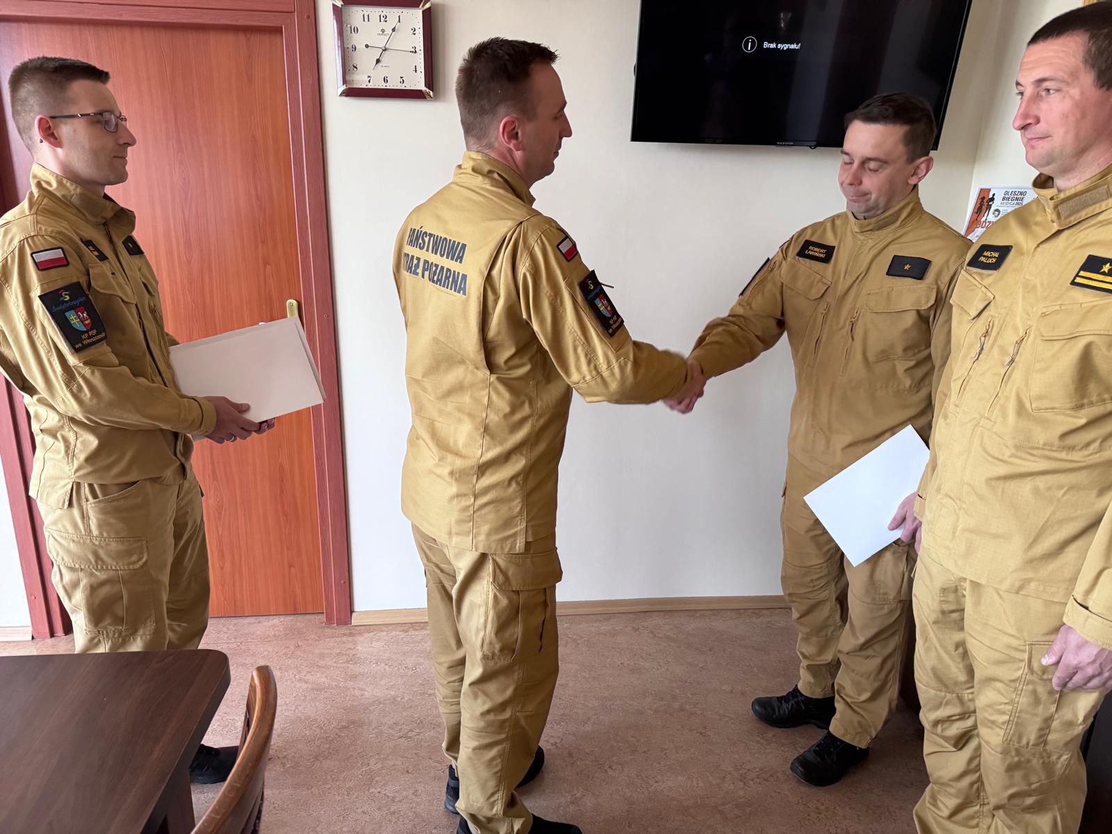 Komendant Powiatowy st. bryg. Tomasz Szymański w imieniu Świętokrzyskiego Komendanta Wojewódzkiego Państwowej Straży Pożarnej w Kielcach st. bryg. Marcina Charuby wręczył trzem funkcjonariuszom nagrody pieniężne za wzorowe wykonywanie zadań służbowych.
