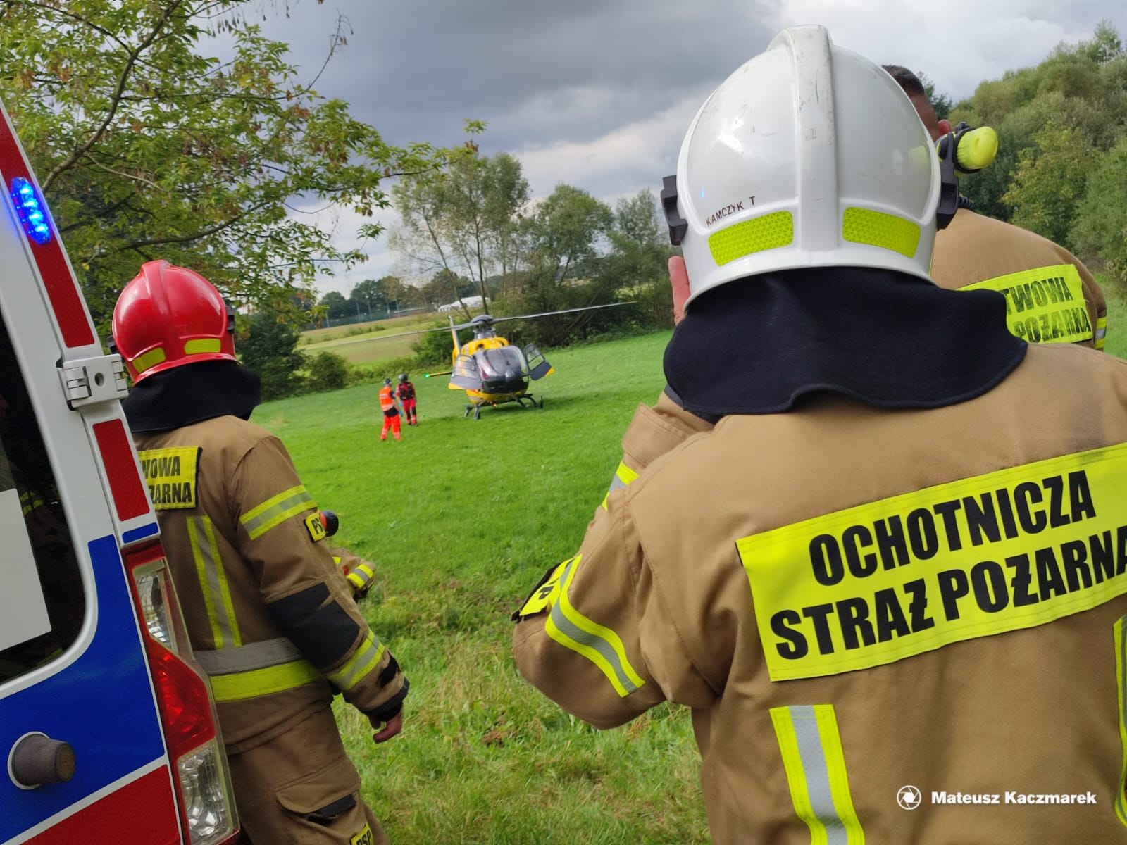 Po dotarciu na miejsce pierwszych zastępów straży pożarnej z przestrzeni podstropowej budynku wydobywały się płomienie oraz silne zadymienie. Po rozpoznaniu okazało się, że pożarem objęty jest dach jednego z pomieszczeń stolarni. Istniało realne ryzyko rozprzestrzenienia się ognia na pozostałą część obiektu. W wyniku zdarzenia dwie osoby zostały poszkodowane. Ofiarom udzielona została pomoc medyczna, najpierw przez przybyłych na miejsce strażaków a później przez zespół ratownictwa medycznego. Z rozległymi oparzeniami ciała obie osoby zostały przetransportowane do szpitali przez Lotnicze Pogotowie Ratunkowe.
