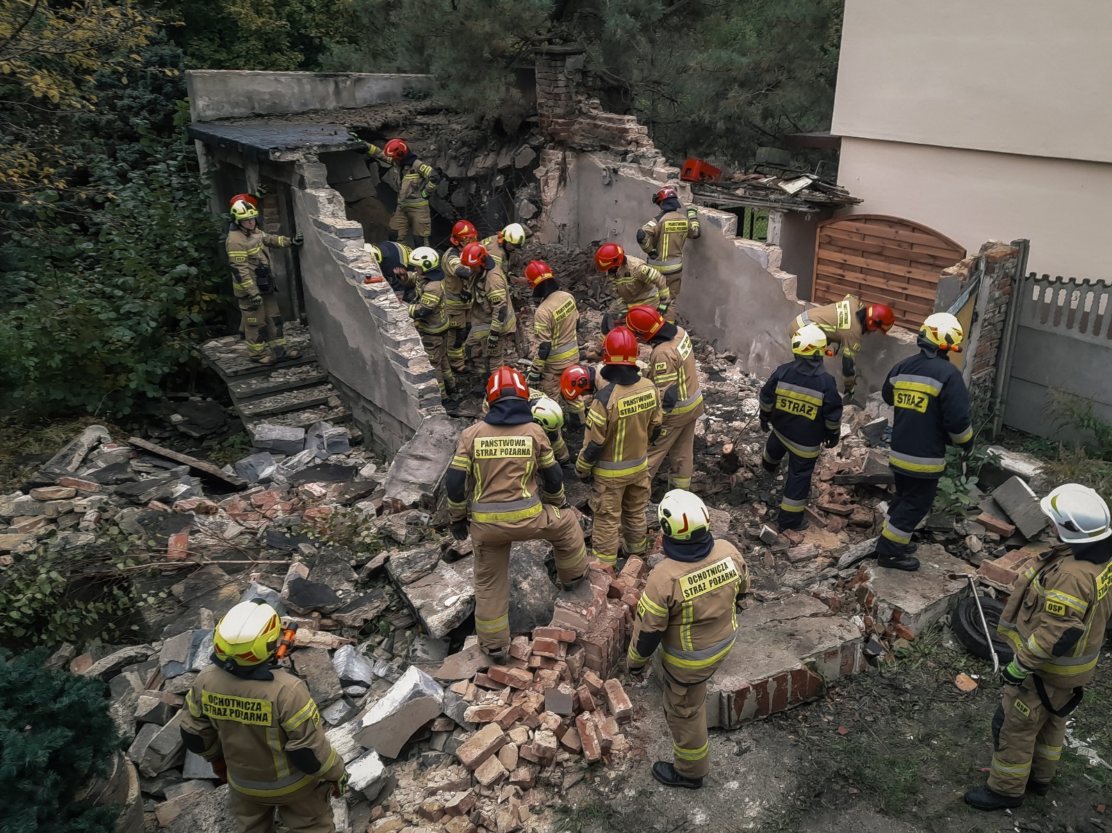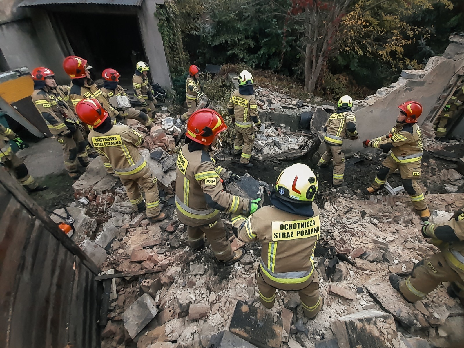 Po przyjeździe na miejsce zdarzenia, strażacy ustalili, że zawaleniu uległ dach pustostanu, będącego w przeszłości obiektem garażowym. Istniało prawdopodobieństwo, że w środku mogły znajdować się osoby, w związku z czym na miejsce zadysponowano Specjalistyczną Grupę Poszukiwawczo - Ratowniczą z Jastrzębia-Zdroju. Na miejsce zdarzenia udała się również Grupa Operacyjna Komendy Wojewódzkiej PSP w Katowicach. Po przeszukaniu gruzowiska z wykorzystaniem sprzętu oraz psów ratowniczych a także odgruzowaniu obiektu do poziomu podłogi wykluczono obecność osób poszkodowanych. Na koniec wyburzono niestabilne fragmenty konstrukcji budynku.