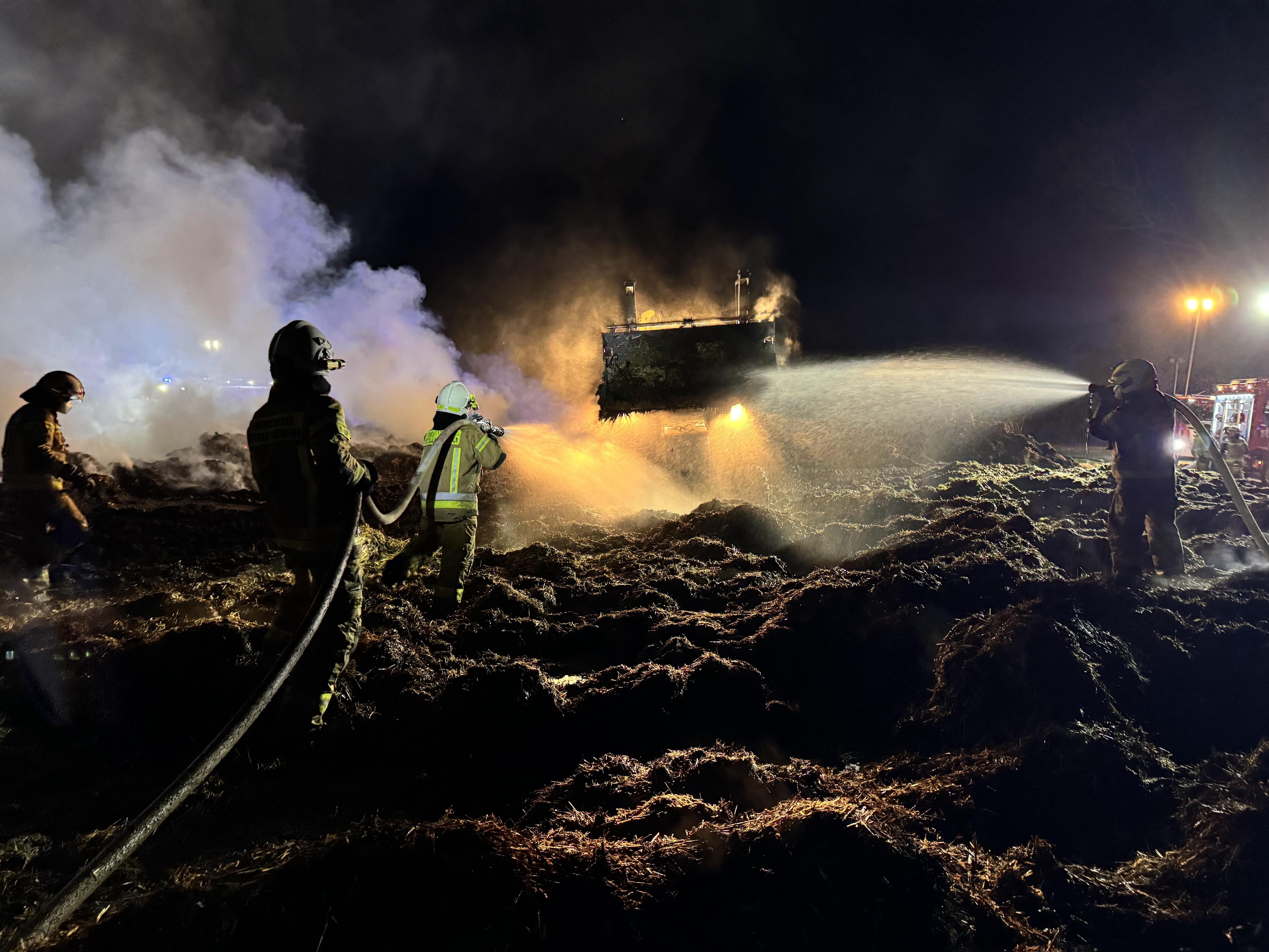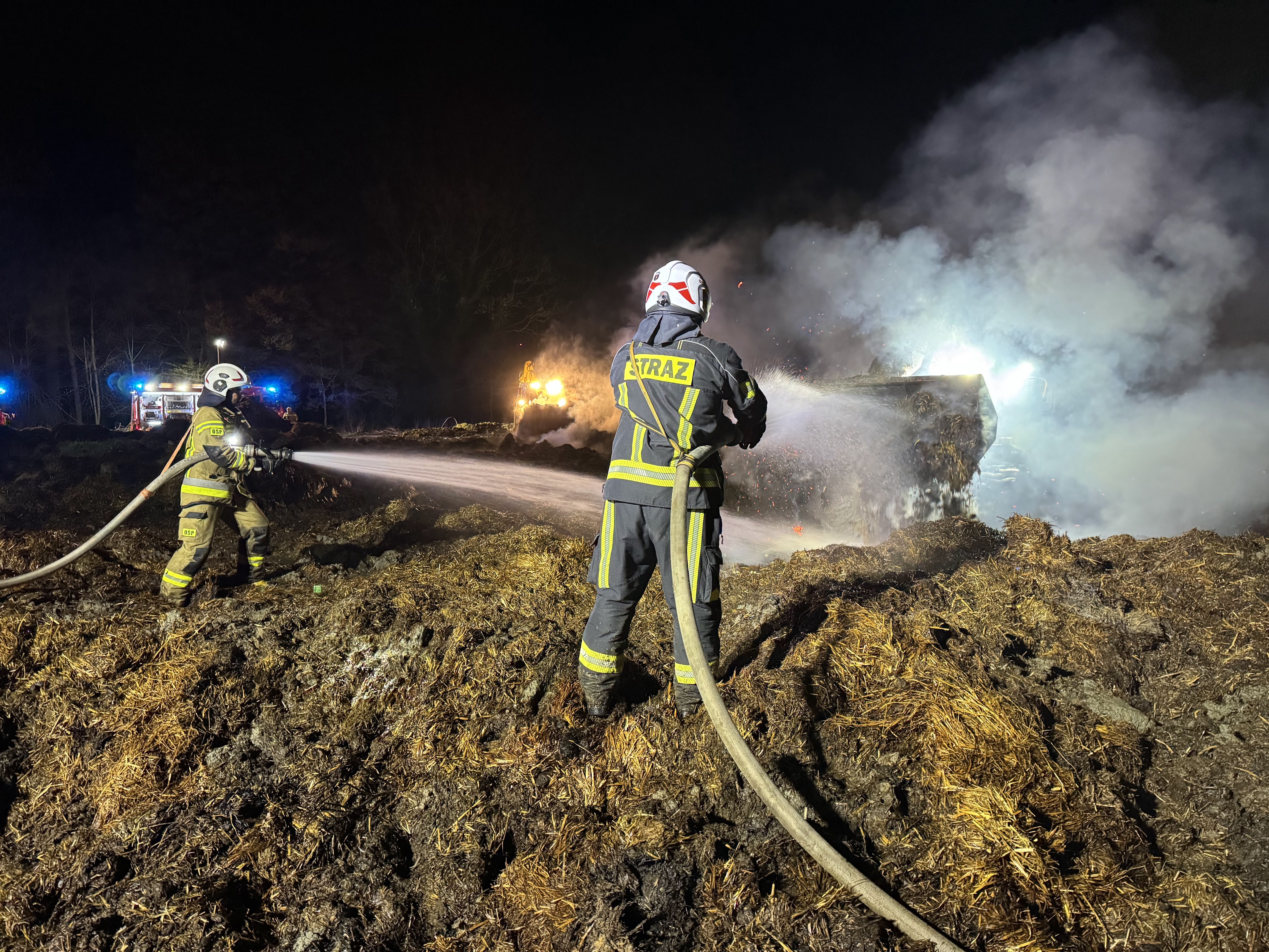 Do następnego pożaru doszło w poniedziałek, 7 kwietnia, w godzinach wieczornych. Przed godziną 18:00 Stanowisko Kierowania Komendanta Powiatowego otrzymało zgłoszenie o pożarze traw oraz składowanego na otwartej przestrzeni obornika. Jak ustalono, przyczyną zdarzenia było zerwanie napowietrznej linii energetycznej. Akcja gaśnicza była wspierana przez sprzęt specjalistyczny, w tym koparkoładowarki, które wykorzystano do przegrzebywania i dogaszania palącego się materiału.