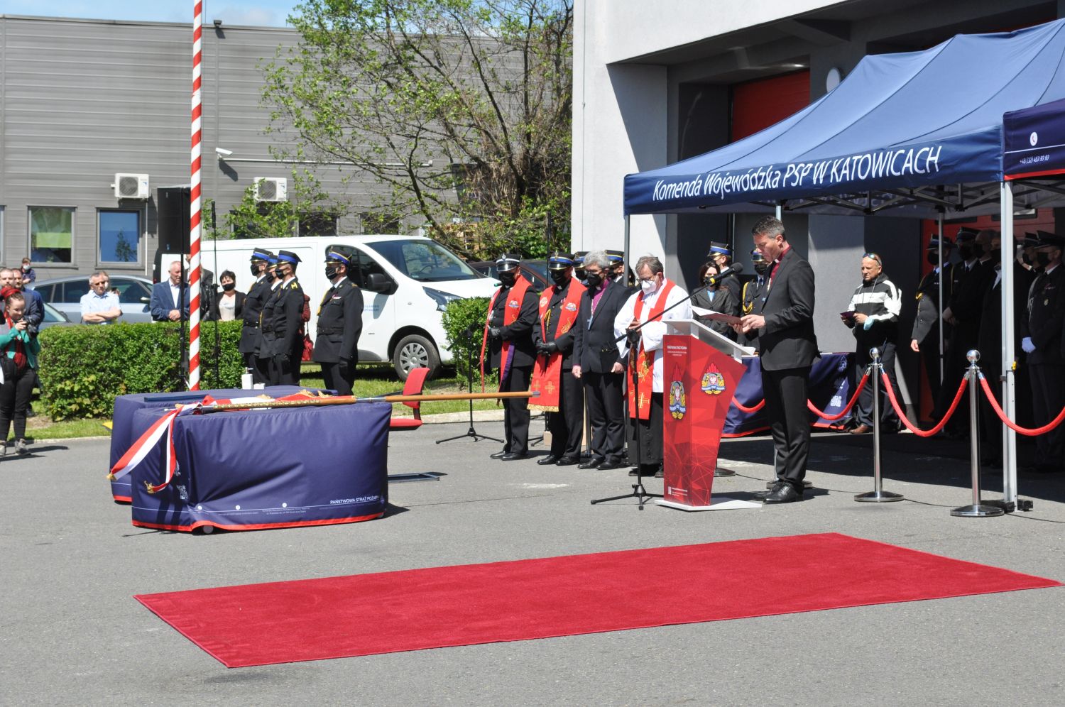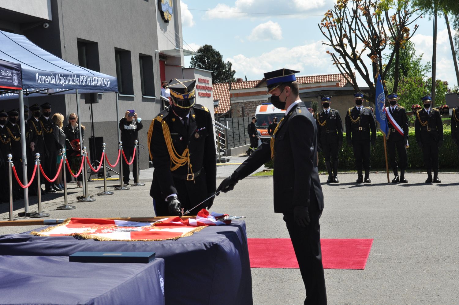 21 maja 2021 to bez wątpienia historyczny dzień dla Komendy Powiatowej Państwowej Straży Pożarnej w Wodzisławiu Śląskim. Tego dnia na terenie komendy odbyła się uroczystość, podczas której nastąpiło wręczenie sztandaru dla naszej komendy. Nadany sztandar jest pierwszym sztandarem jaki pojawił się w szeregach wodzisławskiej zawodowej straży pożarnej. Uroczystość nadania sztandaru połączona została z Wojewódzkimi Obchodami Dnia Strażaka i promocją oficerską.