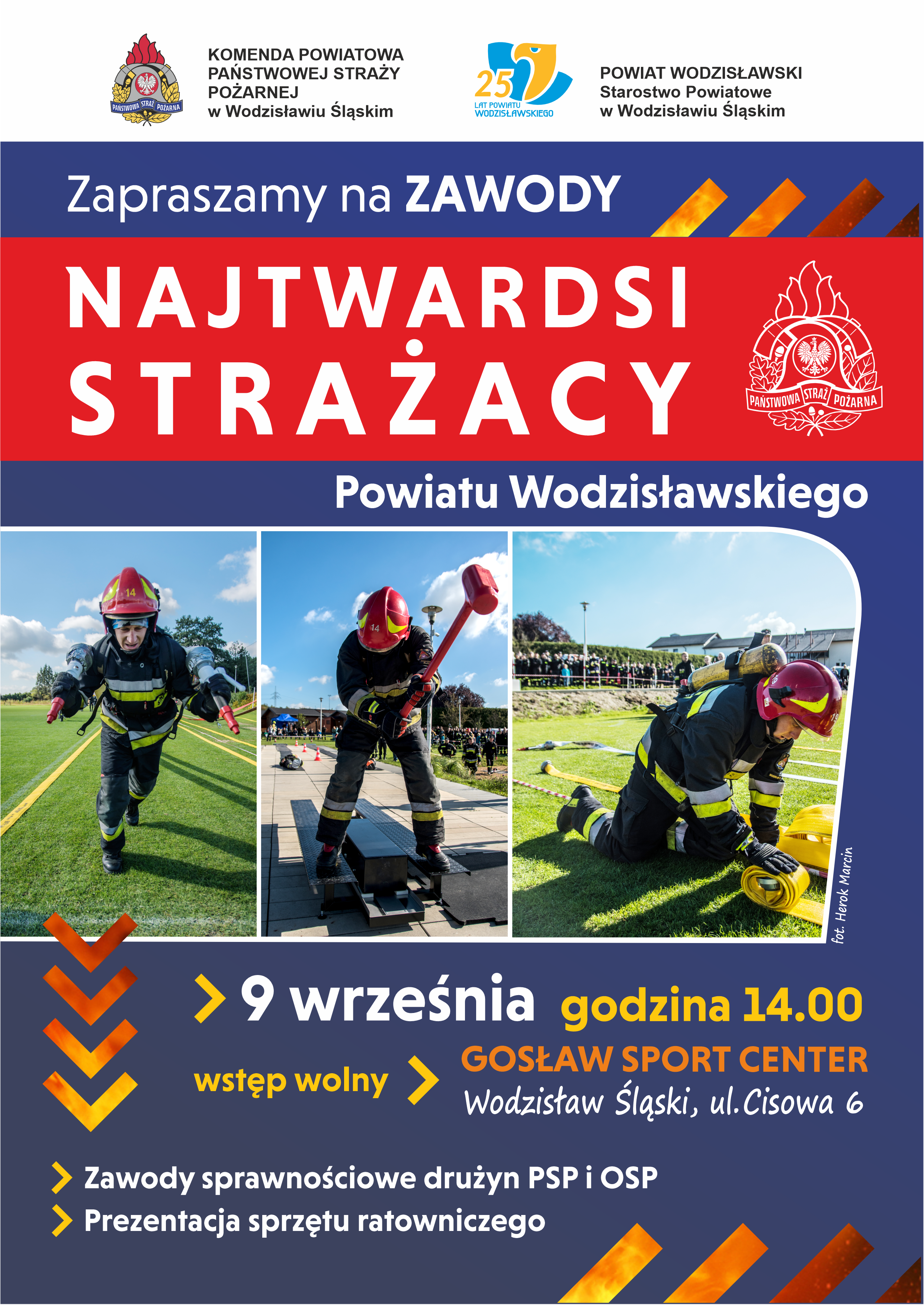 9 września 2023 roku na terenie ośrodka sportowego "Gosław Sport Center" w Wodzisławiu Śląskim przy ul. Cisowej 6 odbędzie się IV edycja zawodów „Najtwardsi Strażacy Powiatu Wodzisławskiego”. Zawody są skierowane do jednostek Ochotniczych Straży Pożarnych powiatu wodzisławskiego oraz strażaków Komendy Powiatowej PSP w Wodzisławiu Śląskim i rozegrane zostaną w jednej konkurencji - bieg drużynowy.