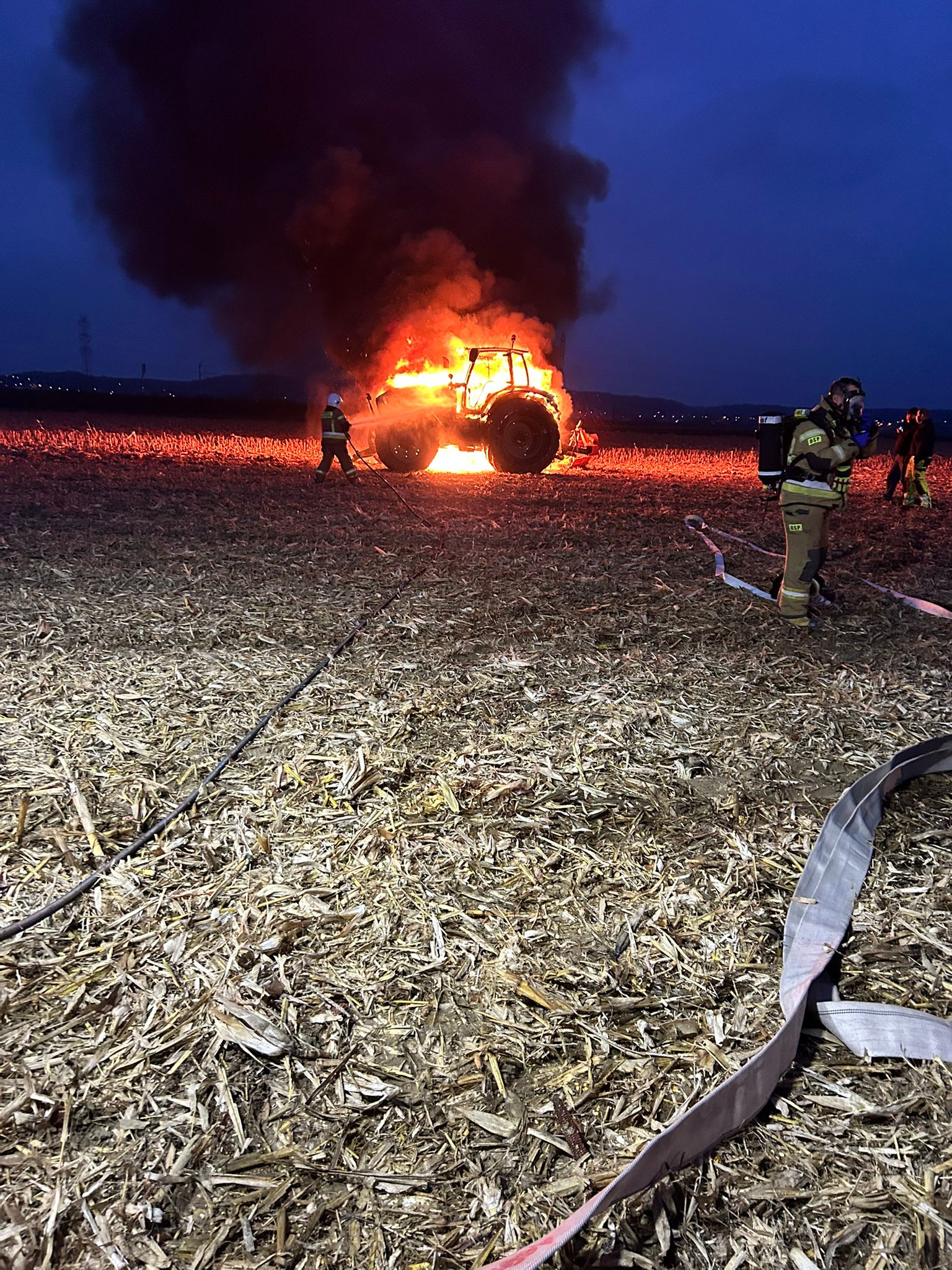Po przybyciu na miejsce zdarzenia okazało się, że ciągnik jest całkowicie objęty płomieniami. Po podaniu prądu wody, a następnie piany pożar ugaszono. W zdarzeniu brały udział trzy zastępy straży pożarnej.