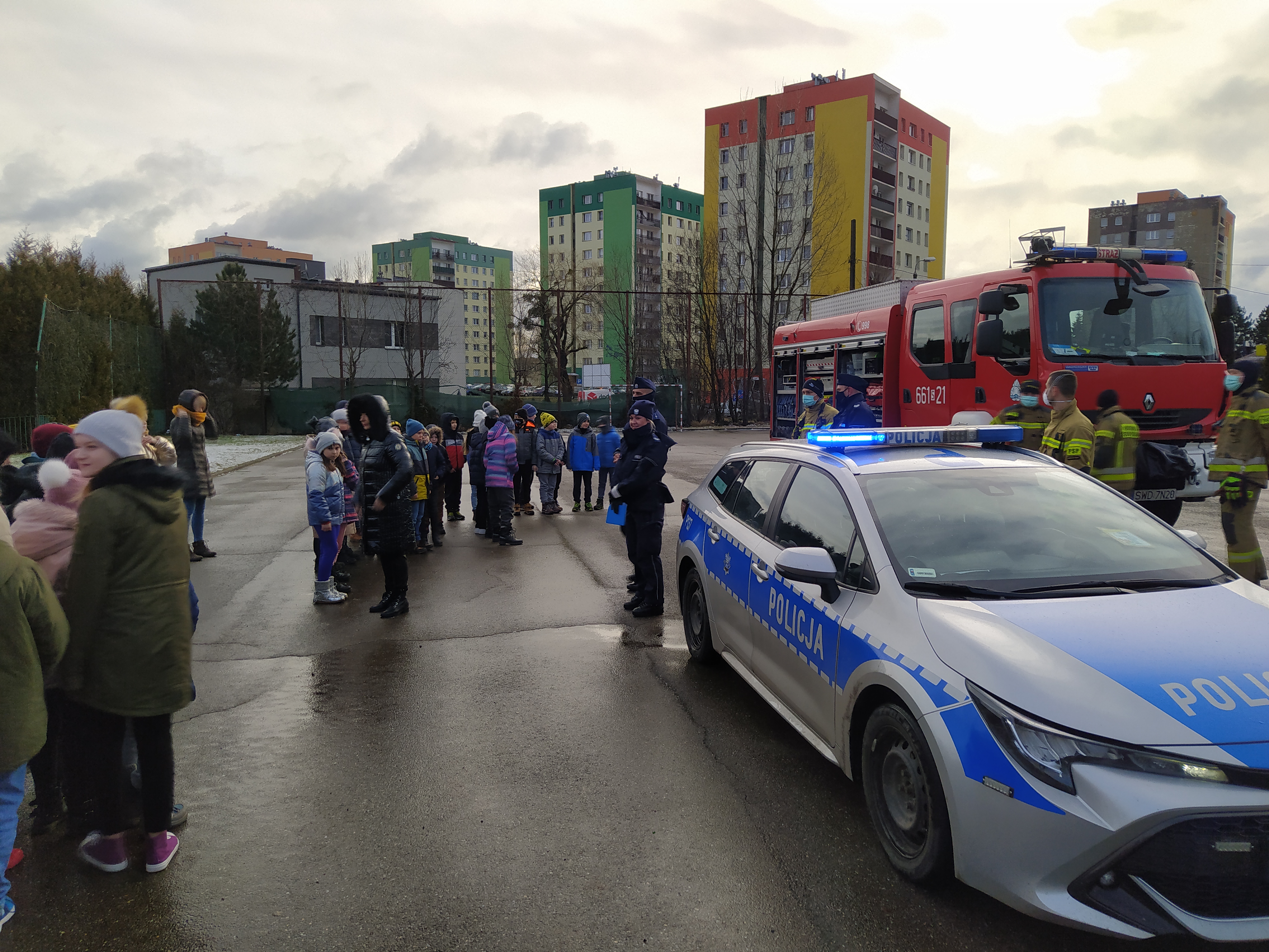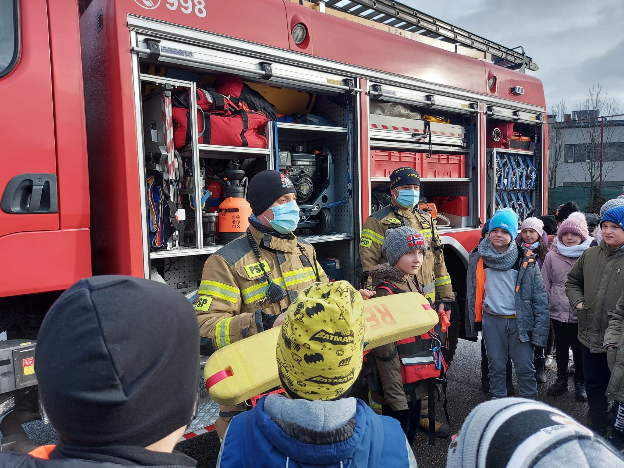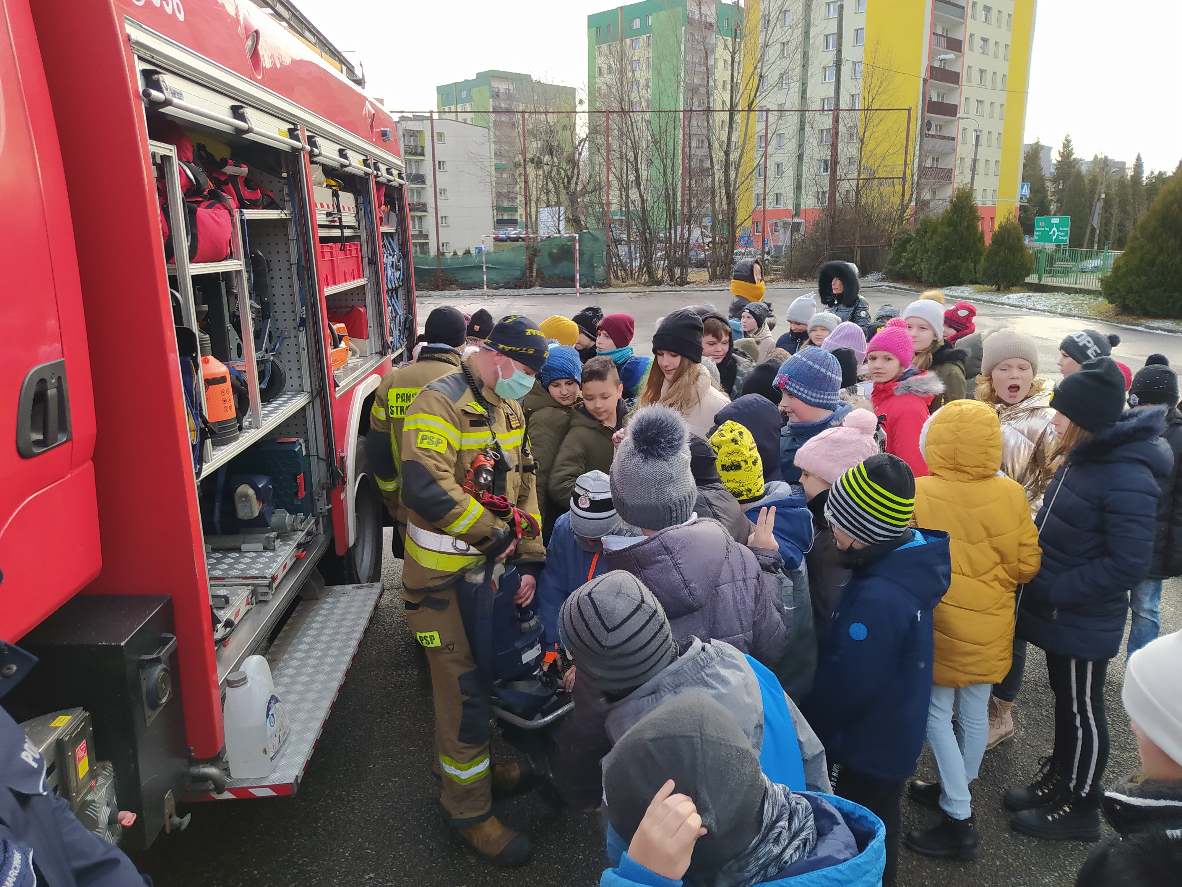 7 lutego w Szkole Podstawowej nr 10 im. J. Korczaka strażacy wspólnie z funkcjonariuszami Komendy Powiatowej Policji w Wodzisławiu Śląskim przeprowadzili prelekcję dla dzieci na temat bezpieczeństwa podczas ferii zimowych. Dzięki spotkaniu dzieci dowiedziały się, jak ważne jest noszenie odblasków na odzieży, jak niebezpieczne jest wchodzenie na niestrzeżone zbiorniki wodne pokryte lodem oraz jak należy zachowywać się na stokach oraz w górach. Dodatkową atrakcją była prezentacja policyjnego radiowozu oraz sprzętu ratowniczego jakim dysponują strażacy.