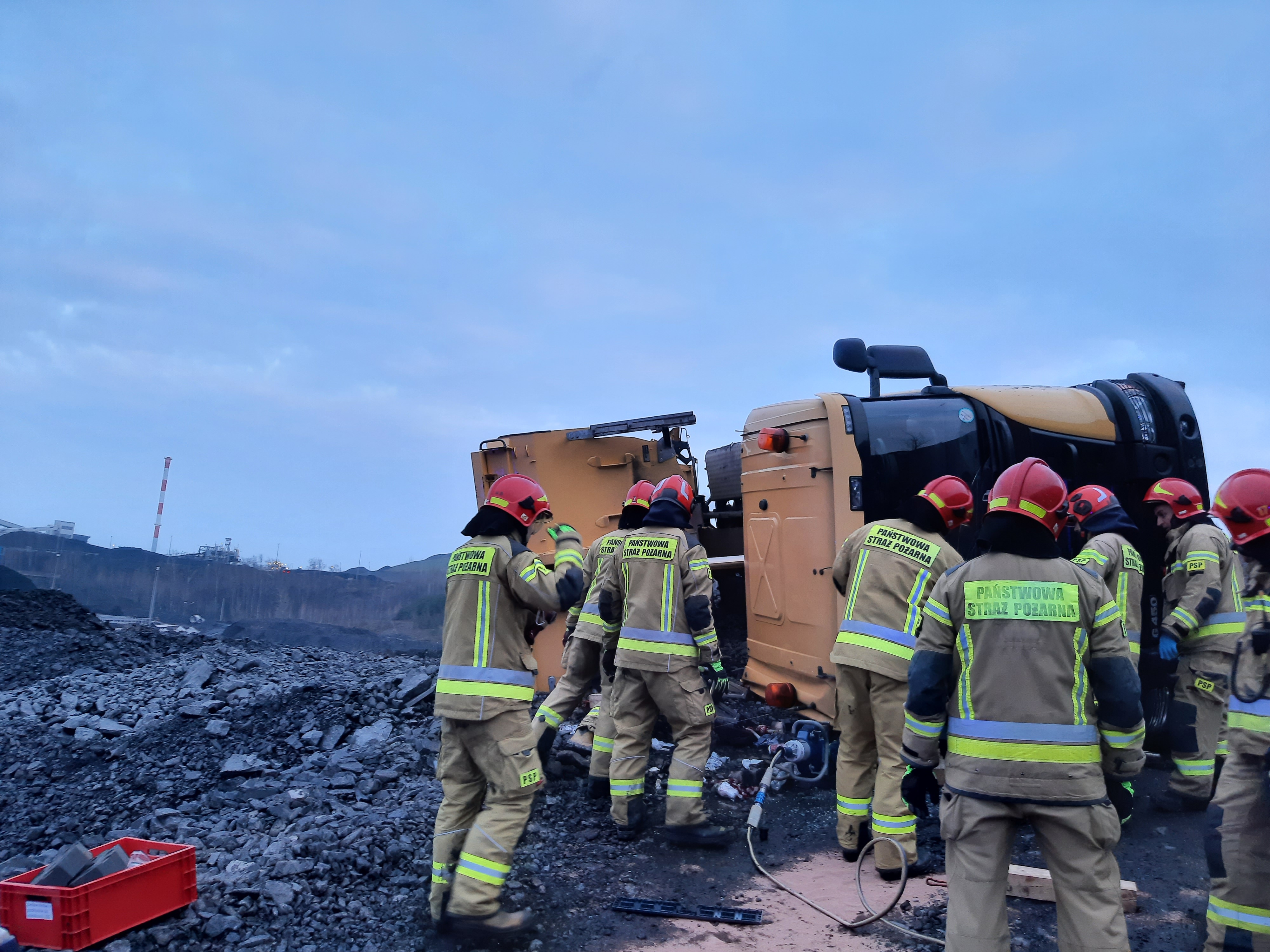 Po przyjeździe na miejsce zdarzenia, strażacy zastali przewrócony samochód ciężarowy, w którym uwięziony był kierowca. Używając specjalistycznego sprzętu, takiego jak rozpieracze ramieniowe, udało się podnieść kabinę ciężarówki i ewakuować kierowcę. Dodatkowo, aby zapewnić bezpieczeństwo działań, pojazd został ustabilizowany klinami i drewnianymi kantówkami. Uwolniony kierowca został natychmiast przekazany zespołowi ratownictwa medycznego.