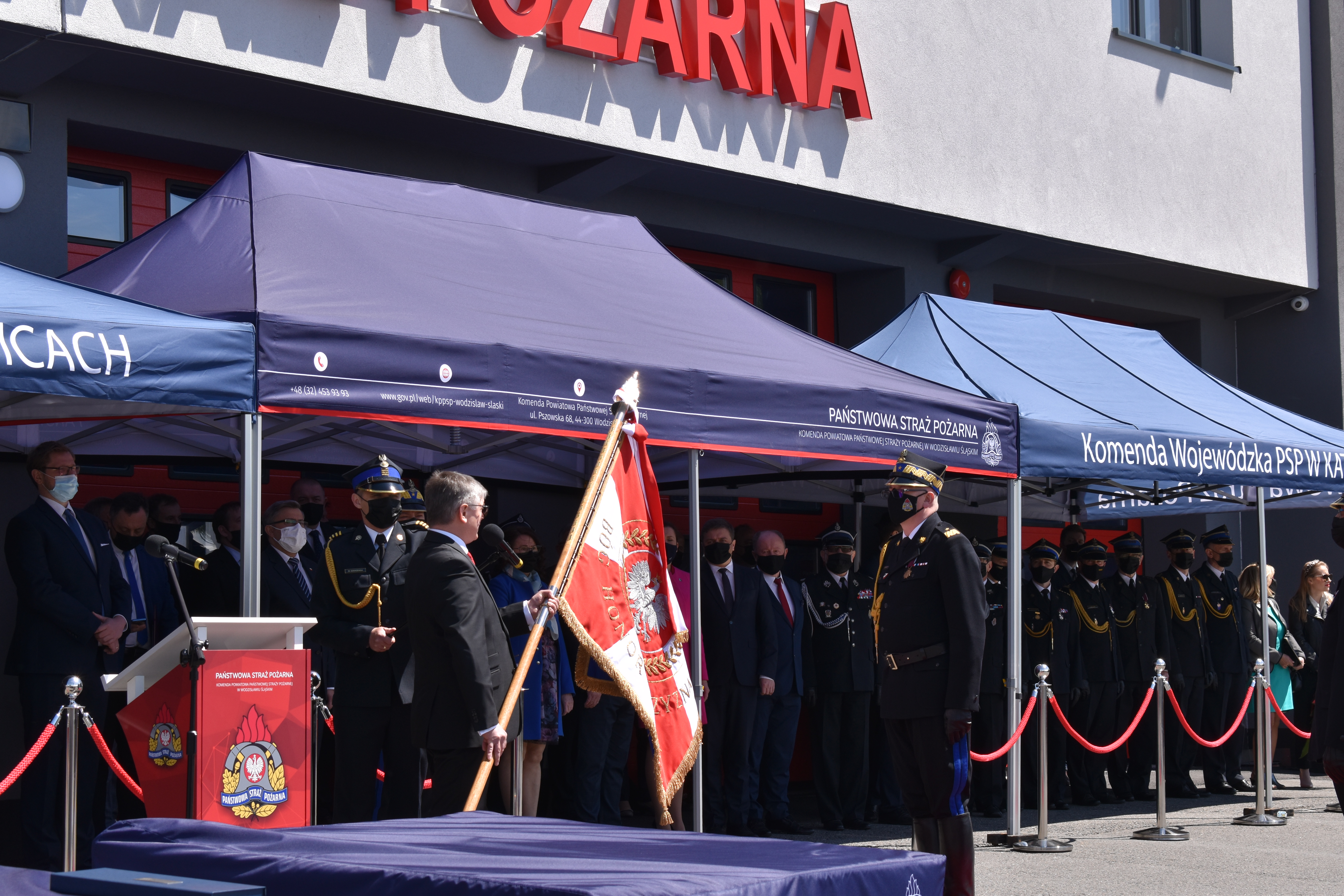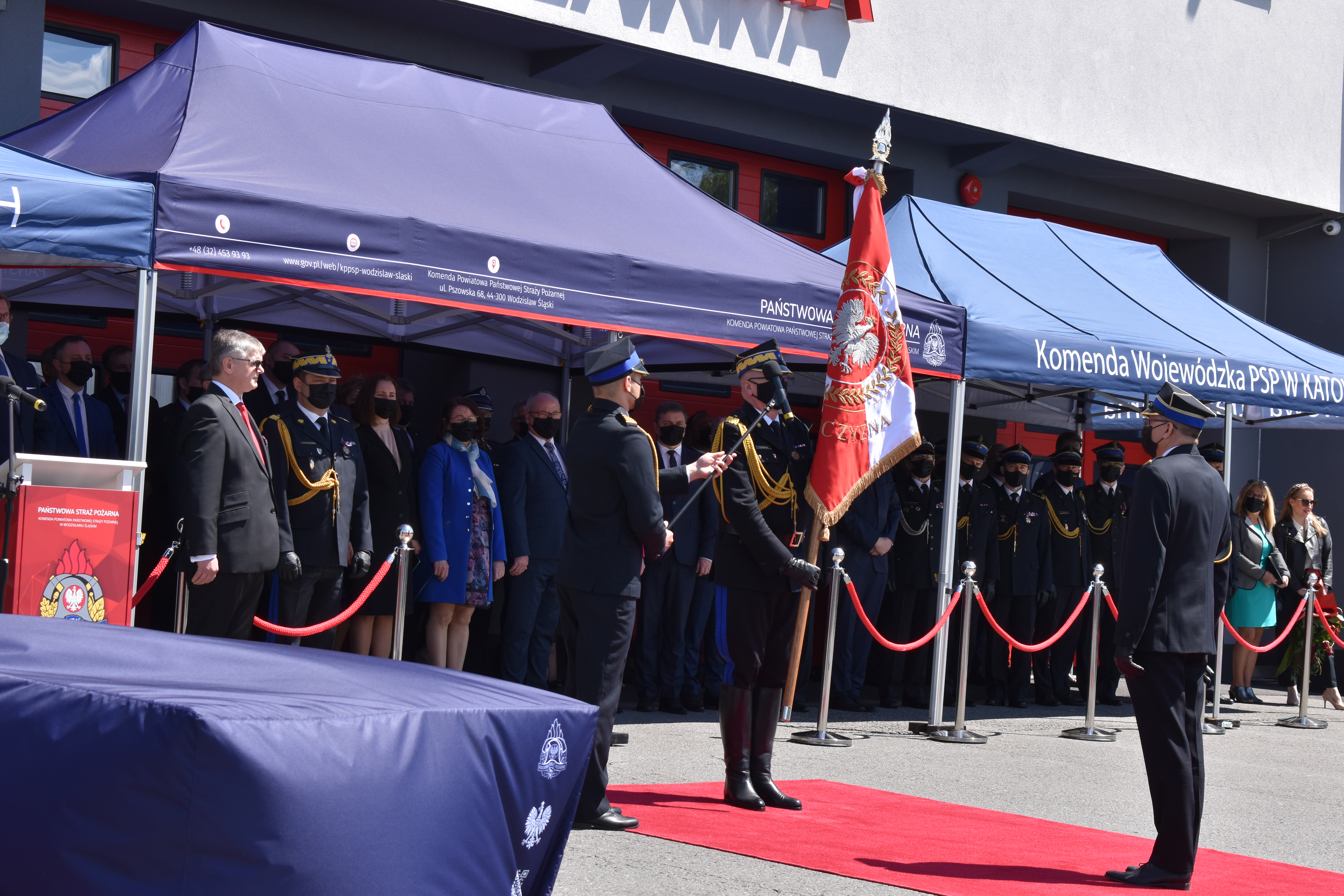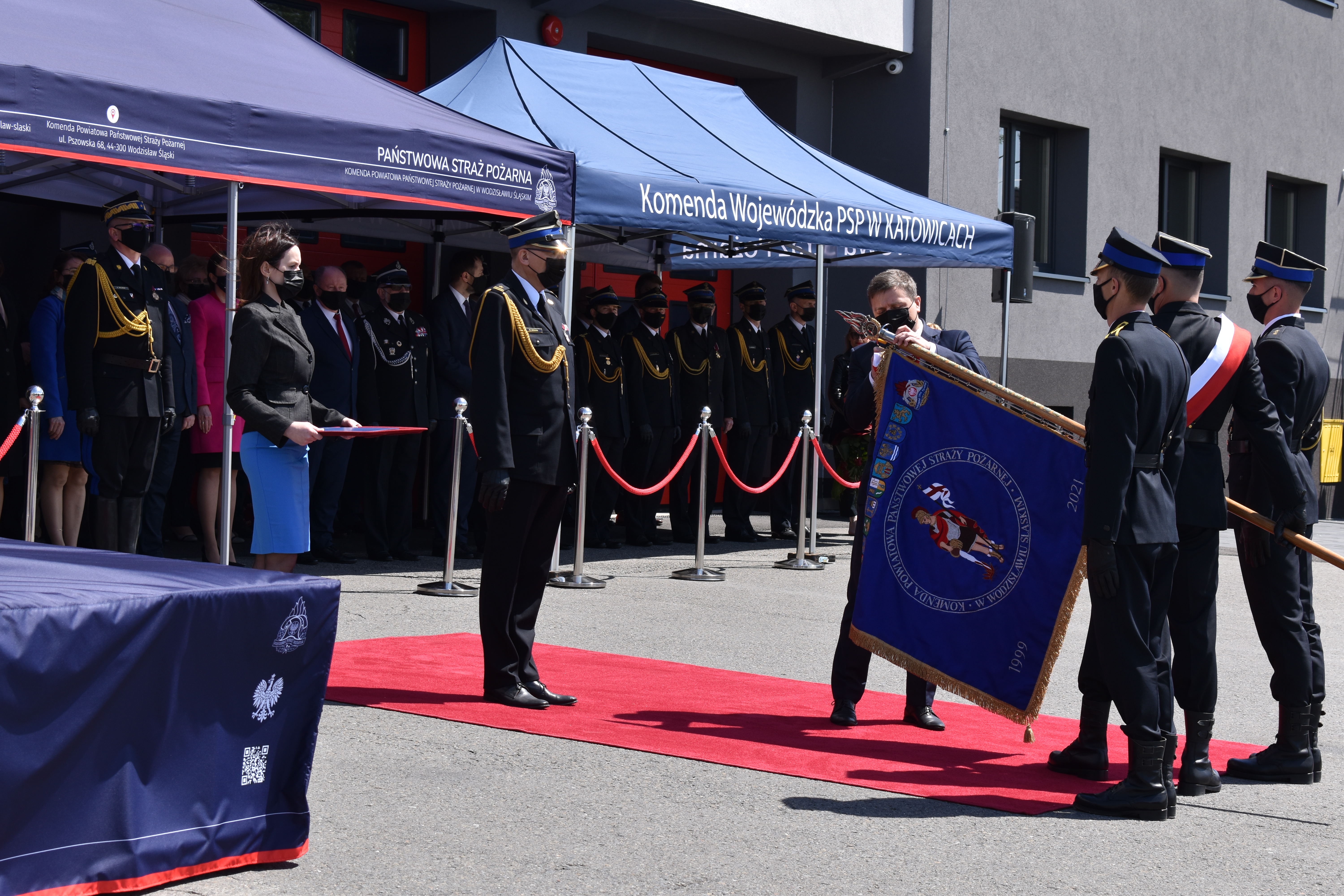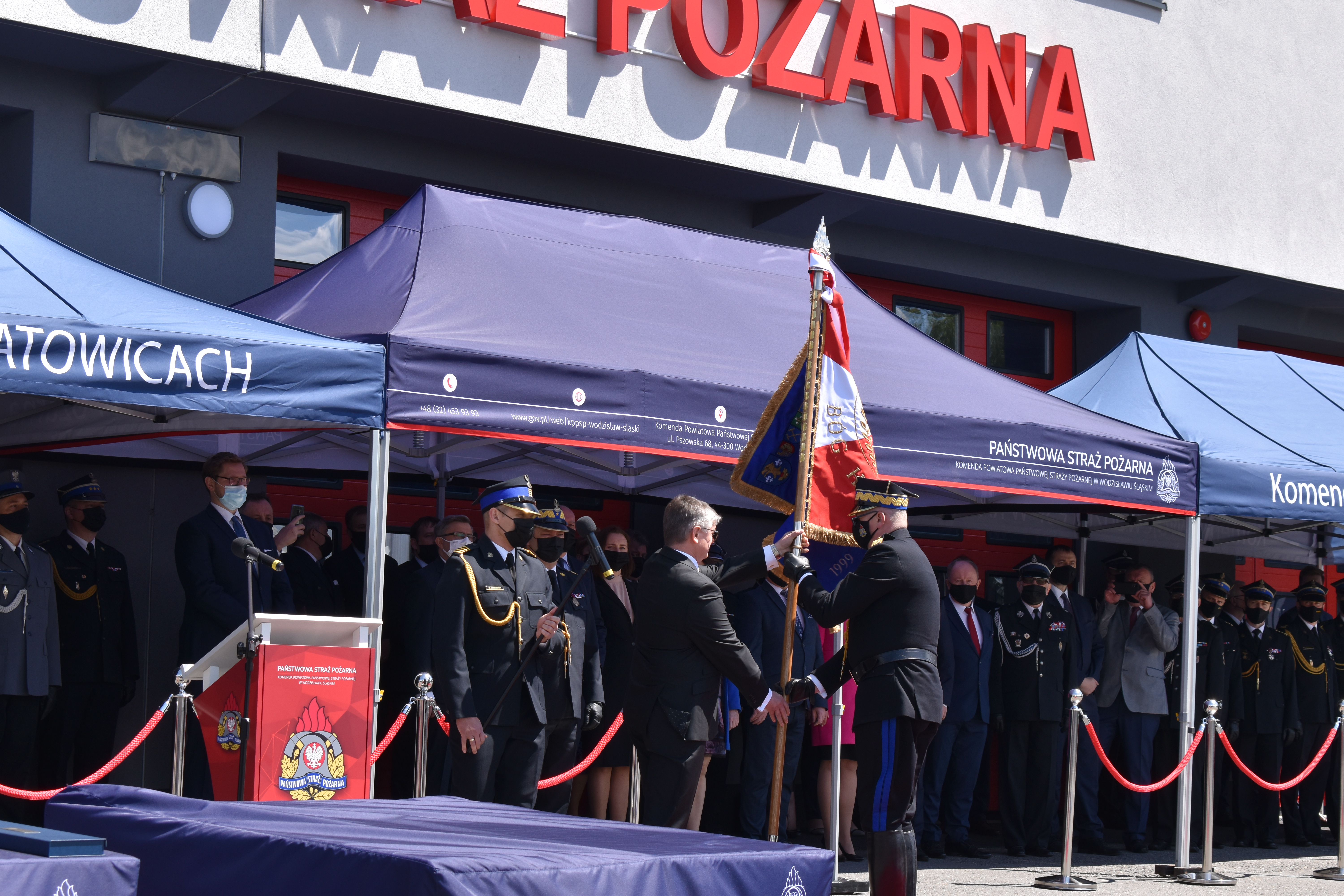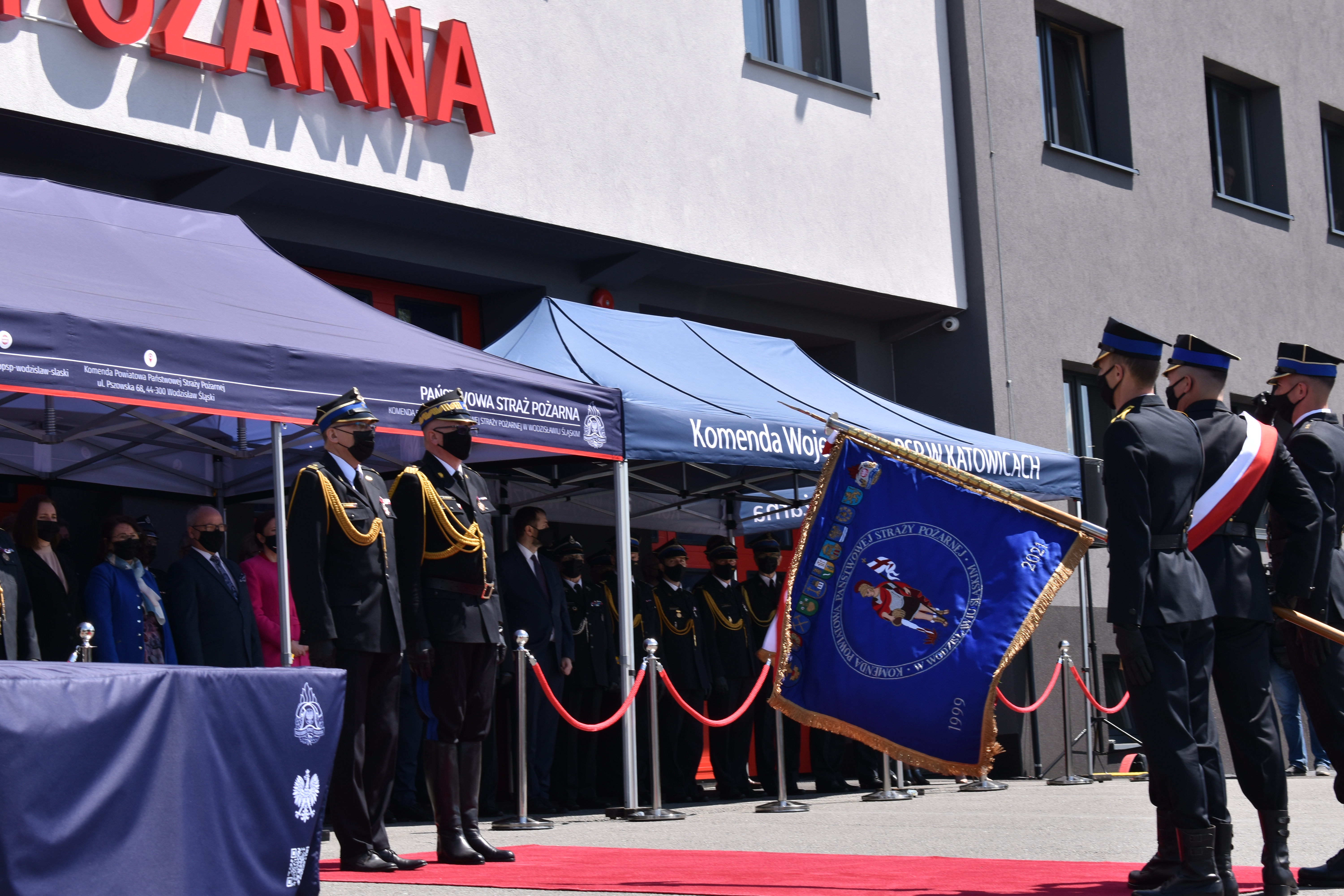 21 maja br. na terenie Komendy Powiatowej Państwowej Straży Pożarnej w Wodzisławiu Śląskim odbyły się Wojewódzkie Obchody Dnia Strażaka, połączone z uroczystym wręczeniem sztandaru Komendzie PSP w Wodzisławiu Śląskim oraz promocją na pierwszy stopień oficerski. W uroczystości wzięli udział: Michał Woś - sekretarz stanu w Ministerstwie Srpawiedliwości, Posłowie na Sejm Rzeczypospolitej Polskiej Pan Adam Gawęda, Pani Teresa Glenc, Pan Krzysztof Gadowski, Pani Senator Ewa Gawęda, Jarosław Wieczorek - wojewoda ślaski, Zastępca Komendanta Głównego PSP nadbryg. Krysztof Hejduk, Śląski Komendant Wojewódzki PSP nadbryg. Jacek Kleszczewski oraz pozostali zaproszeni goście. Ceremonia wręczenia sztandaru poprzedziła wręczenie dwóm naszym funkcjonariuszom Dyplomów Komendanta Głównego PSP za wzorową postawę i wysokie osiągnięcia w realizacji zadań służbowych, jak również promowanie na pierwszy stopień oficerski jednego funkcjonariusza KP PSP w Wodzisławiu Śląskim.