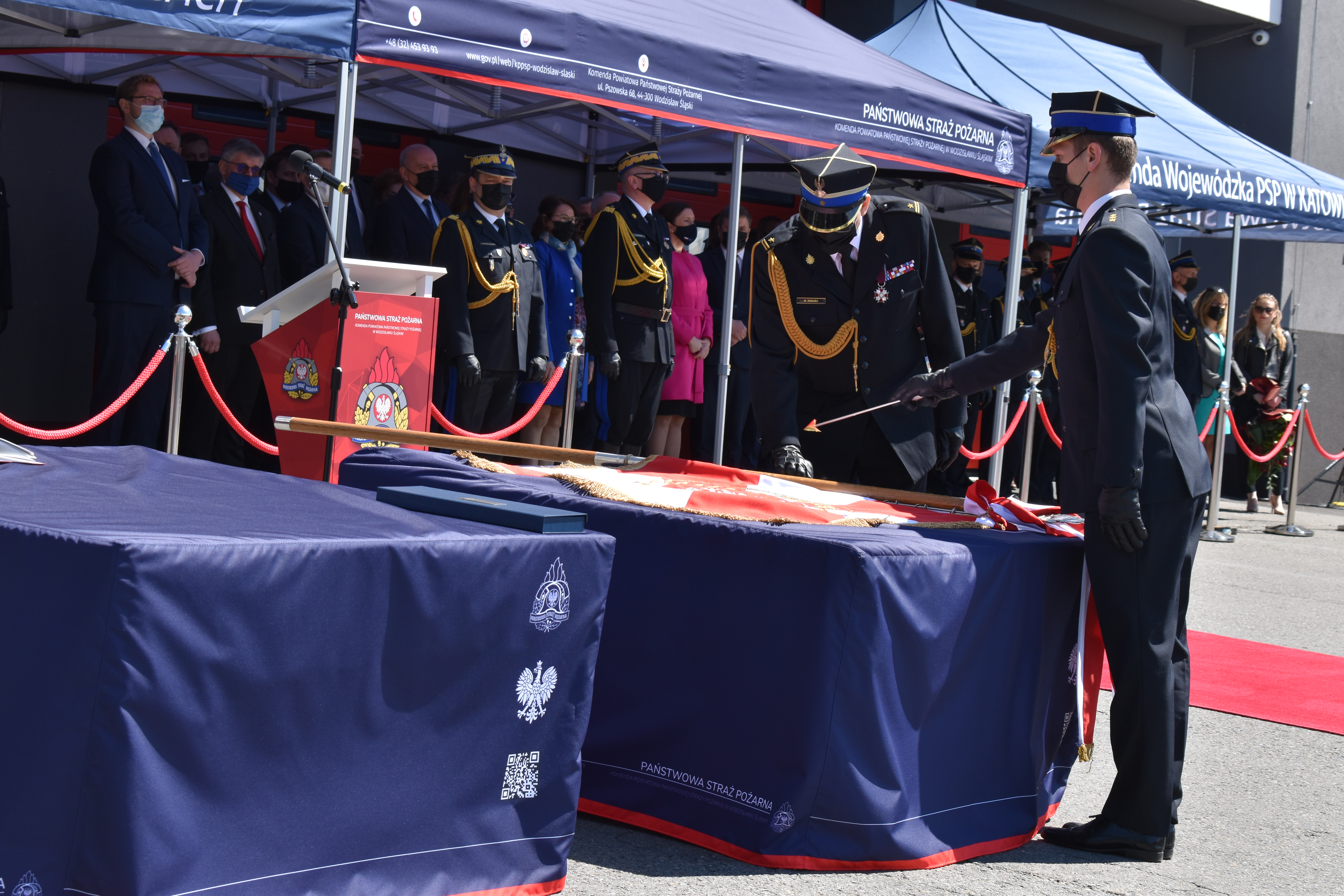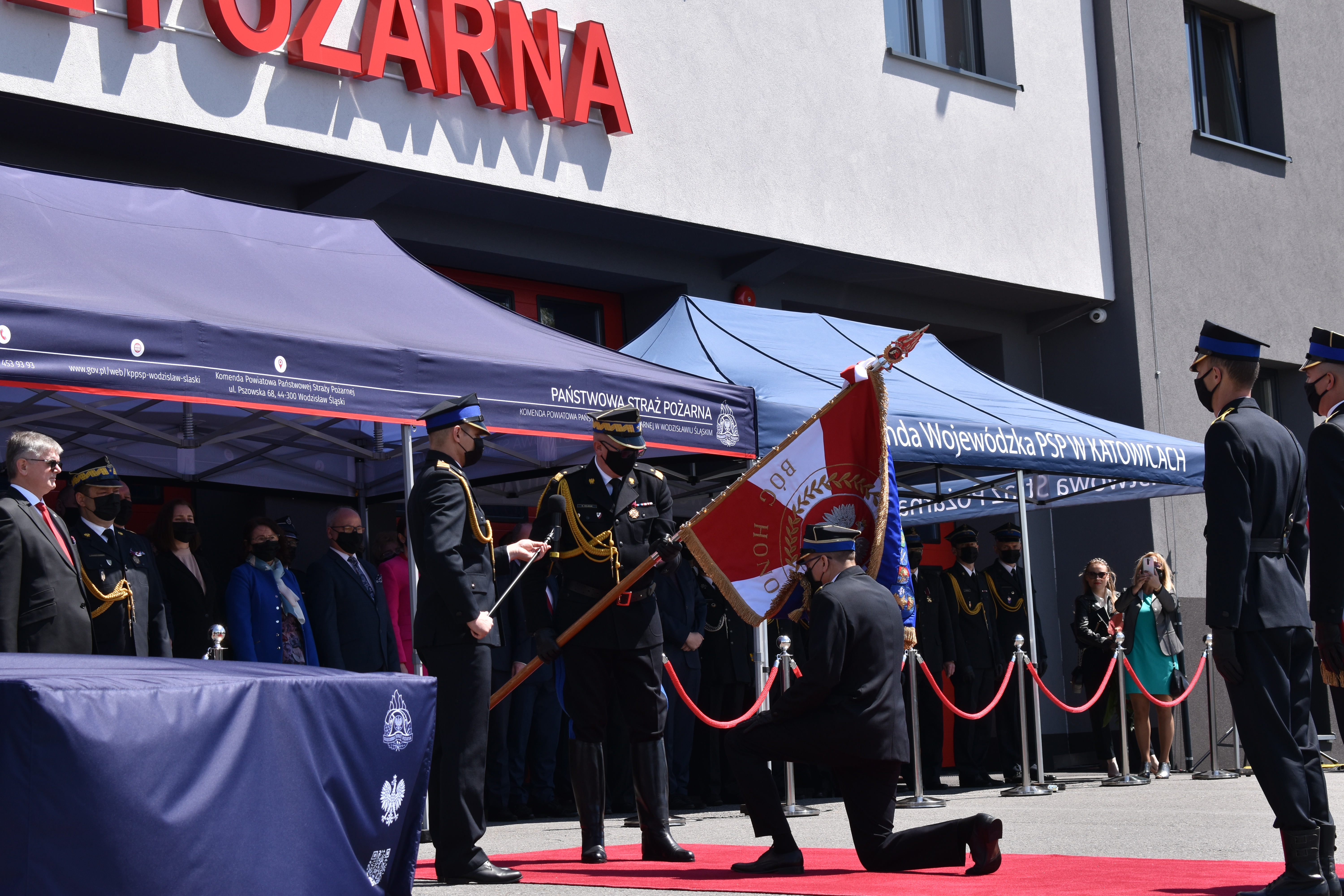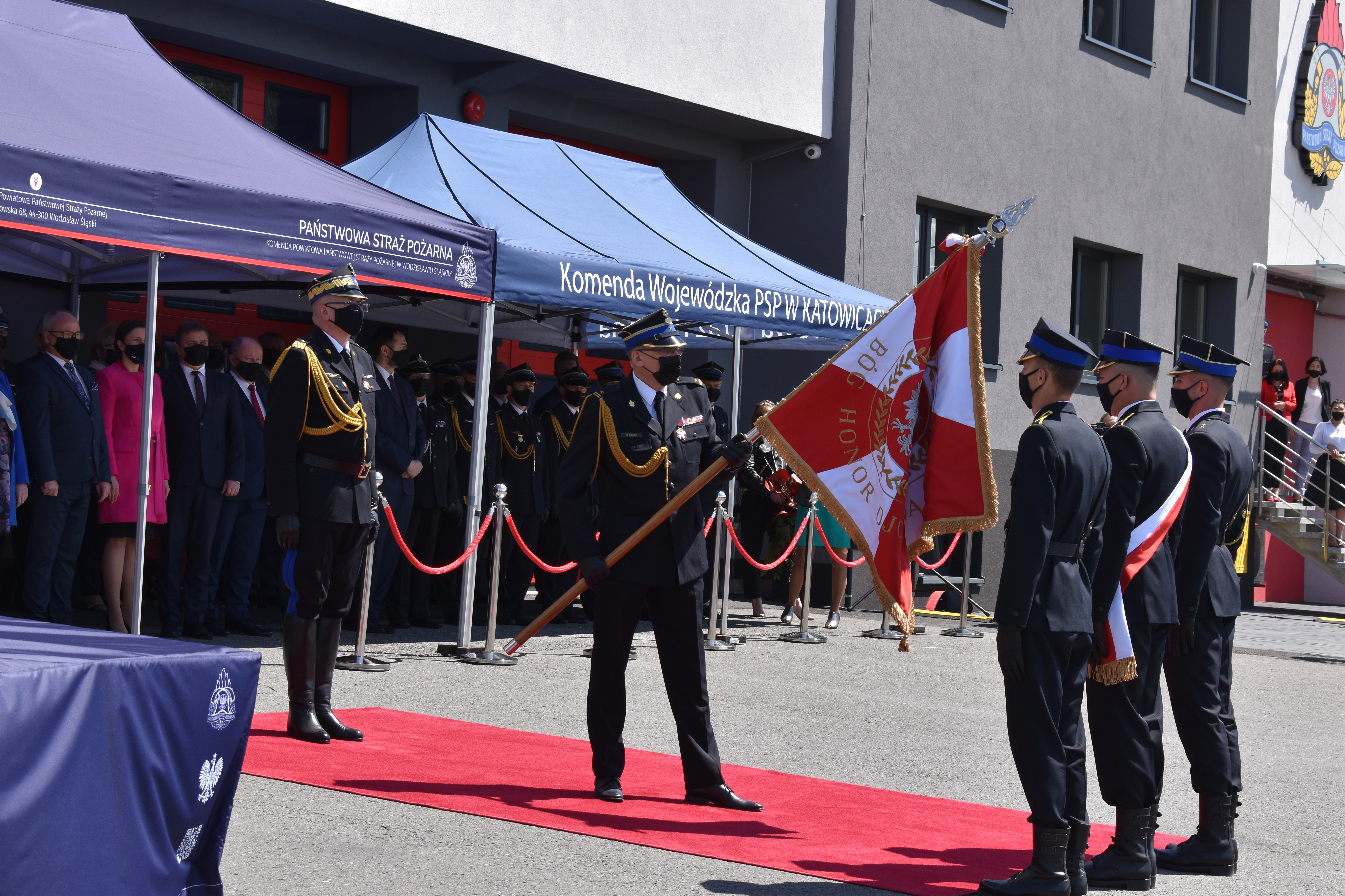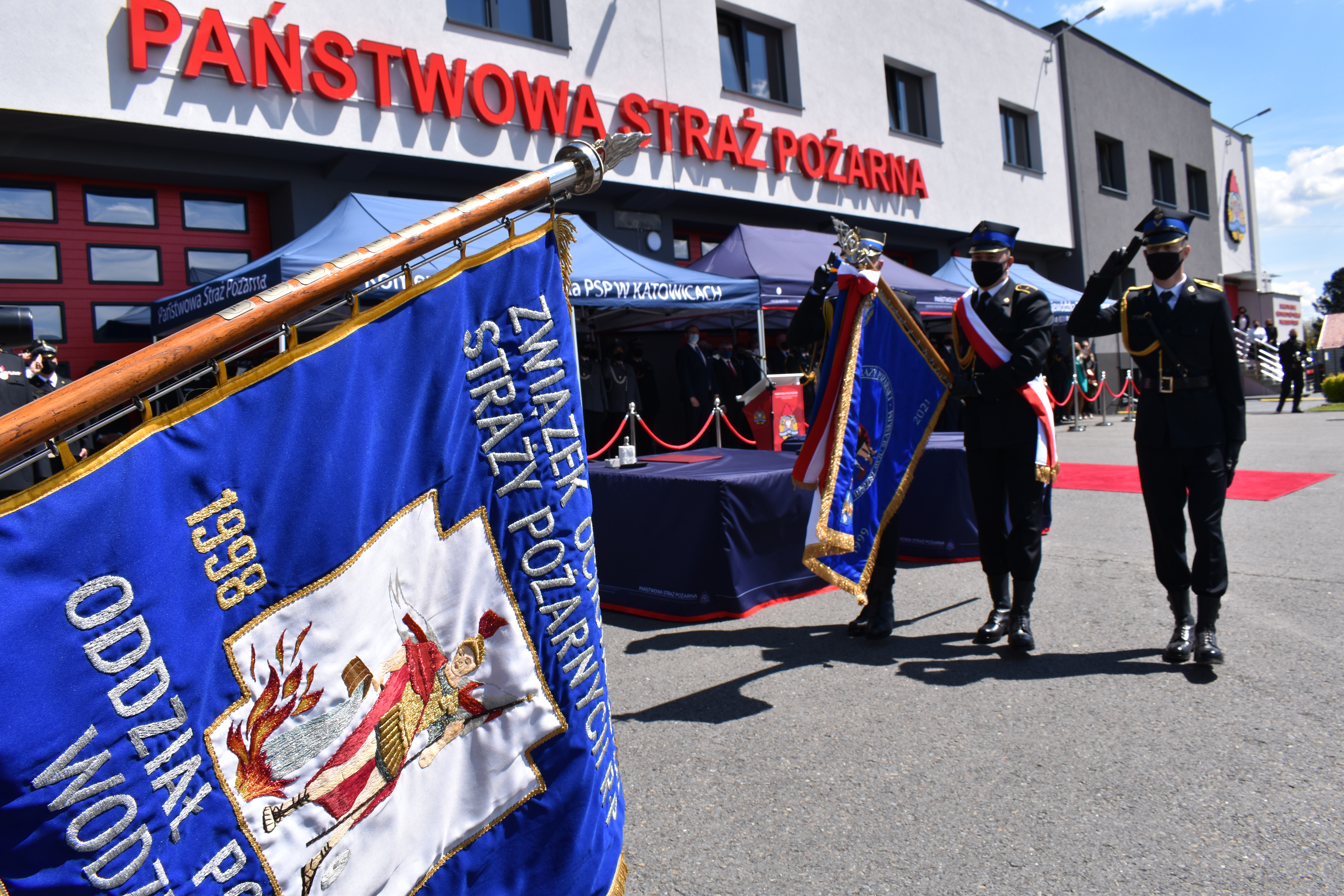 21 maja br. na terenie Komendy Powiatowej Państwowej Straży Pożarnej w Wodzisławiu Śląskim odbyły się Wojewódzkie Obchody Dnia Strażaka, połączone z uroczystym wręczeniem sztandaru Komendzie PSP w Wodzisławiu Śląskim oraz promocją na pierwszy stopień oficerski. W uroczystości wzięli udział: Michał Woś - sekretarz stanu w Ministerstwie Srpawiedliwości, Posłowie na Sejm Rzeczypospolitej Polskiej Pan Adam Gawęda, Pani Teresa Glenc, Pan Krzysztof Gadowski, Pani Senator Ewa Gawęda, Jarosław Wieczorek - wojewoda ślaski, Zastępca Komendanta Głównego PSP nadbryg. Krysztof Hejduk, Śląski Komendant Wojewódzki PSP nadbryg. Jacek Kleszczewski oraz pozostali zaproszeni goście. Ceremonia wręczenia sztandaru poprzedziła wręczenie dwóm naszym funkcjonariuszom Dyplomów Komendanta Głównego PSP za wzorową postawę i wysokie osiągnięcia w realizacji zadań służbowych, jak również promowanie na pierwszy stopień oficerski jednego funkcjonariusza KP PSP w Wodzisławiu Śląskim.