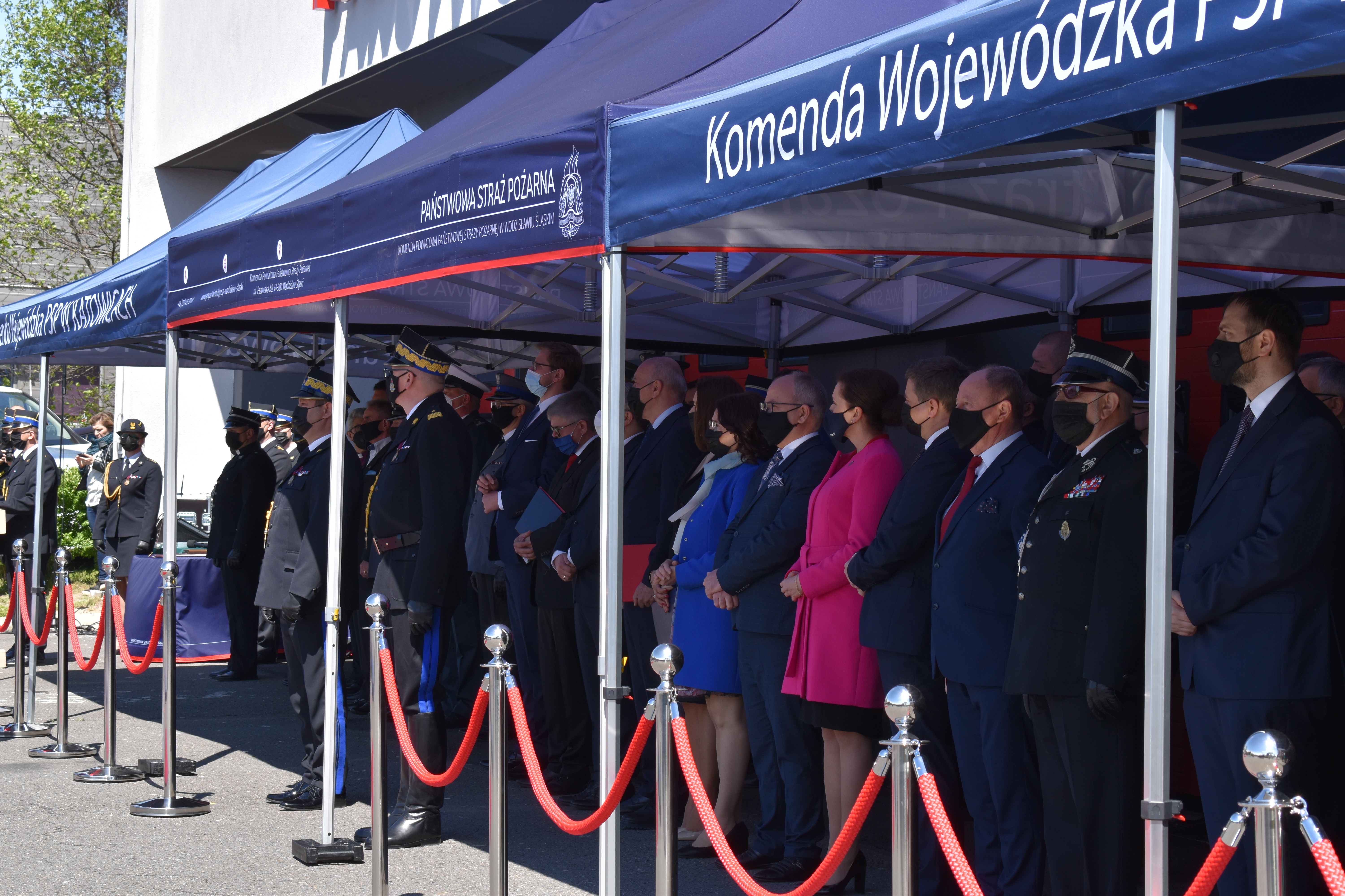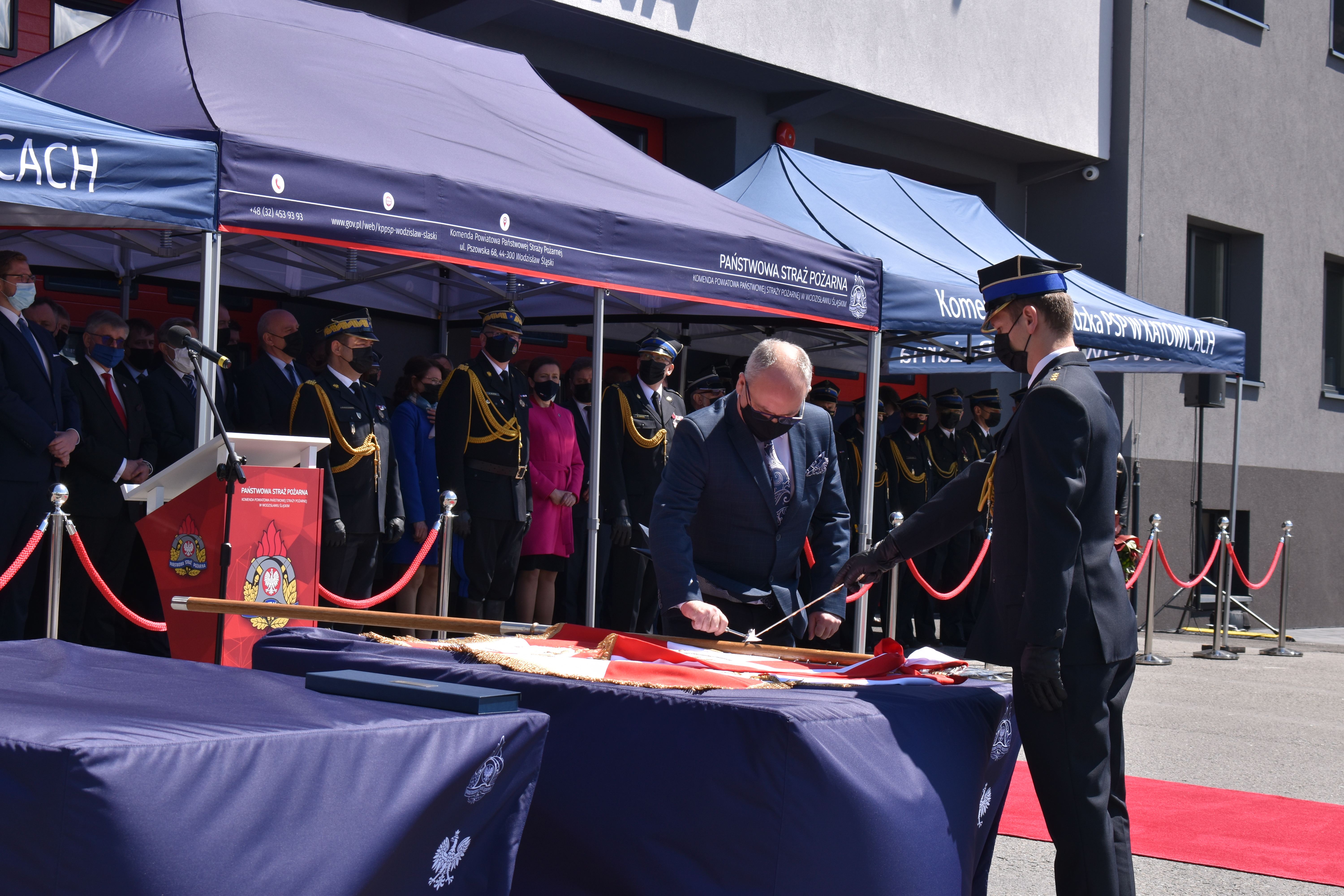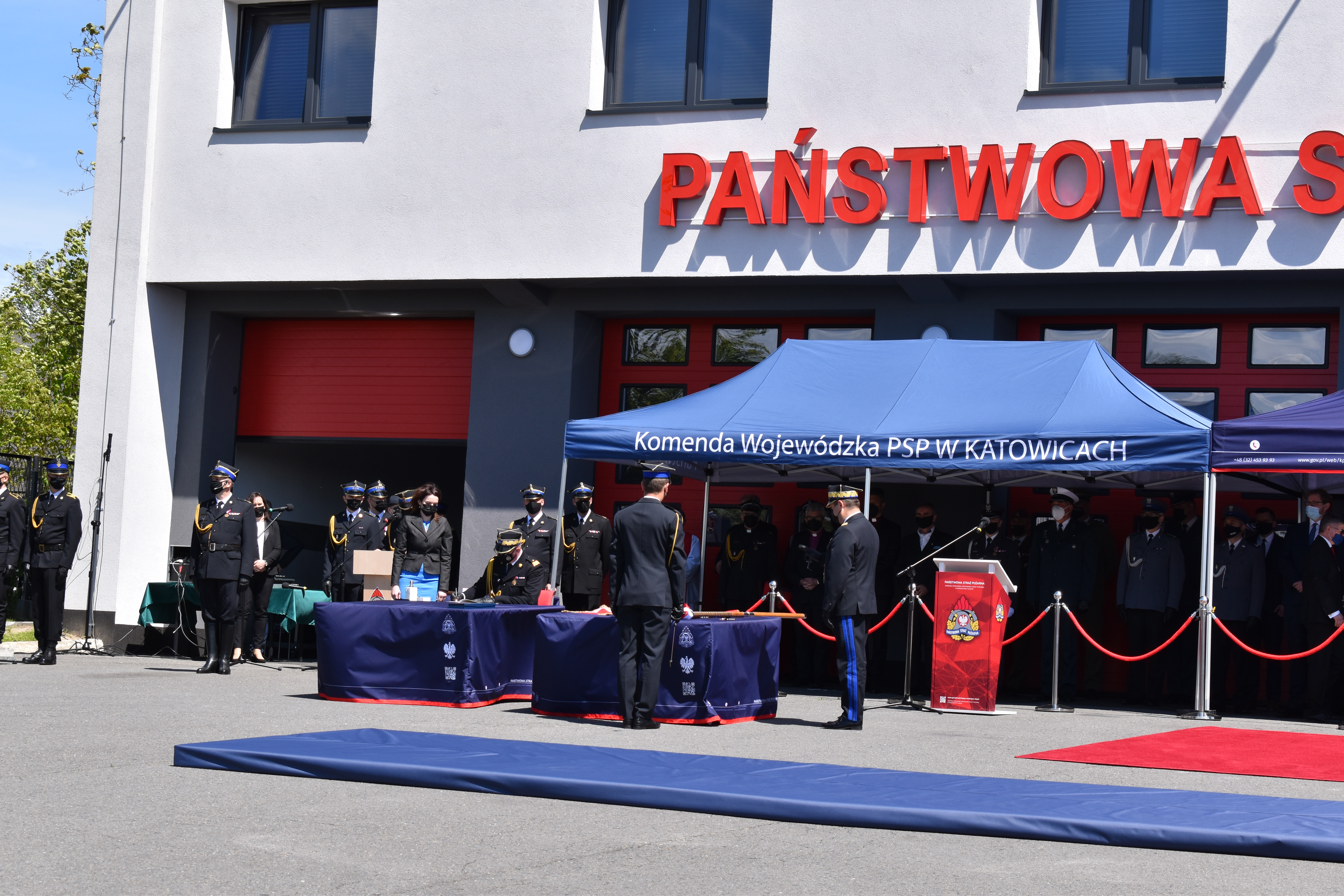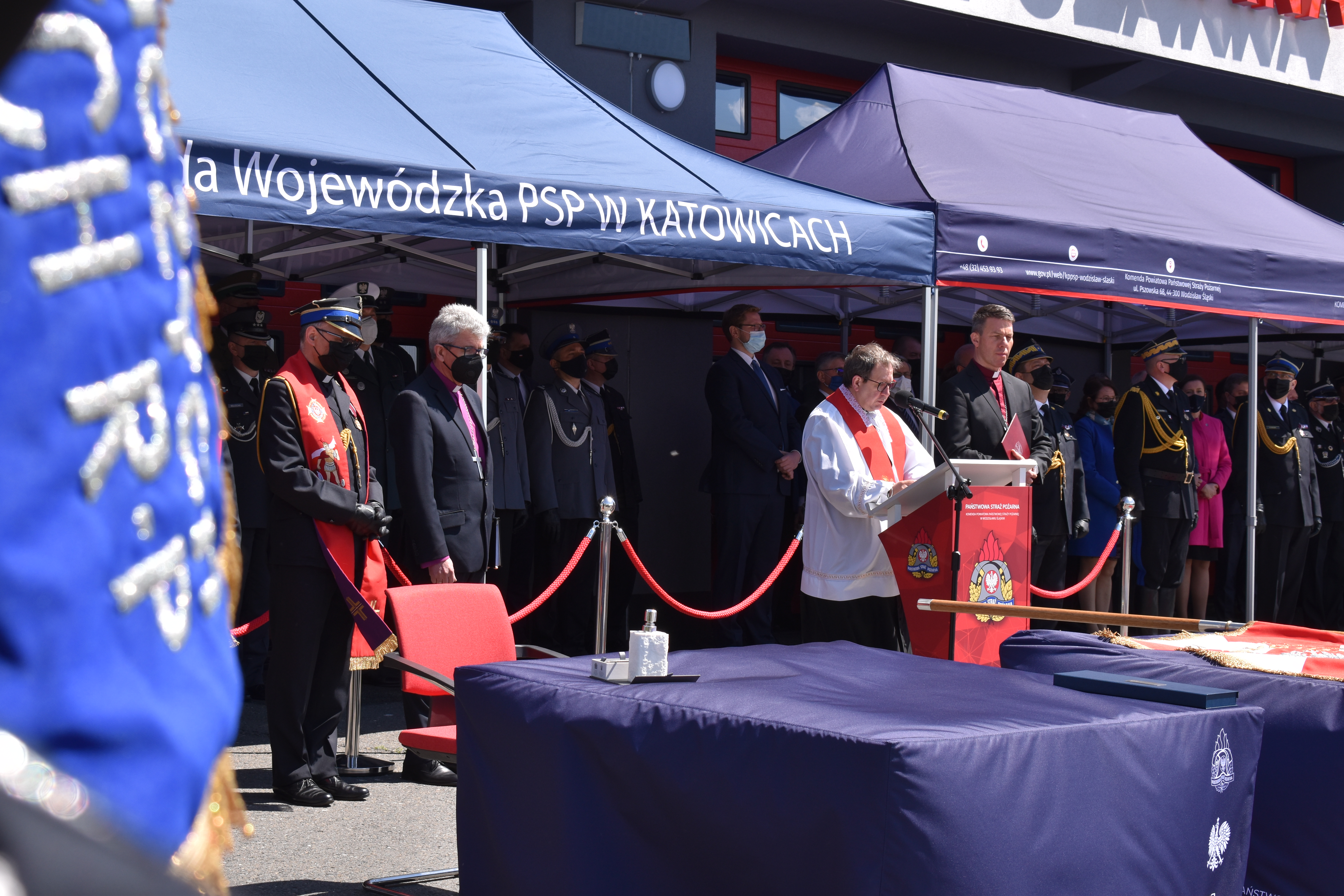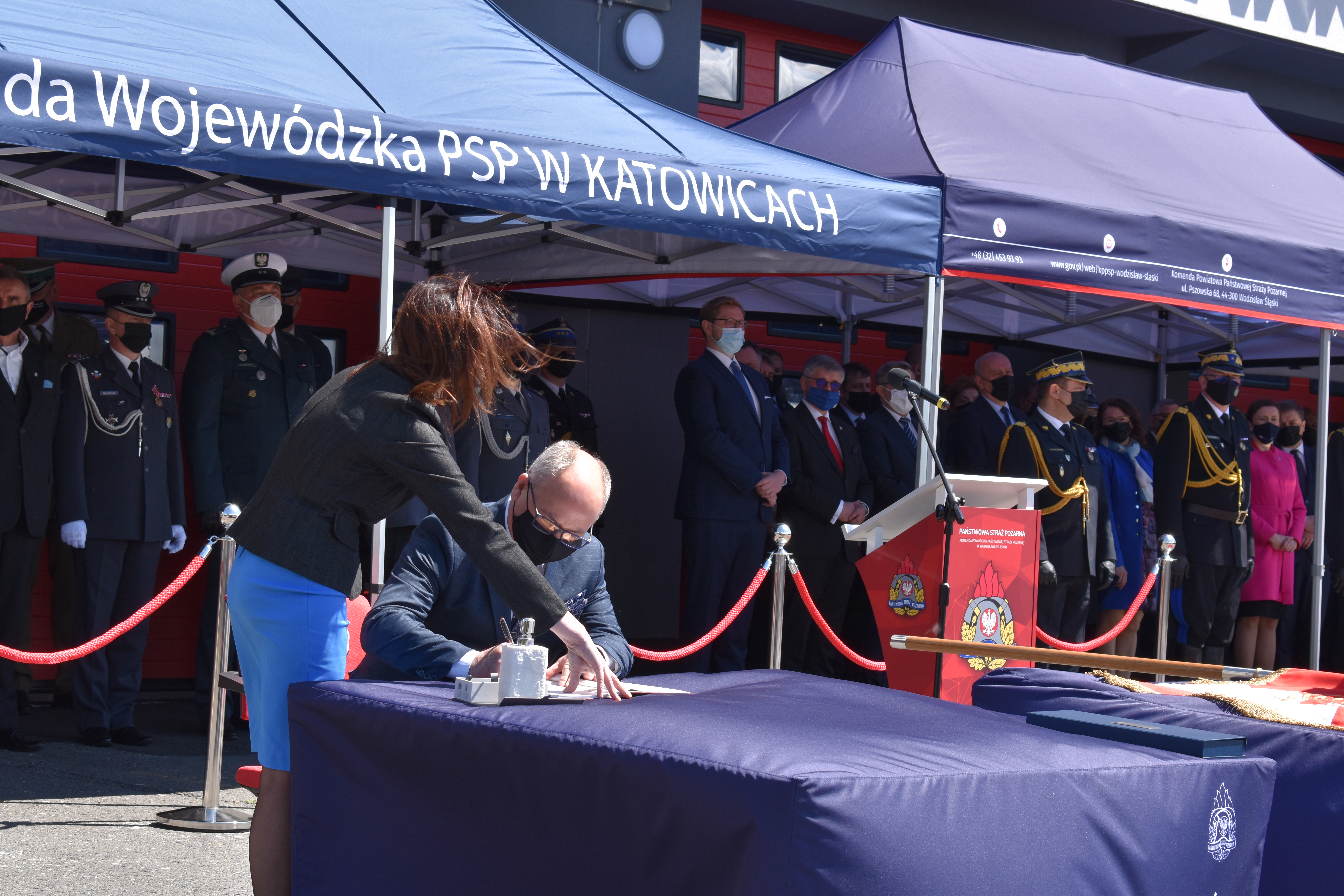 21 maja br. na terenie Komendy Powiatowej Państwowej Straży Pożarnej w Wodzisławiu Śląskim odbyły się Wojewódzkie Obchody Dnia Strażaka, połączone z uroczystym wręczeniem sztandaru Komendzie PSP w Wodzisławiu Śląskim oraz promocją na pierwszy stopień oficerski. W uroczystości wzięli udział: Michał Woś - sekretarz stanu w Ministerstwie Srpawiedliwości, Posłowie na Sejm Rzeczypospolitej Polskiej Pan Adam Gawęda, Pani Teresa Glenc, Pan Krzysztof Gadowski, Pani Senator Ewa Gawęda, Jarosław Wieczorek - wojewoda ślaski, Zastępca Komendanta Głównego PSP nadbryg. Krysztof Hejduk, Śląski Komendant Wojewódzki PSP nadbryg. Jacek Kleszczewski oraz pozostali zaproszeni goście. Ceremonia wręczenia sztandaru poprzedziła wręczenie dwóm naszym funkcjonariuszom Dyplomów Komendanta Głównego PSP za wzorową postawę i wysokie osiągnięcia w realizacji zadań służbowych, jak również promowanie na pierwszy stopień oficerski jednego funkcjonariusza KP PSP w Wodzisławiu Śląskim.