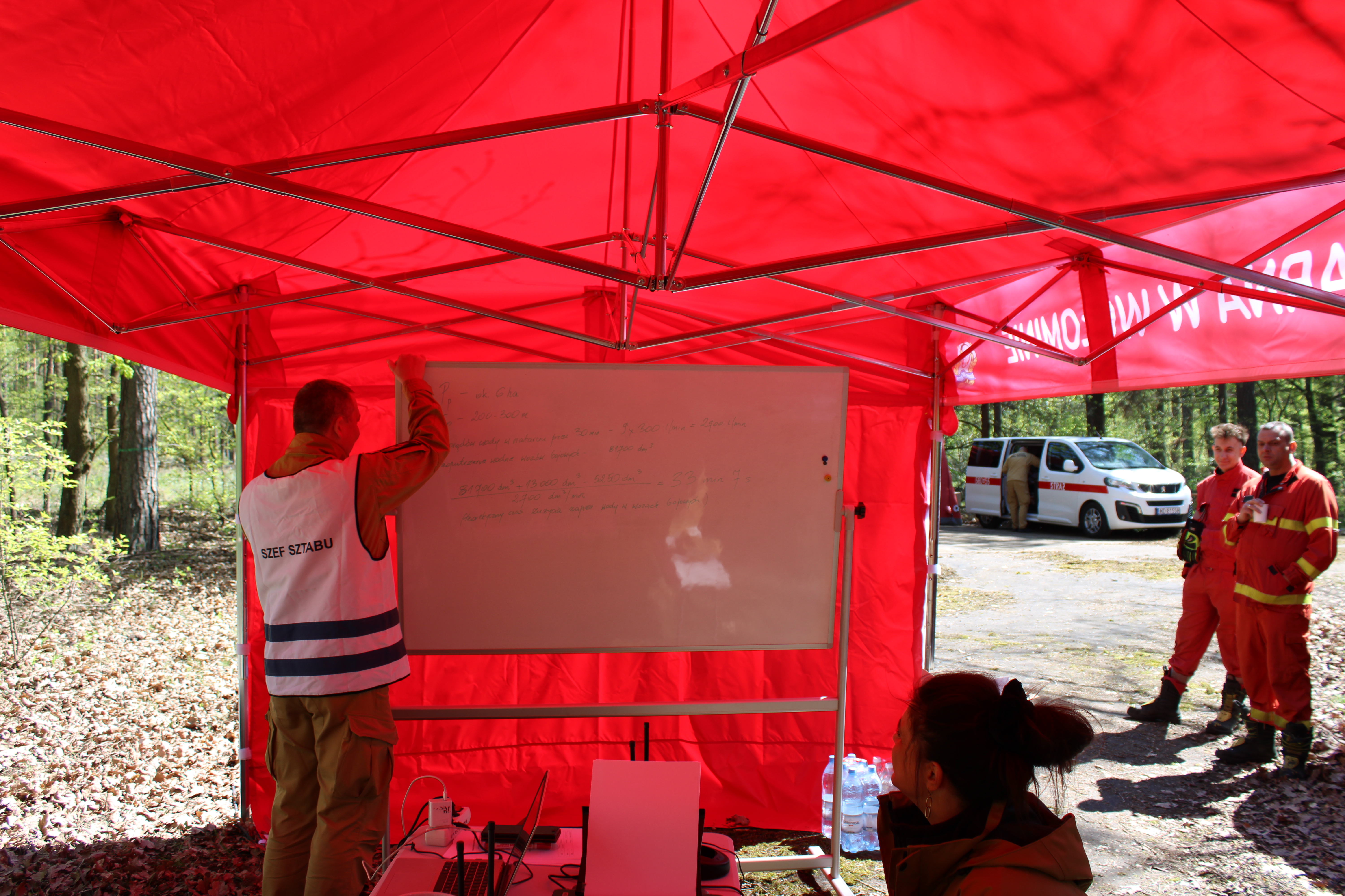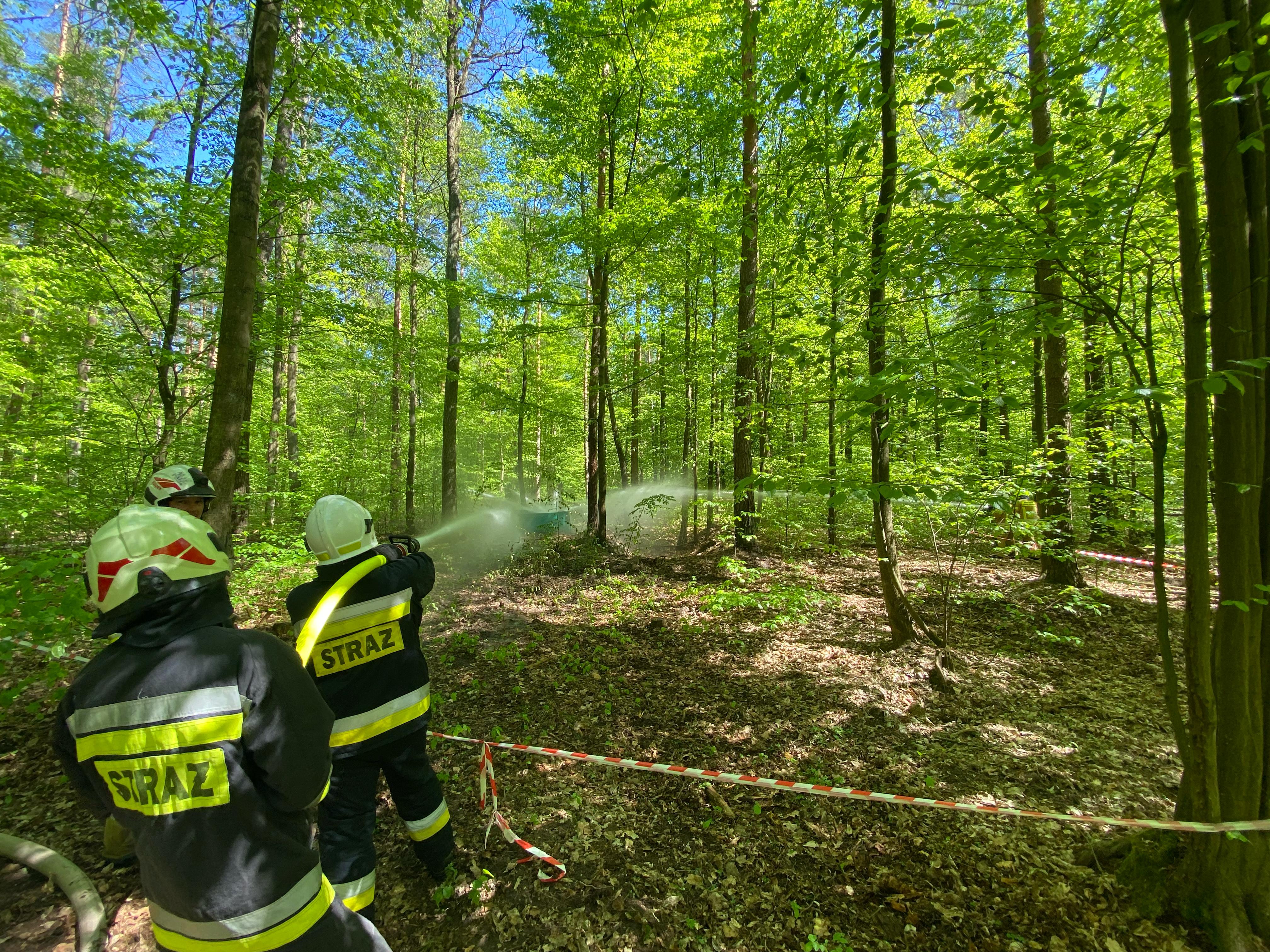 Ok. godziny 10:30 do Stanowiska Kierowania Komendanta Powiatowego PSP wpłynęło zgłoszenie o pożarze lasu. Zdarzenie zauważył Dyżurny Punktu Alarmowo-Dyspozycyjnego Nadleśnictwa Drewnica i niezwłocznie zadysponował na miejsce patrol strażaków. Po przybyciu na miejsce zastali pożar poszycia leśnego oraz częściowo całego drzewostanu na powierzchni kilku hektarów. Pożar nadal się rozprzestrzeniał. Na miejsce przybyły dodatkowe pojazdy strażackie i przystąpiły do gaszenia. Dyżurny SKKP w Wołominie zadysponował również powiatowy pluton gaśniczy „LAS” oraz grupę operacyjną KP PSP w Wołominie. Zawiązano sztab akcji, który wspierał Kierującego Działaniem Ratowniczym. W kulminacyjnym momencie ćwiczący zrealizowali natarcie na zlokalizowany pożar siłą 12 prądów wody. Zaopatrzenie realizowano systemem mieszanym – dowożenie i przetłaczanie – z pobliskiej rzeki.