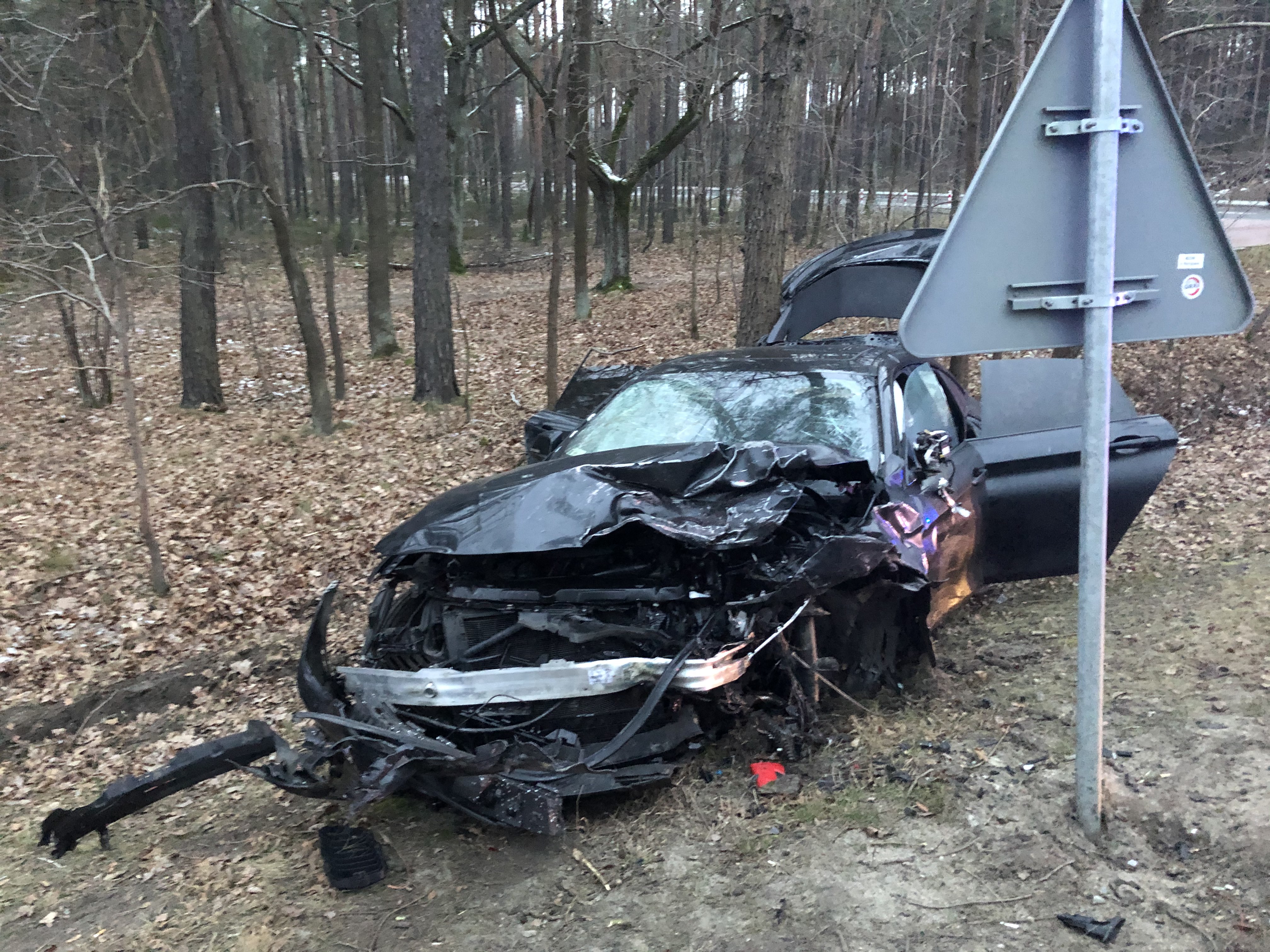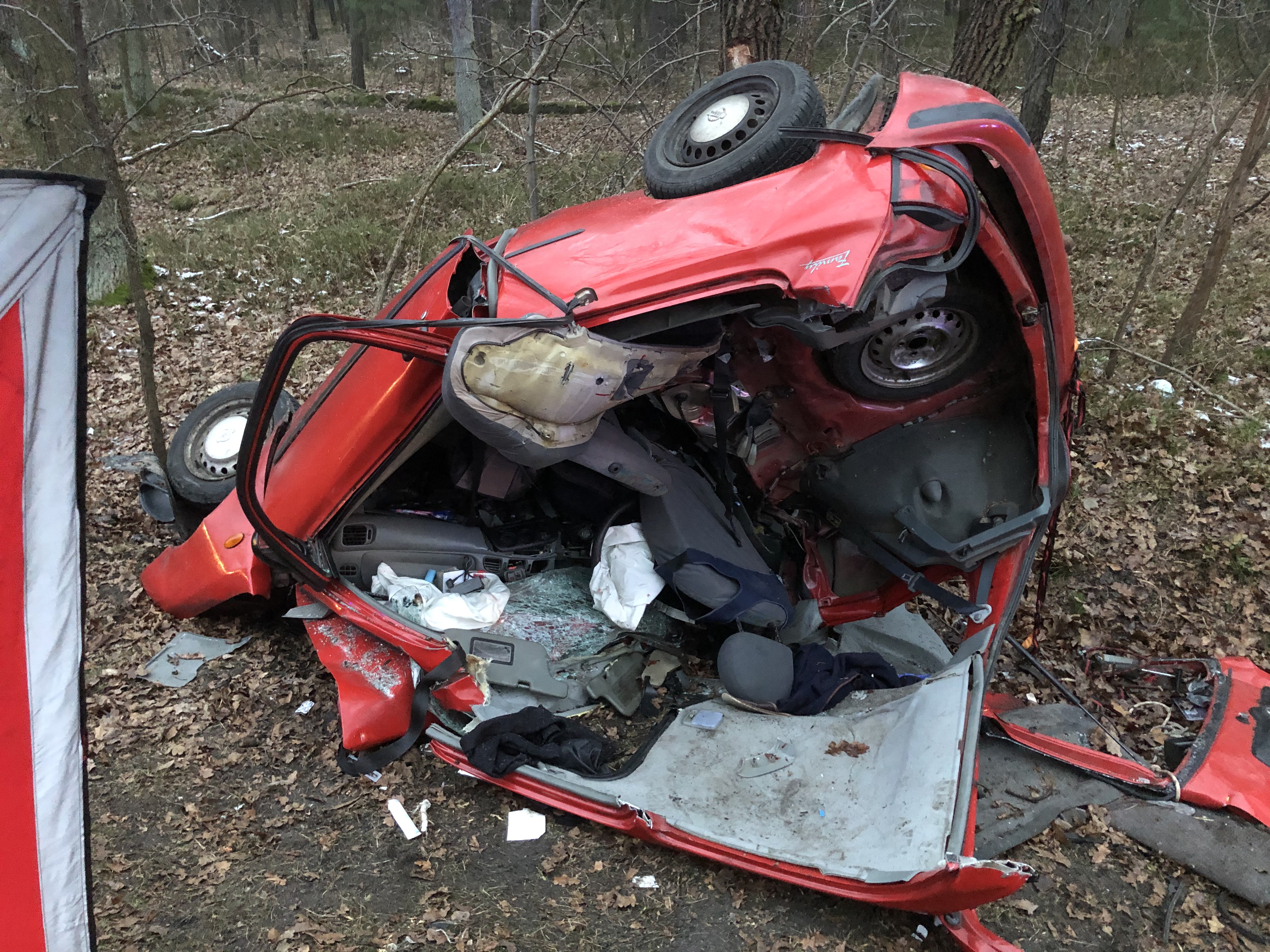 Do zdarzenia doszło w godzinach popołudniowych na zalesionym odcinku drogi. Przybyłe na miejsce jednostki straży zastały dwa samochody Nissana oraz BMW po zderzeniu czołowym. Kierujący BMW o własnych siłach opuścił pojazd, natomiast osoby podróżujące Nissanem zostały zakleszczone w całkowicie zniszczonym aucie. Działania strażaków polegały na zabezpieczeniu miejsca zdarzenia, następnie za pomocą sprzętu specjalistycznego wykonaniu dostępu do osób poszkodowanych. Po zakończeniu czynności dochodzeniowo śledczych prowadzonych przez policję usunięto z jezdni pozostałości po zdarzeniu.