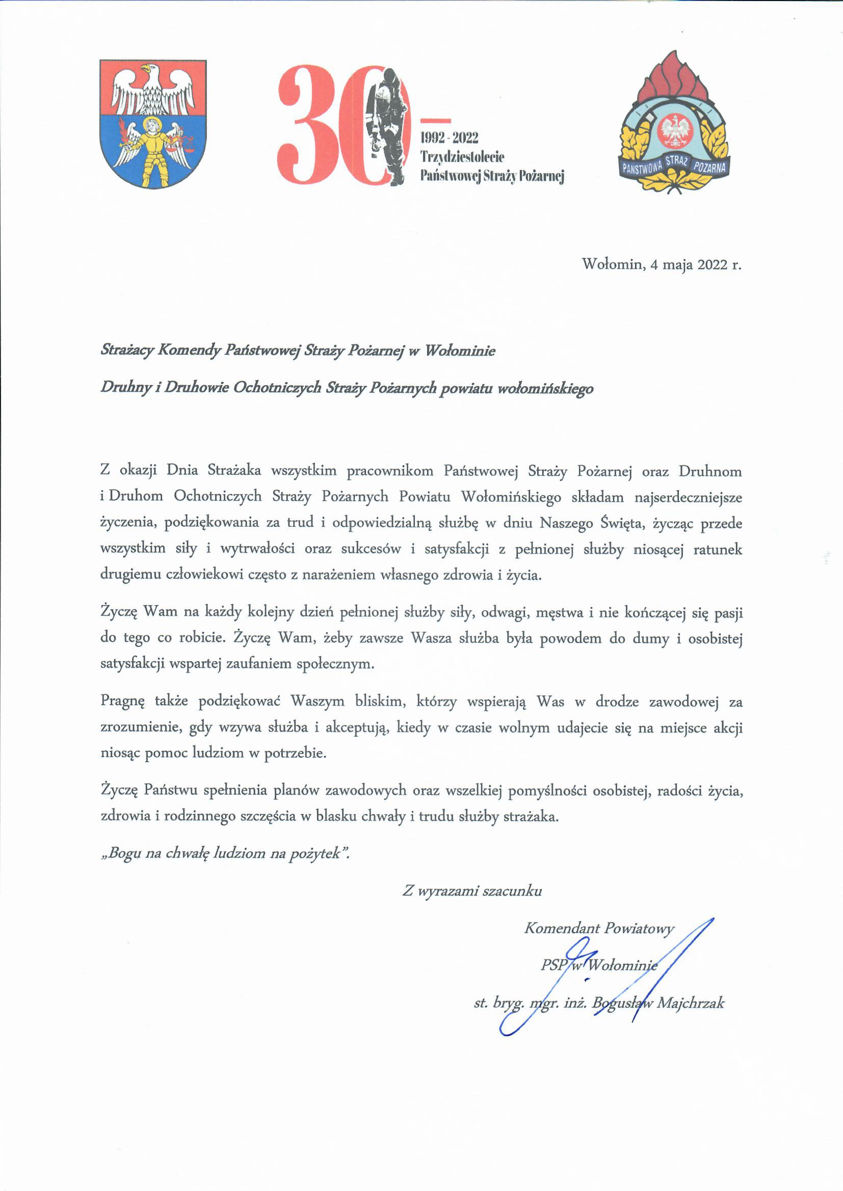 List Komendanta Powiatowego PSP w Wołominie z okazji Dnia Strażaka 04.05.2022 Zdjęcia (1) Pokaż zdjęcie 1 z galerii.