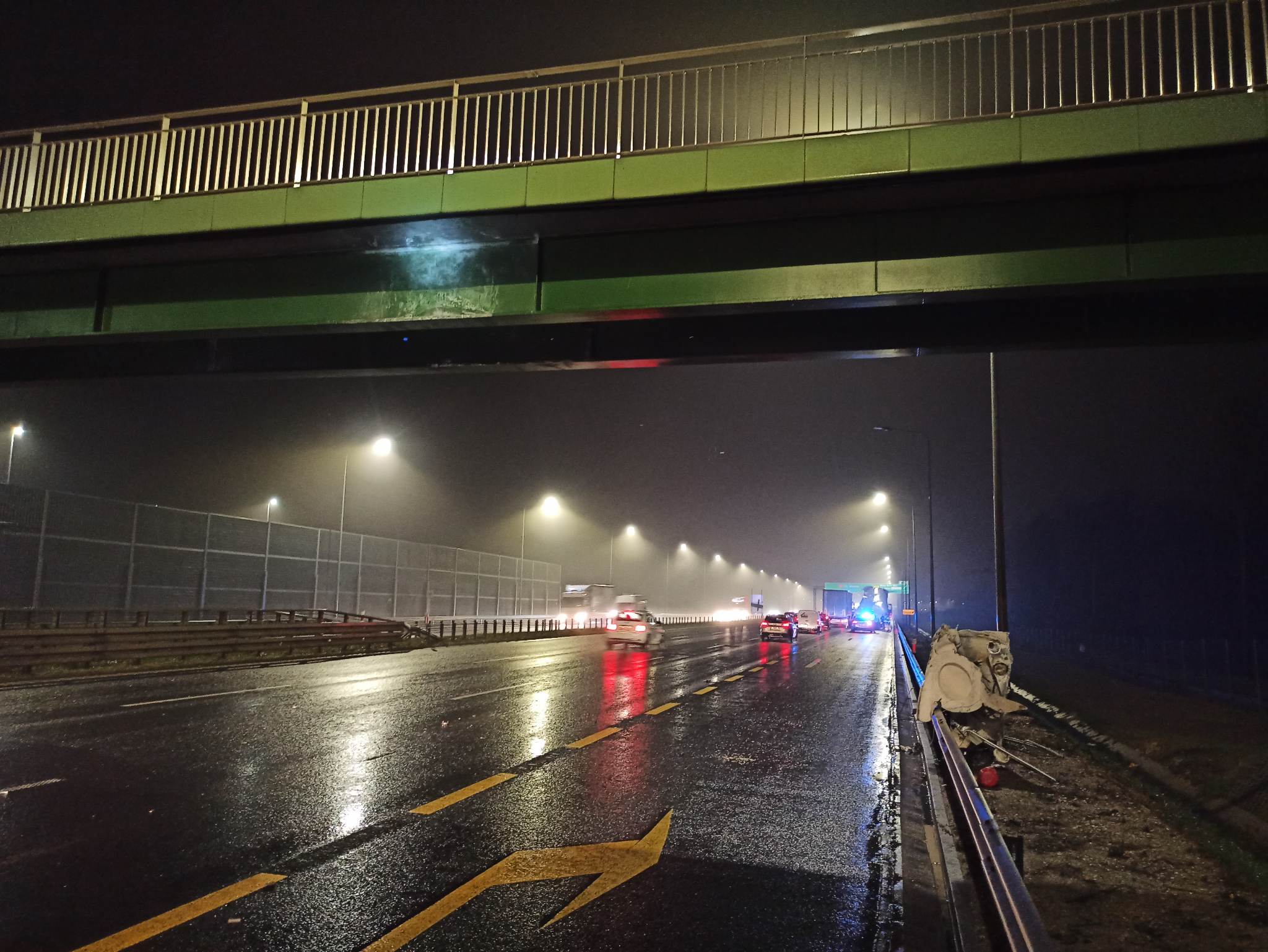 Około godziny 19:30 do Stanowiska Kierowania Komendanta Powiatowego PSP w Wołominie wpłynęło zgłoszenie o zderzeniu naczepy samochodu ciężarowego z elementem wiaduktu. Po dojeździe na miejsce wołomińskich strażaków potwierdzono zdarzenie. Samochód ciężarowy stał na pasie zjazdowym na Zielonkę, ok 100 metrów od kładki w którą uderzył podniesiony silos. Część zbiornika, która oderwała się po uderzeniu znajdowała się na poboczu. Działania strażaków polegały na zabezpieczaniu miejsca zdarzenia do czasu przybycia służby drogowej.