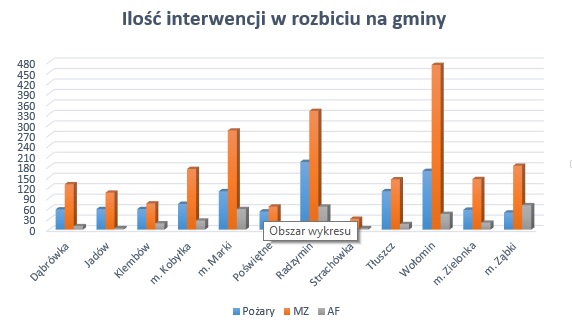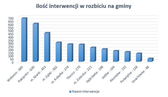Największa ilość interwencji miała miejsce na terenie gminy Wołomin. Na drugim miejscu uplasowała się gmina Radzymin. Trzecia ilość interwencji to miasto Marki. Najspokojniejszą gminą w powiecie wołomińskim w 2024 roku była Strachówka.