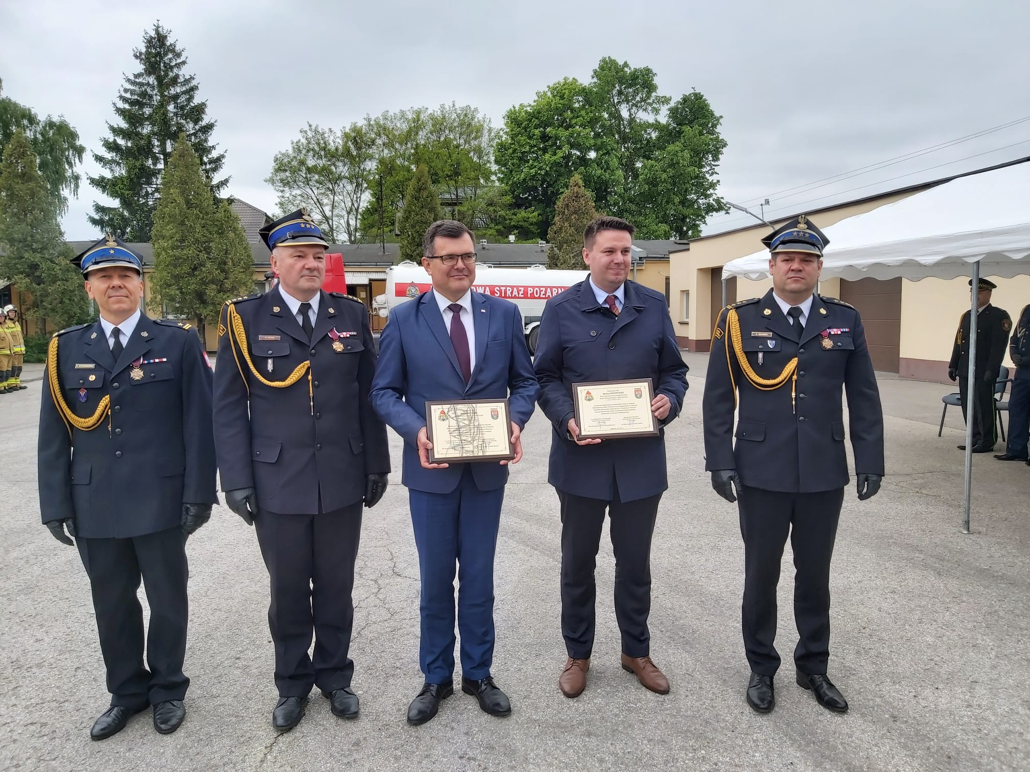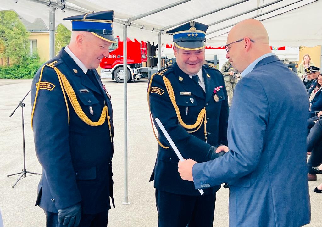 Komendant Powiatowy PSP w Wołominie st. bryg. Wiesław Drosio wręczył podziękowania za wsparcie i pomoc przy rozpoczęciu inwestycji po nazwą „Budowa JRG nr 2 z siedzibą w Tłuszczu w ramach programu modernizacji PSP na lata 2022 – 2025 Panom: