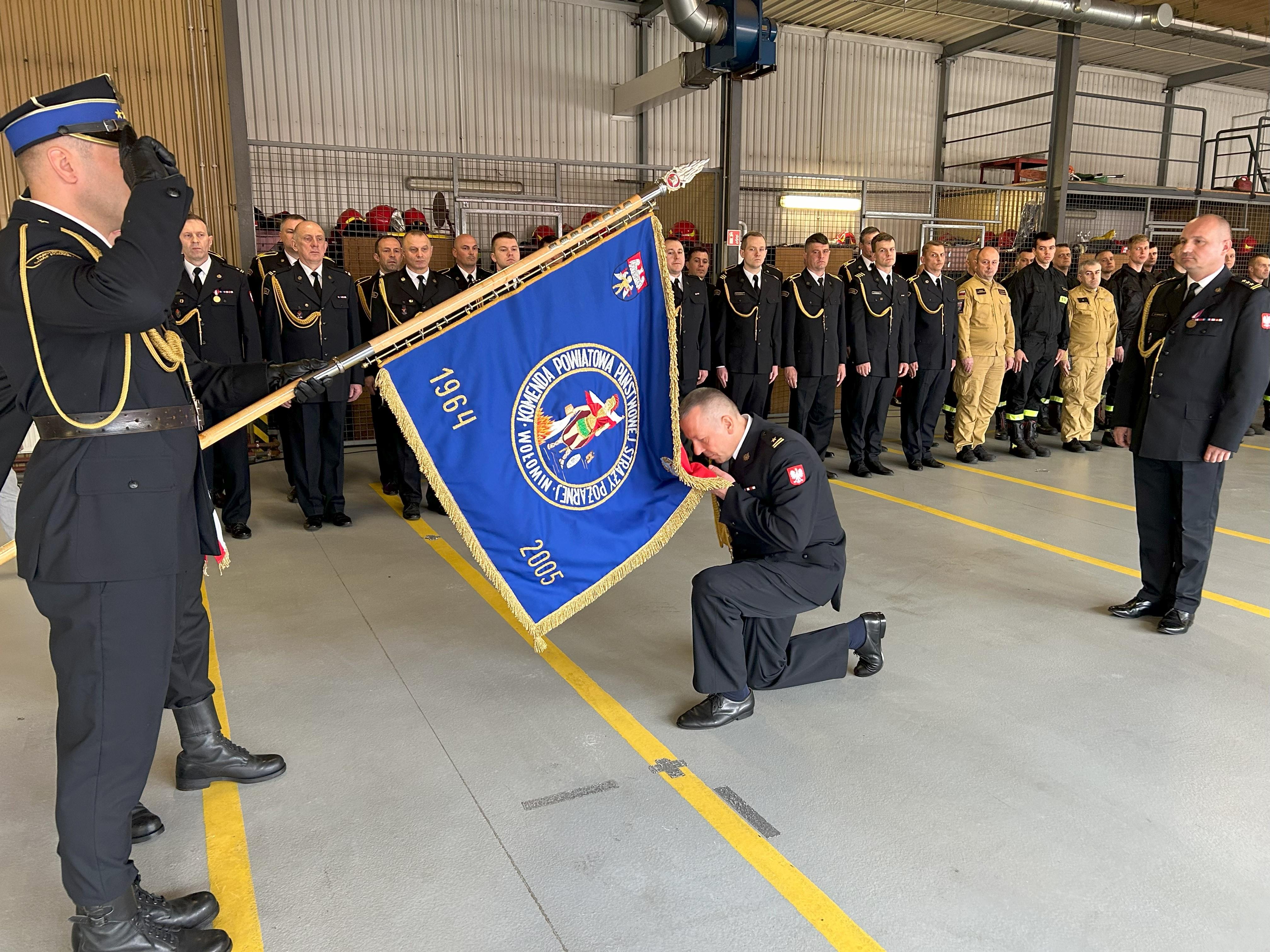 Punktem kulminacyjnym było odczytanie aktu powołania nowego komendanta, który symbolicznie przywitał się ze sztandarem Komendy Powiatowej PSP w Wołominie, a następnie złożył meldunek o przyjęciu obowiązków.